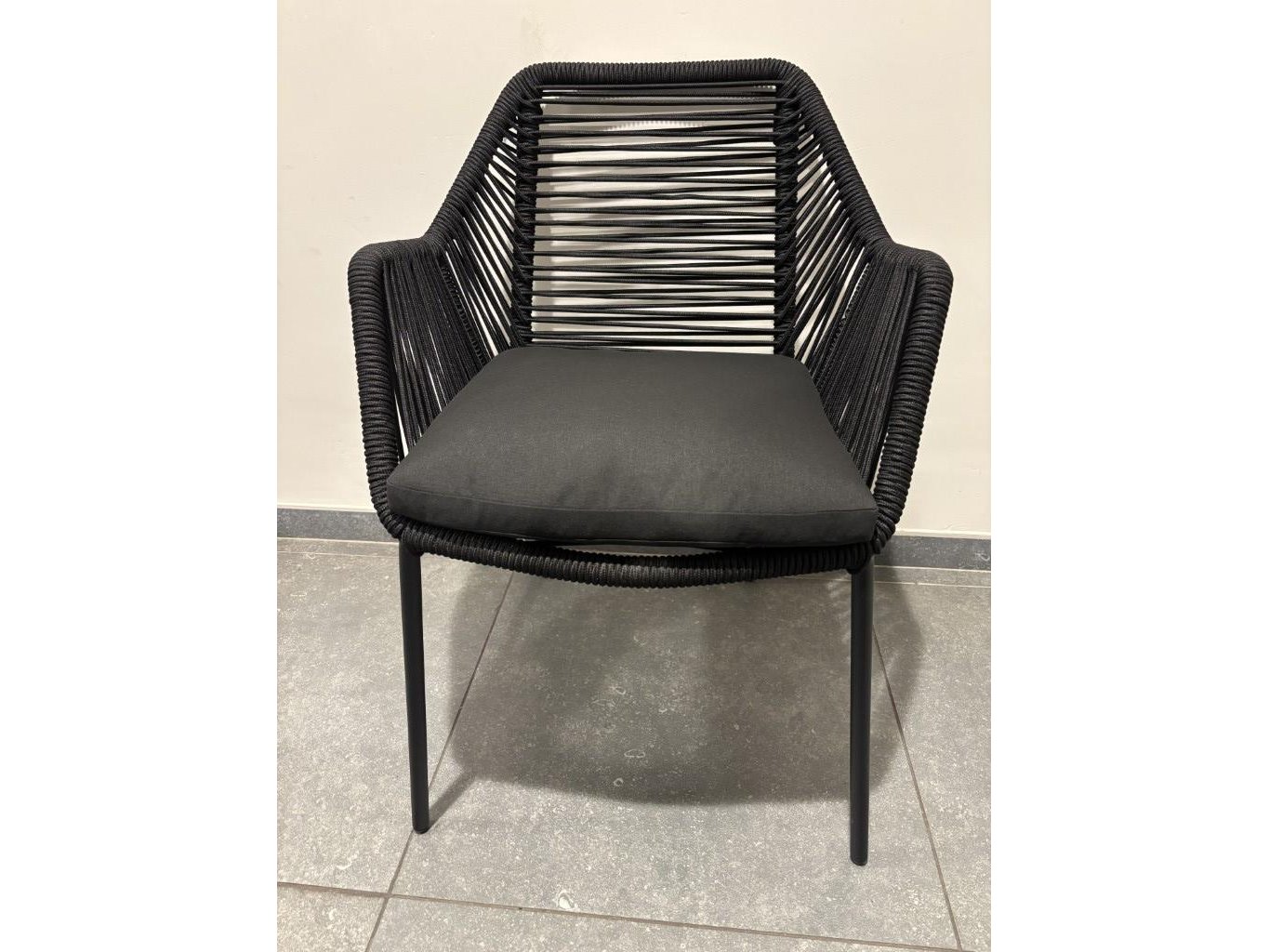 Stapelbare terrasstoel met armleuning, voorzien van een afneembaar en comfortabel zwart kussen. Dankzij het lichtgewicht metalen frame, afgewerkt in antraciet, en de strakke touwstructuur oogt de stoel luchtig en modern. De schuine rugleuning en armsteunen zorgen voor een aangename zitervaring.<br /> <br /> Strak zwart metalen frame met touwafwerking<br /> <br /> Inclusief zwart zitkussen in waterafstotende stof<br /> <br /> Stapelbaar en dus plaatsbesparend<br /> <br /> Normale hoogte (+- 47 cm)
