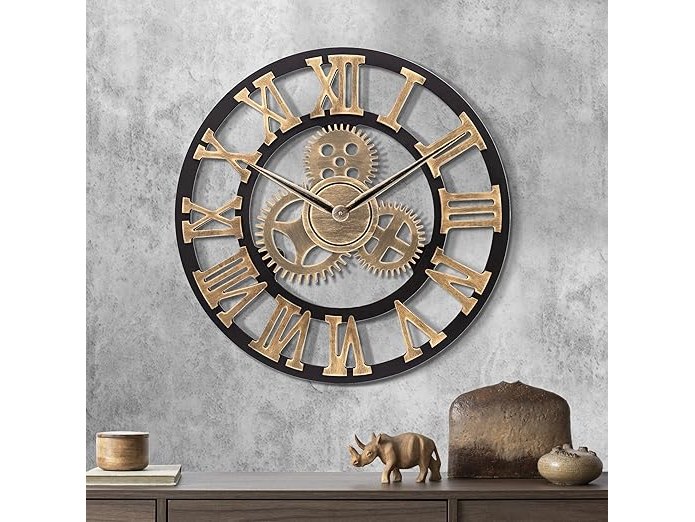 Ongebruikt, getest en werkend, ok, Lafocuse Stille Retro Houten Goud Industriele Grote Wandklok met Tandwielen 58 cm Vintage Rond Romeinse Cijfers Muurklok voor Woonkamer Slaapkamer Bar, B08GX4C8J9