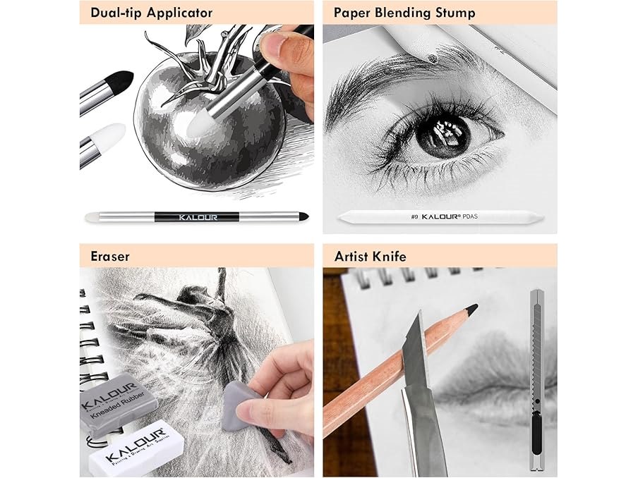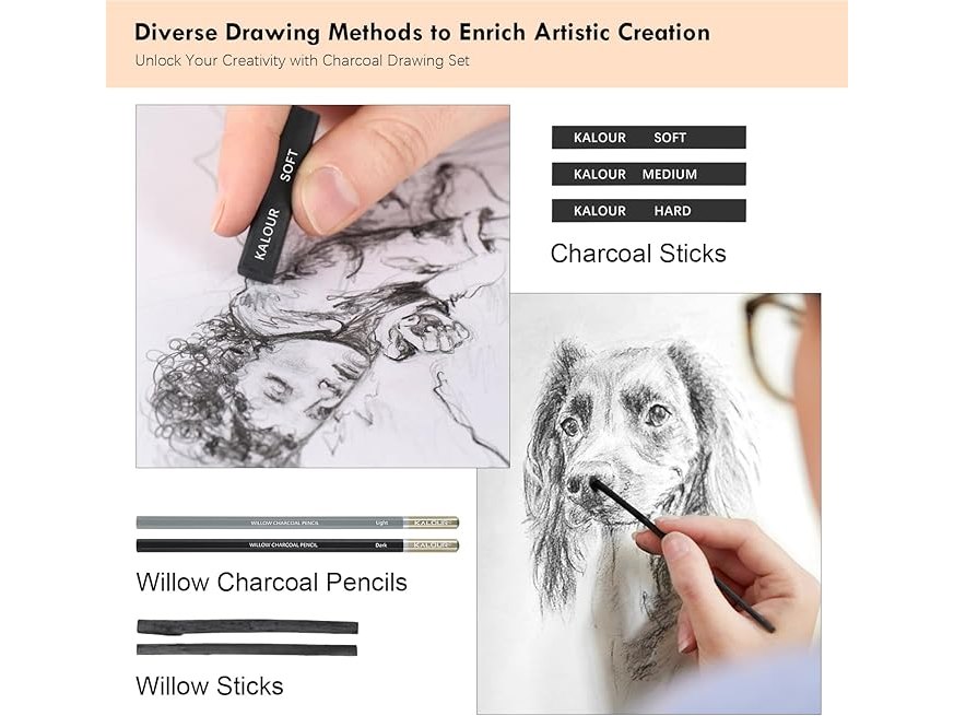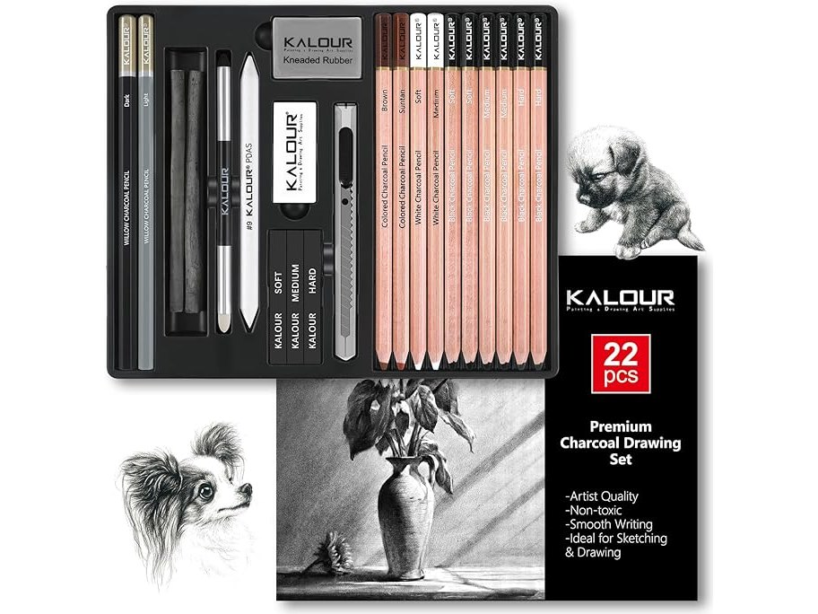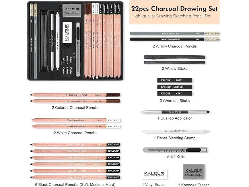 Ongebruikt, ok, KALOUR PDAS Houtskool Tekenset, 22-delig, Professionele Tekenbenodigdheden, Zwart-witte Houtskoolpotloden voor Tekenen, Schetsen, Schaduwen, Mengen, Tekenpotloden voor Beginners en Professionals, B0D9XJ46R2