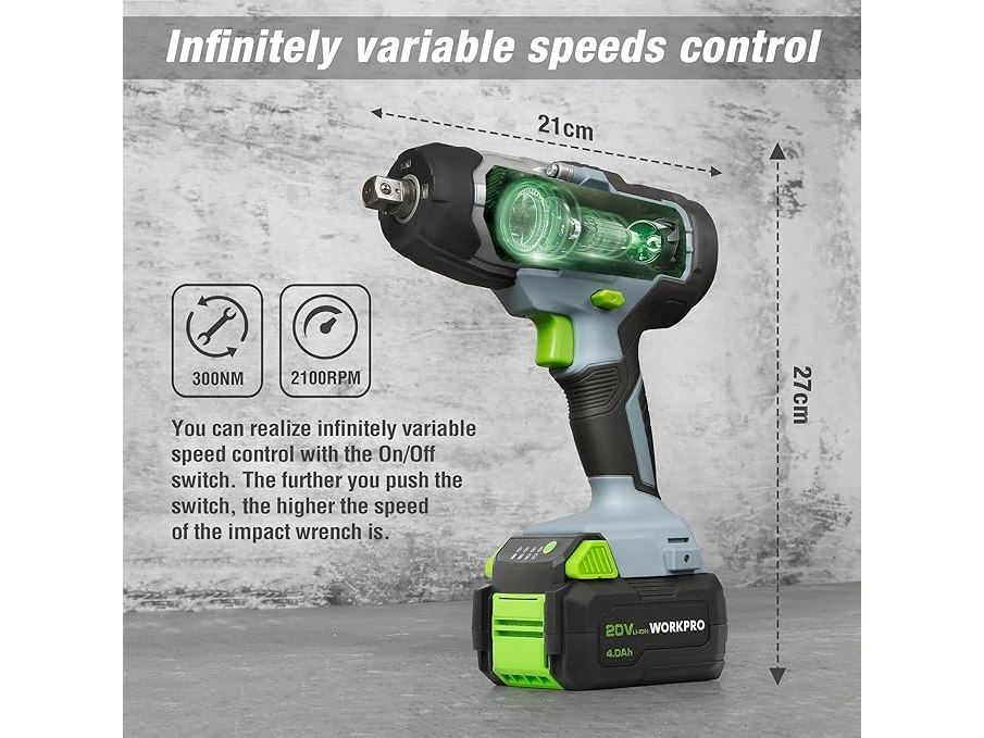Ongebruikt, getest en werkend, volledig, ok, WORKPRO Accu-slagschroevendraaier, 20 V, 1/2 inch vierkante aansluiting, koppel 300 Nm, variabele snelheid, LED-verlichting, met 4,0 Ah accu en lader,B08CTWN4RL
