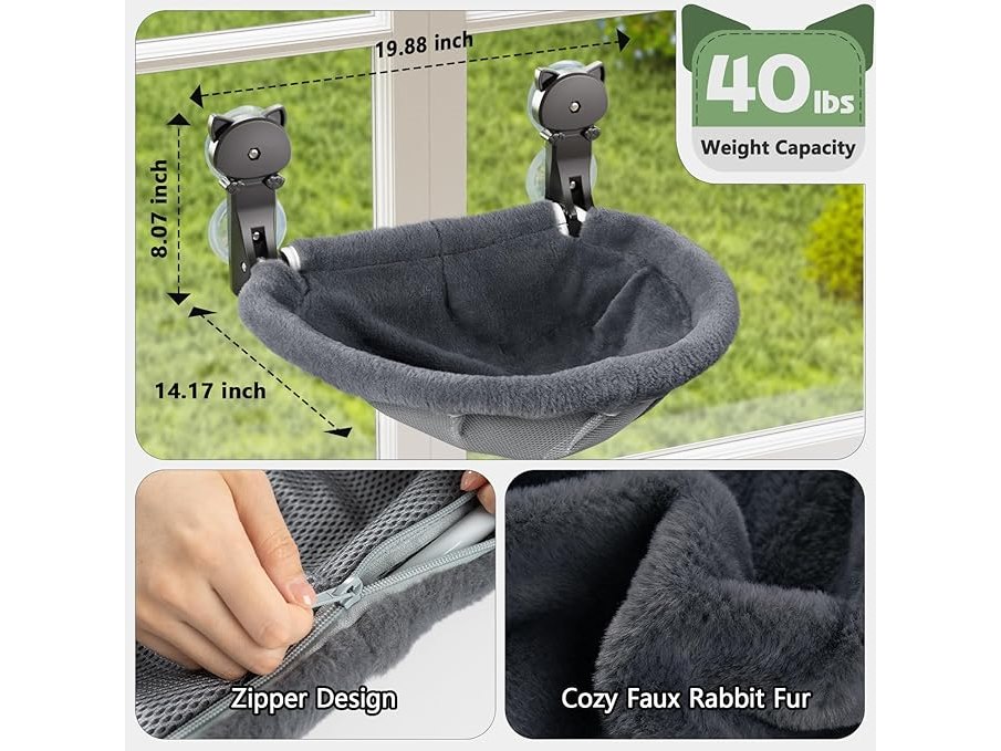 Ongebruikt, volledig, originele verpakking ontbreekt,ok, JUNSPOW Kattenraamzitje, draadloos, opvouwbaar en stabiel kattenbed - Ademende kattenhangmat voor aan het raam om te kijken, te zonnebaden en te klimmen - Maximaal draagvermogen tot 18 kg (grijs, imitatieleer),B0DGLSG42N