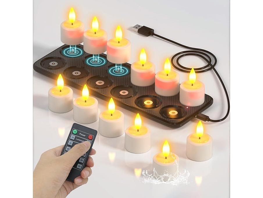Minieme gebruikssporen, getest en werkend, geen afstandsbediening, SoulBay Oplaadbare Theelichtjes, 12 stuks Waterdichte Batterij voor Buiten, Vlamloze Elektrische LED-kaarsen met Flikkerend Effect en Afstandsbediening met Timer en Oplaadstation voor Badkamer, Tuin, Huis, Woonkamer, Halloween, B0D31JKHLR