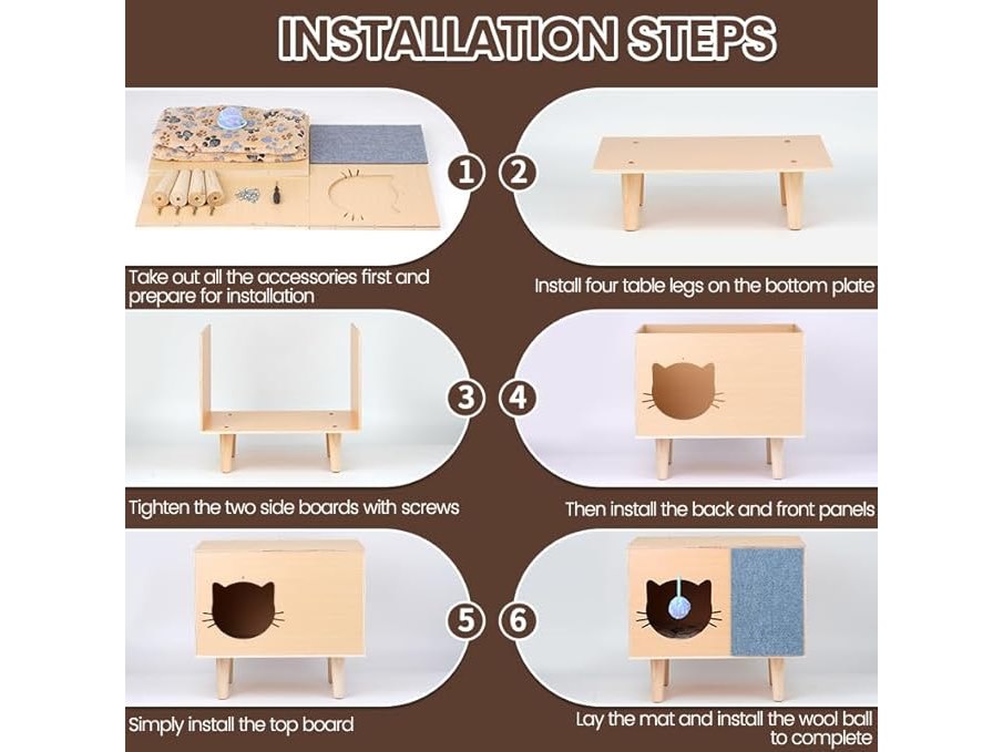 Ongeopend, in seal, Houten kattenhuisje, binnenverblijf voor katten met bel, krabmat en kattenkussen, kattenkastje voor hal en slaapkamer, eenvoudig te monteren, 50 x 40 x 32 cm, B0DRCRPCP9
