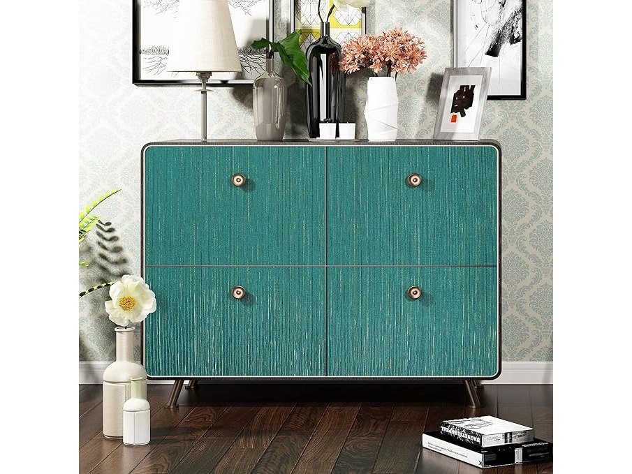Ongeopend, in seal, 5 x FunStick Zelfklevend Behang (40 cm x 6 m) - Linnen Textuur, Groen Goud, Modern Helder Wasbaar Patroon - Voor Woonkamer, Slaapkamer, Meubilair - Petrol Stof Film, B09JSMSZPY