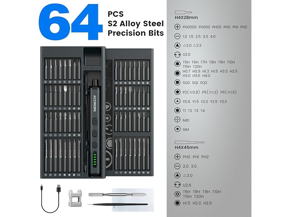 Ongebruikt, getest en werkend, volledig, ok, originele verpakking ontbreekt, Accwork 68 in 1 precisie elektrische schroevendraaier - Met 64 magnetische bits S2-5 snelheden - Magnetisch LED-display - Voor laptop, bril, horloges, B0DFGSPRKW