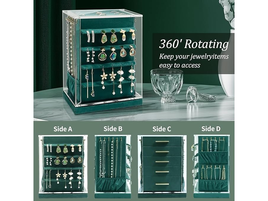 Ongeopend, KAMIER 360° draaibaar sieradendoosje met 5 schuifladen, sieradendoos en sieradenopslag voor halskettingen en oorbellen, elegante organizer, perfect opbergcadeau (groen) , B0DJ2RJ4ZH