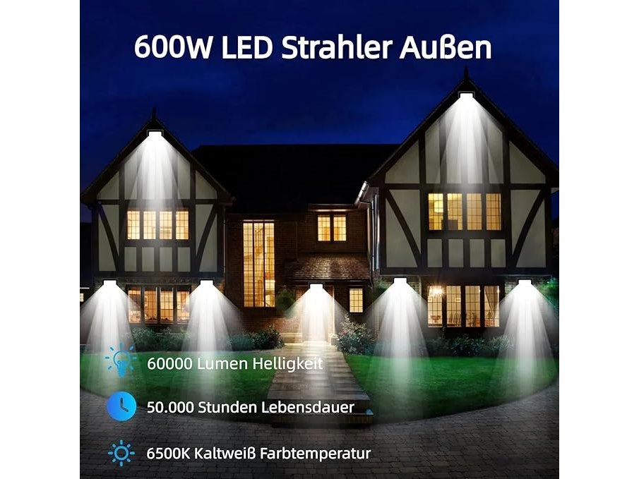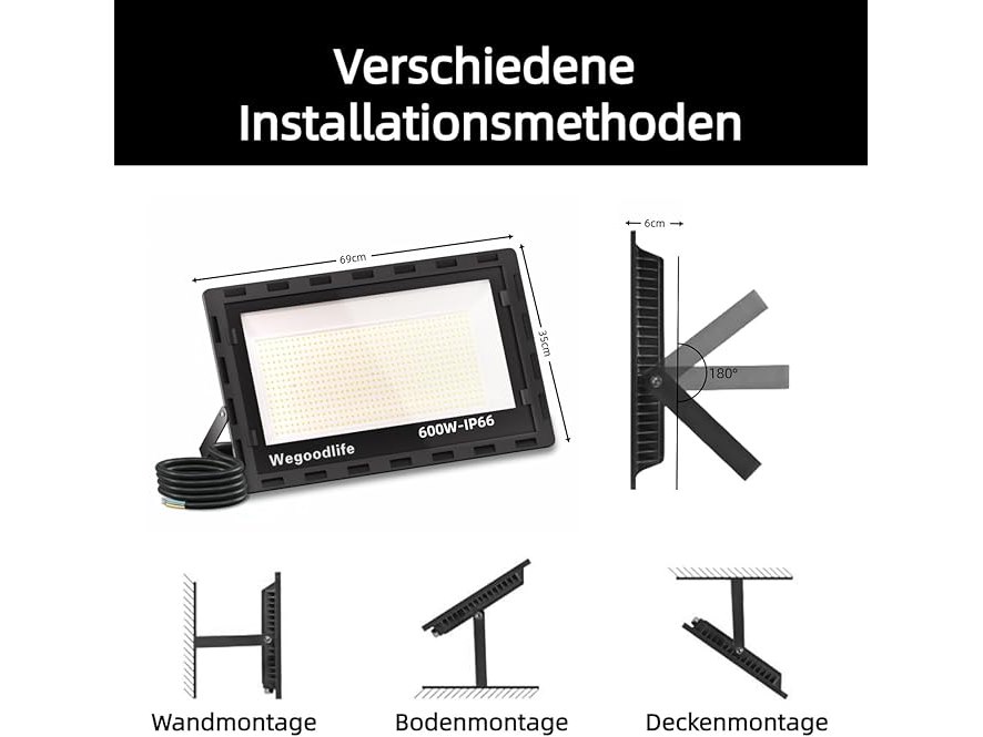 Ongebruikt, werkt, ok, Wegoodlife 600 W LED-schijnwerper voor buiten, superhelder 60.000 lumen, 6500 K koud wit, IP66 waterdicht, 50 cm kabel (zonder stekker), buitenlamp voor tuin, achtertuin, hal, B0DN5XVT12