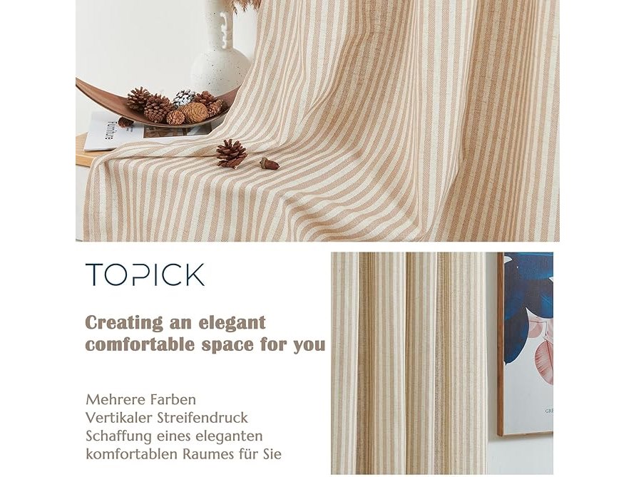 Ongeopend, set van 2 , TOPICK Linnen gordijnen gestreepte gordijnen met oogjes , beige linnenlook , half transparant , 130x145 bruin op beige , B09V53WQ2S