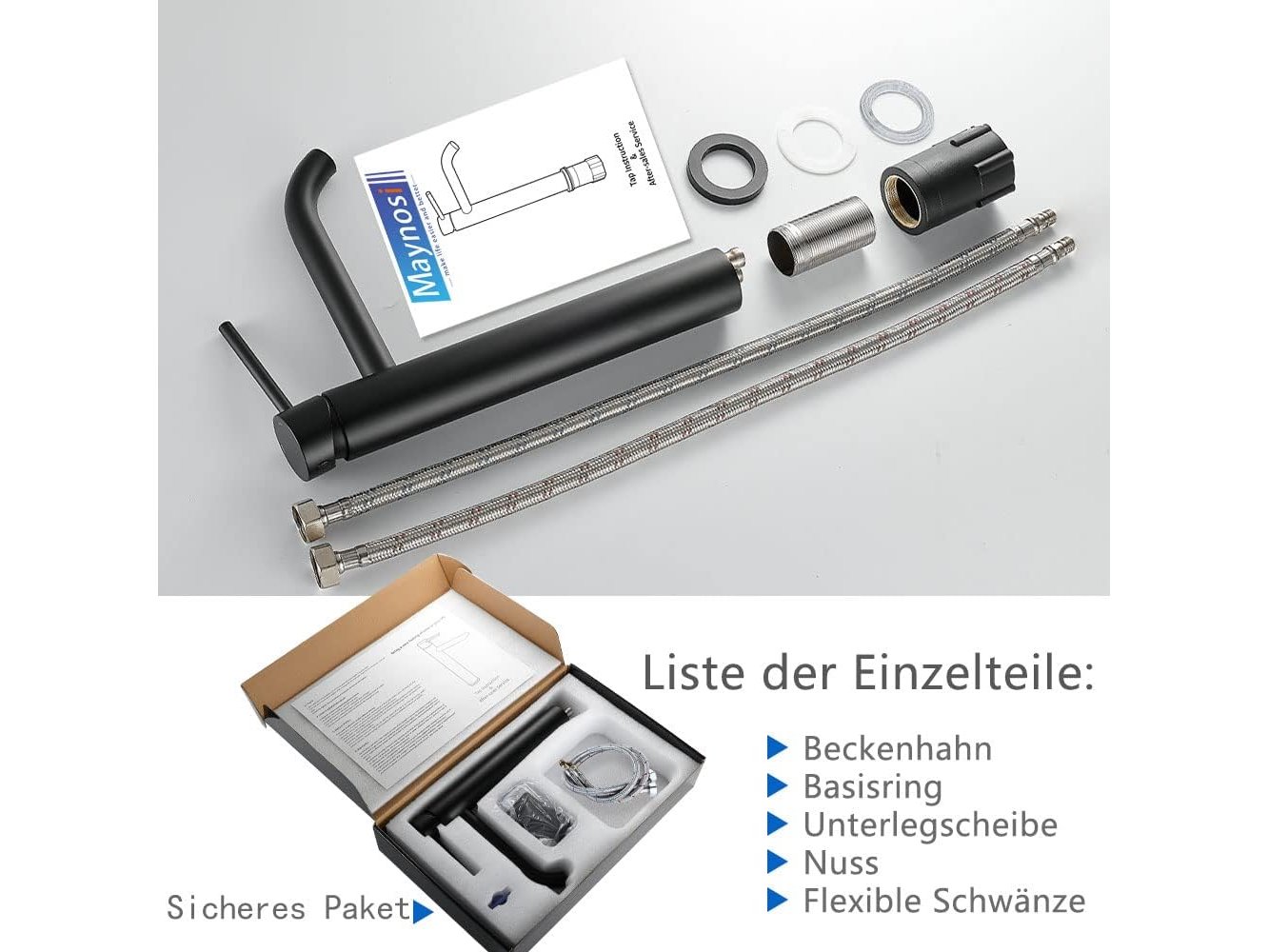 Ongeopend, in seal, Maynosi hoge wastafelkraan, armatuur met uitloop hoogte 195 mm, zonder afvoergarnituur, waterkraan badkamer met flexibele slangen, modern minimalistisch design, matzwart, matzwart, B0DKBFS7JR