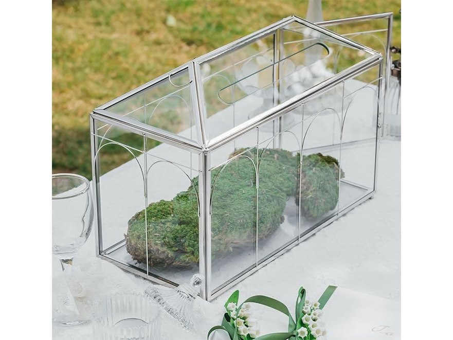 Ongebruikt, ok, NCYP Glazen kaartendoos met gleuf en slot voor bruiloftsreceptie, 32 x 15 x 23 cm, vintage grote geometrische terrariumdoos, Wishwell feesttafeldecoratie, zilver (alleen de glazen doos), B0BTYP9YJ7
