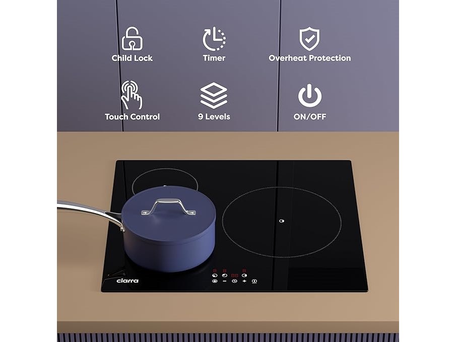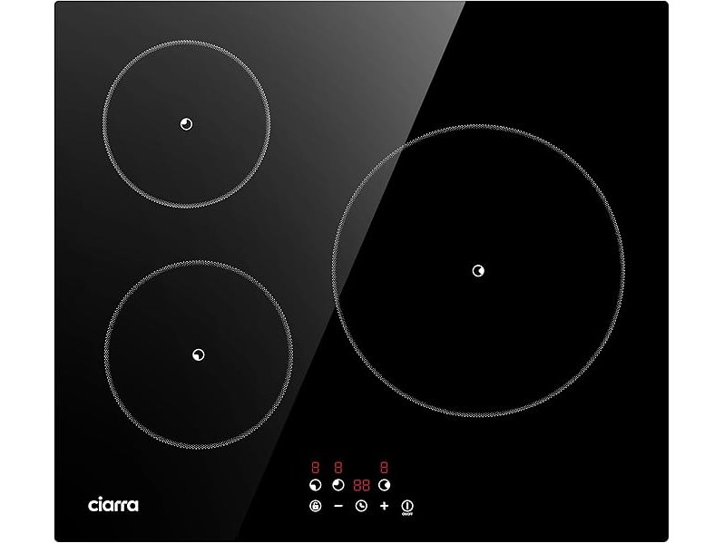 Minieme gebruikssporen, getest en werkend, volledig, ok, CIARRA Inductiekookplaat, 3 platen, 5600 W, kookplaat, 9 standen, touch-bediening, timer van 99 minuten, glas, zwart, CABBIH3-F, B0DR21NY2W