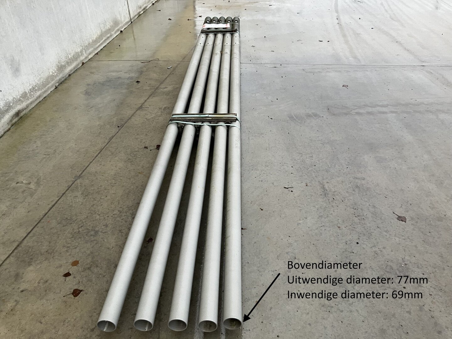 Onderdiameter: uitwendig 120mm - inwendig 95mm / Bovendiameter: uitwendig 77mm - inwendig 69mm - Geschikt voor diverse toepassingen (constructie, hergebruik, projectmatig gebruik). Gebruikssporen aanwezig maar nog sterke, bruikbare palen<br /> Gebruikt