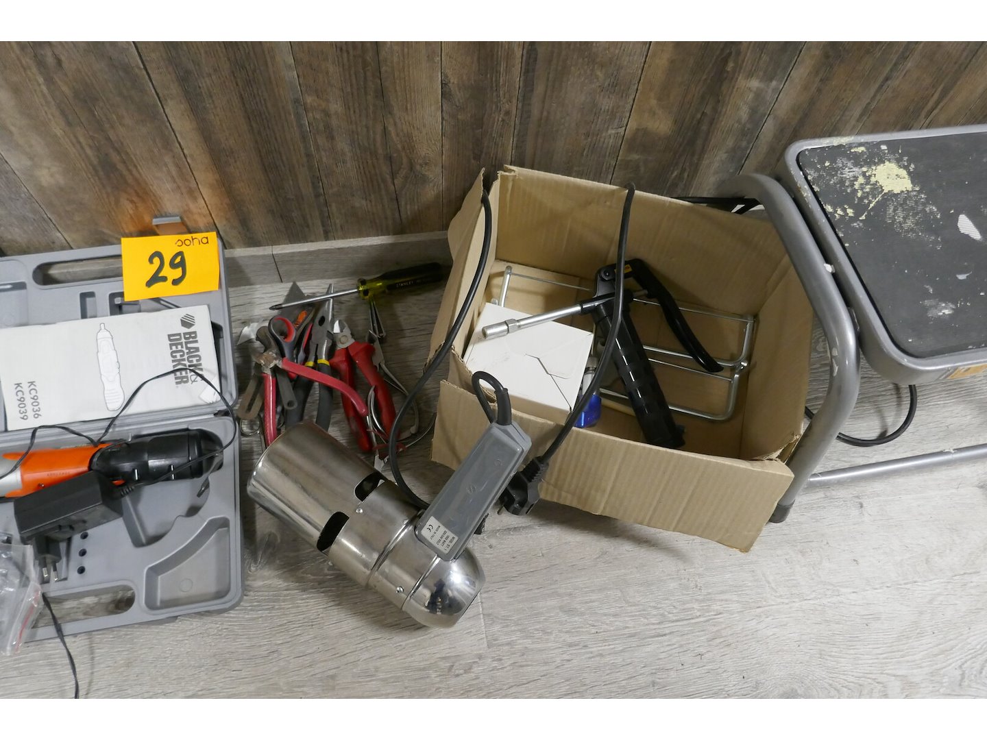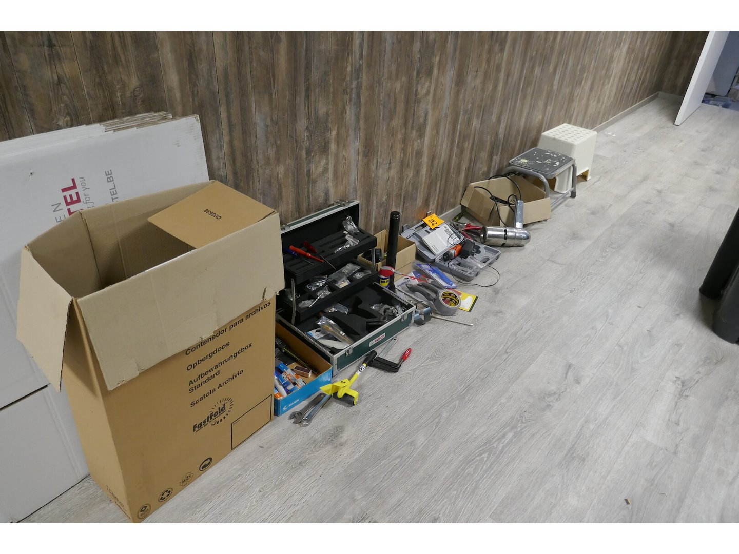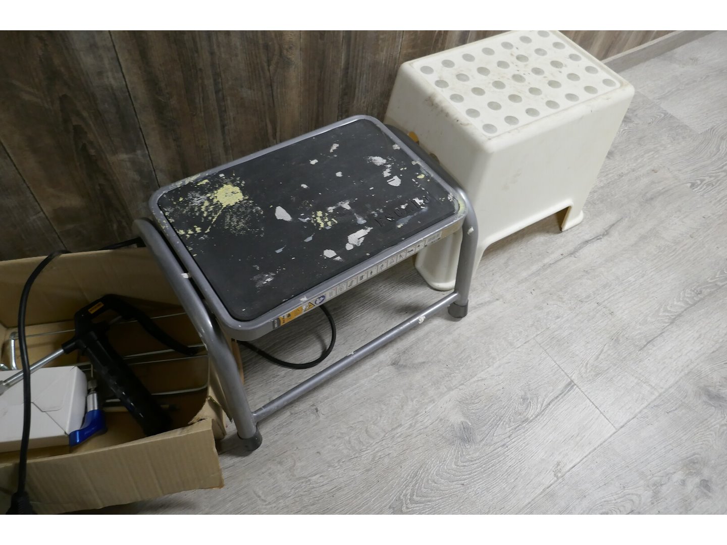 2 opstapjes - opbergdozen - werkgereedschap - digitale schuifmaat - gereedschapskoffer - klokboren - schroefmachine - enz…