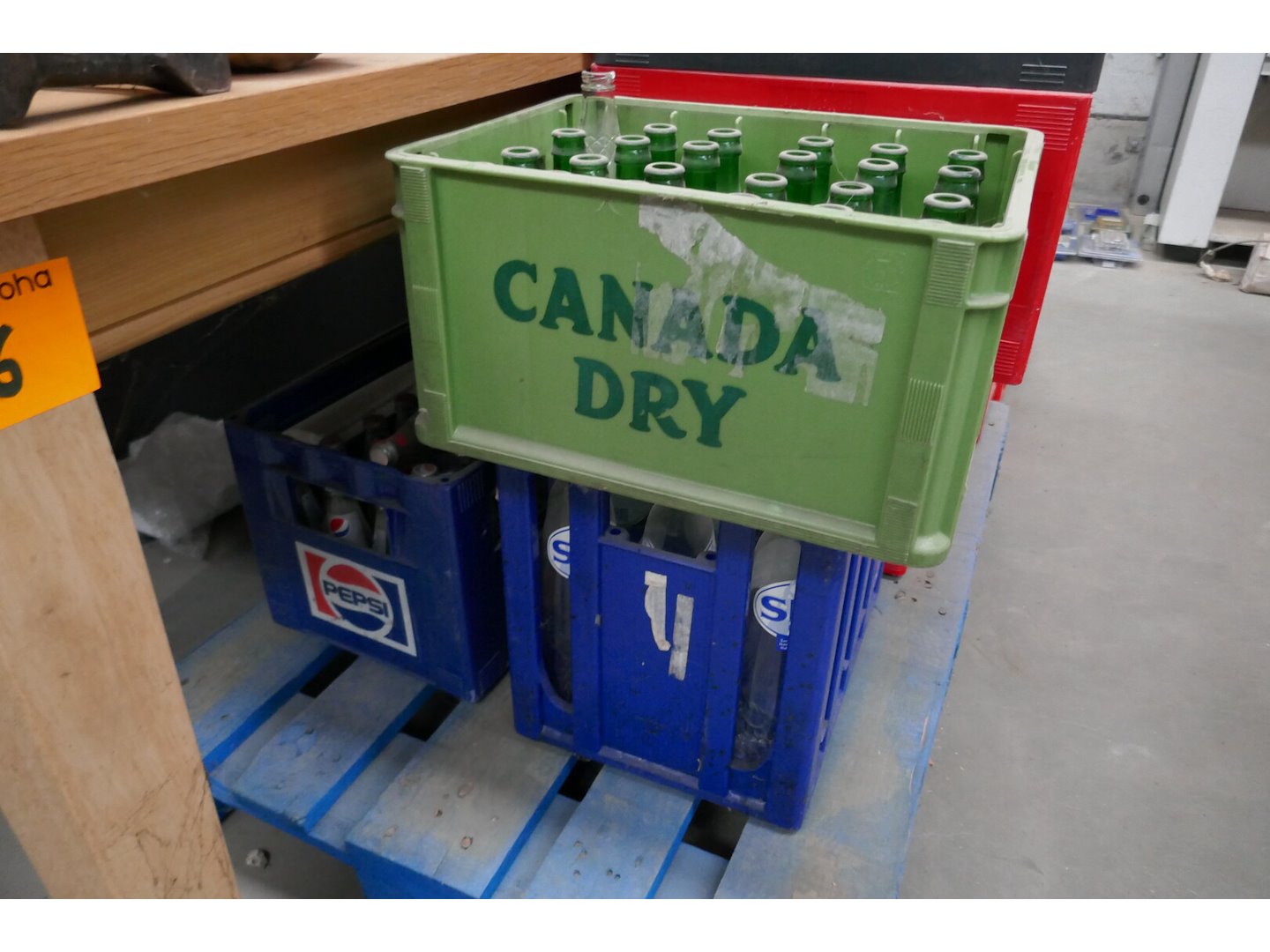 Houten palet + bakken leeggoed - ongeveer 14 stuks