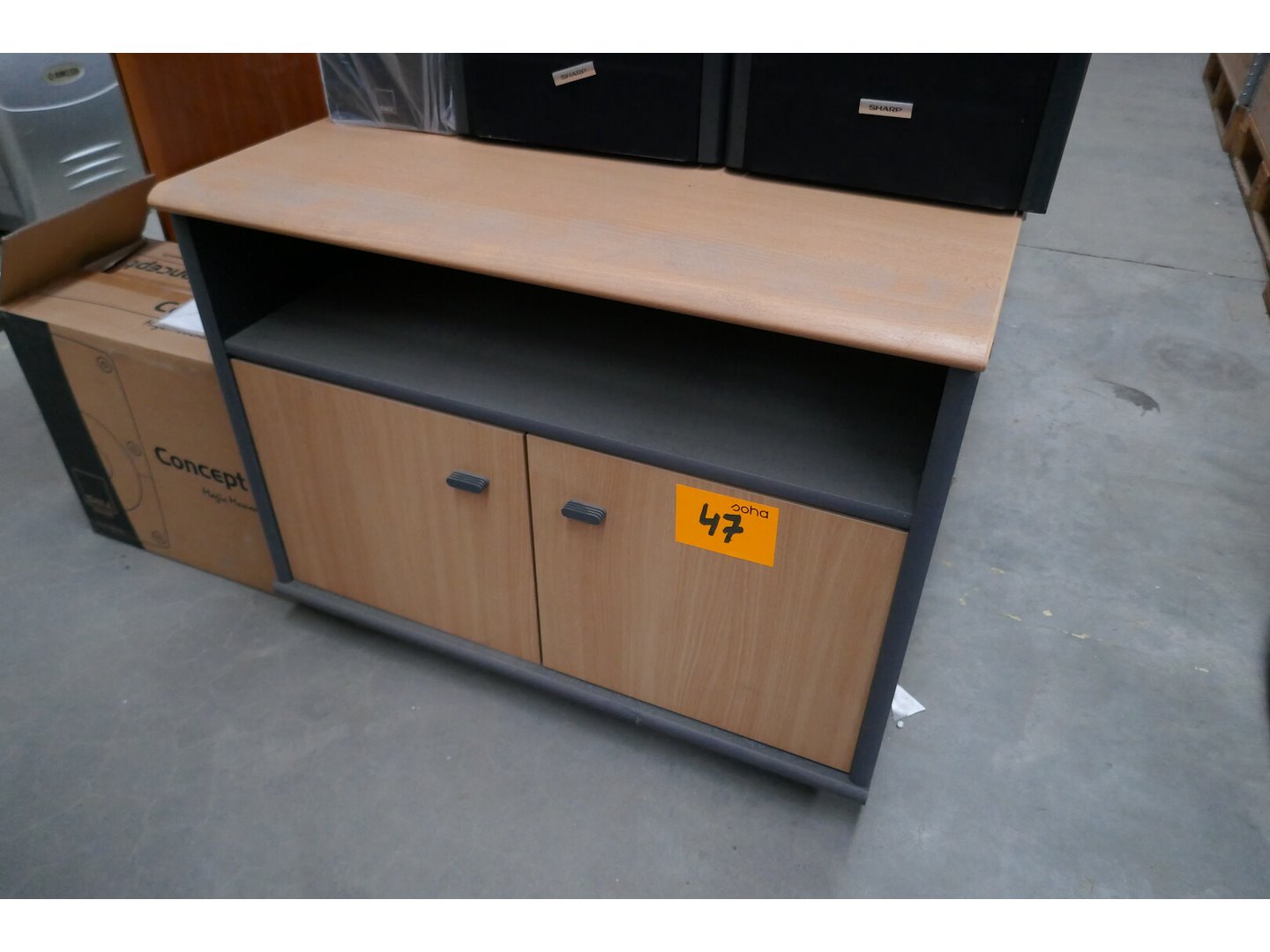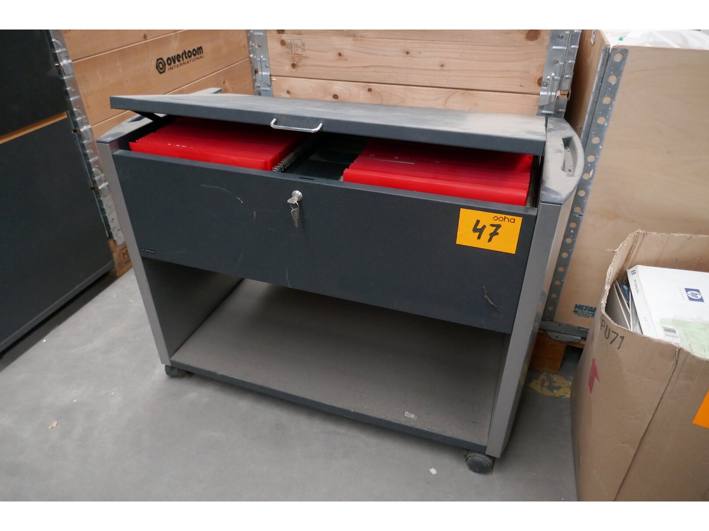 Mobiele metalen klasseerkast + doos met kaften en papier + verrijdbaar TV kast