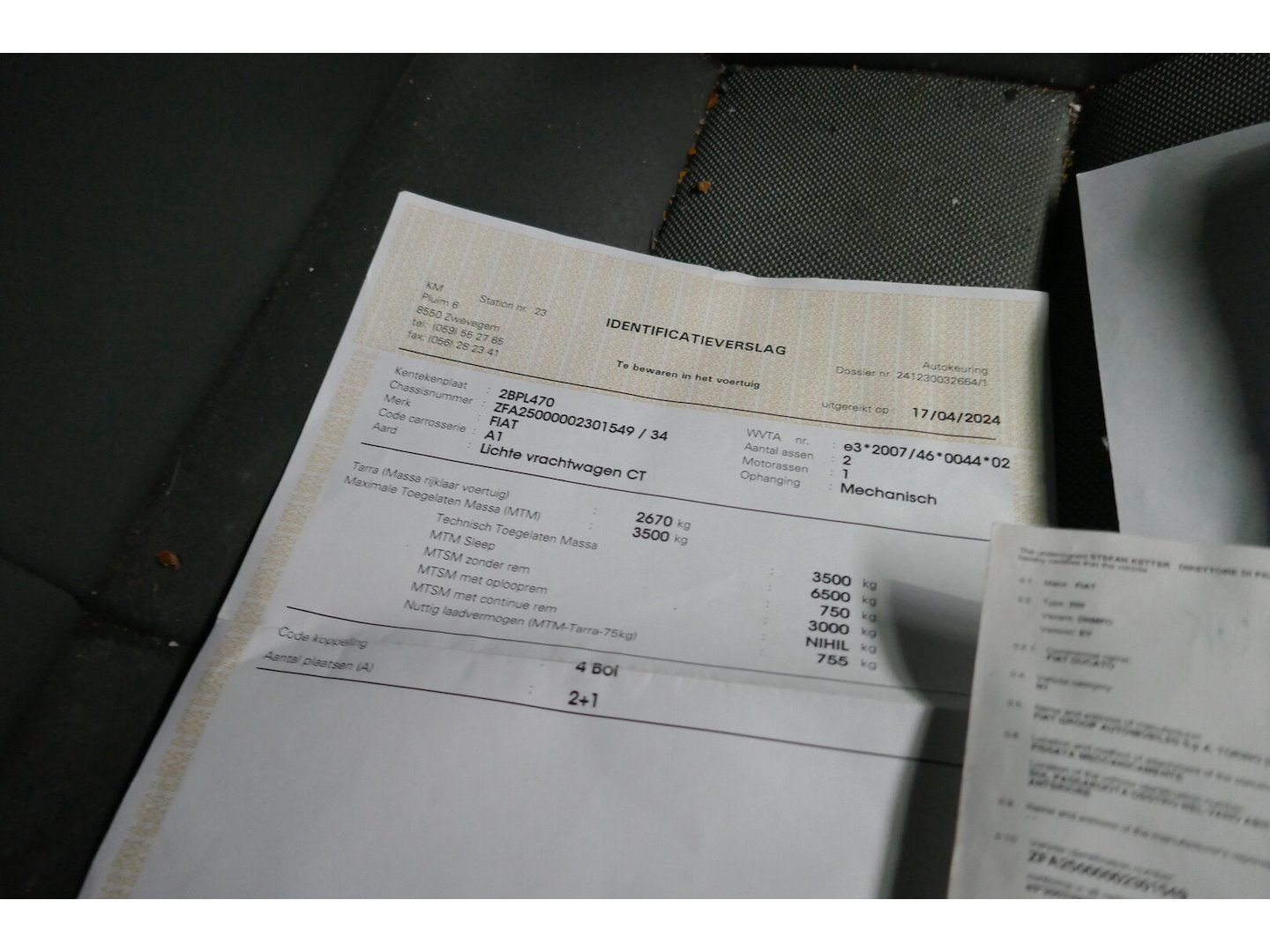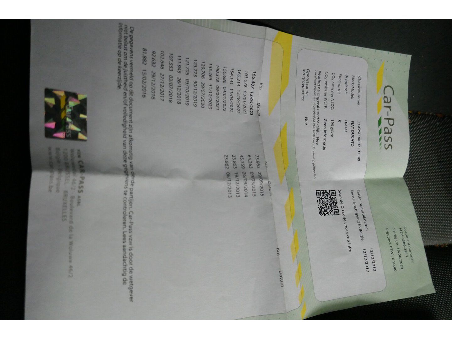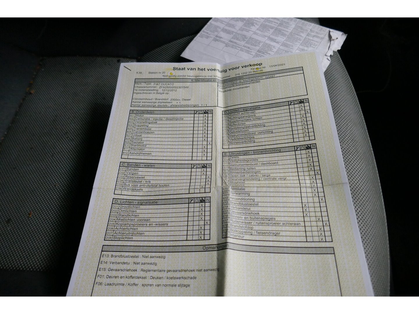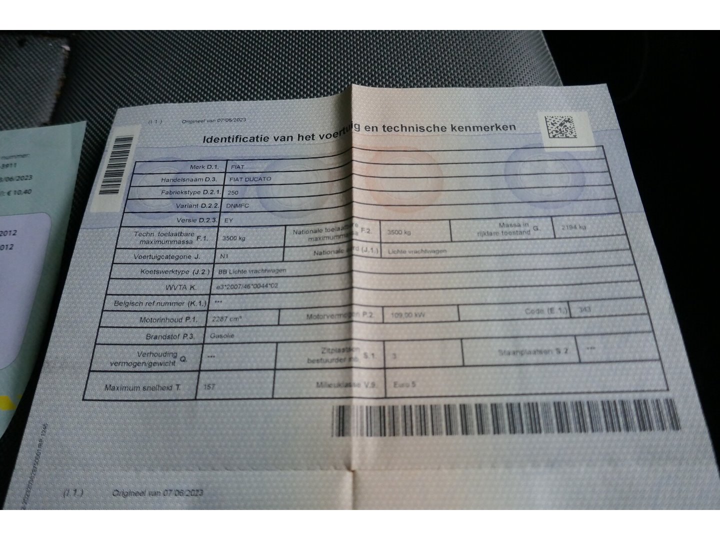 Aard : lichte vrachtwagen<br /> Merk: FIAT<br /> Model: Ducato 150 Multijet<br /> Chassis: ZFA 250 000 02 301 549<br /> 1e inschrijving: 12-12-2012<br /> Km: 256.527 km op teller<br /> Motor: 2287 cm³ - 109 kW - gasolie - euro 5 <br /> Uitvoering: verhoogd dak, zijschuifdeur, tussenwand, wandbekleding, trekhaak.<br /> zitplaatsen : 2+ 1<br /> HTG = 3500 kg - sleep 6500 kg - laadvermogen 755 kg<br /> Documenten: OK<br /> Sleutel(s): 1<br /> ref. 2768