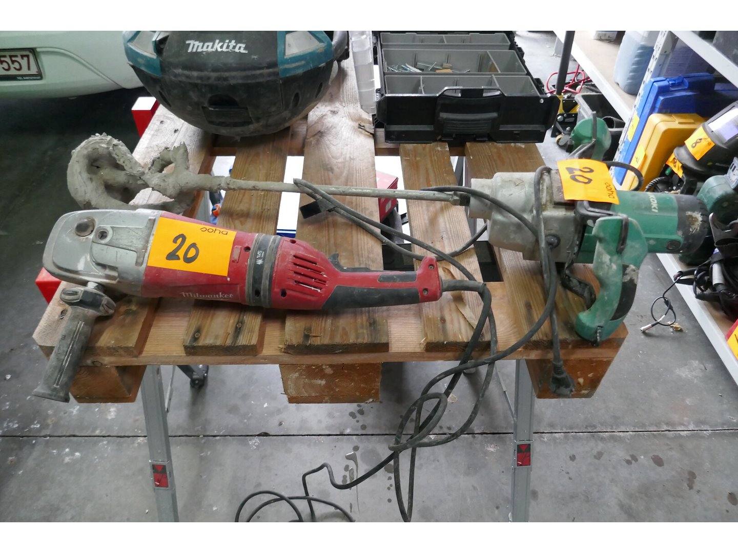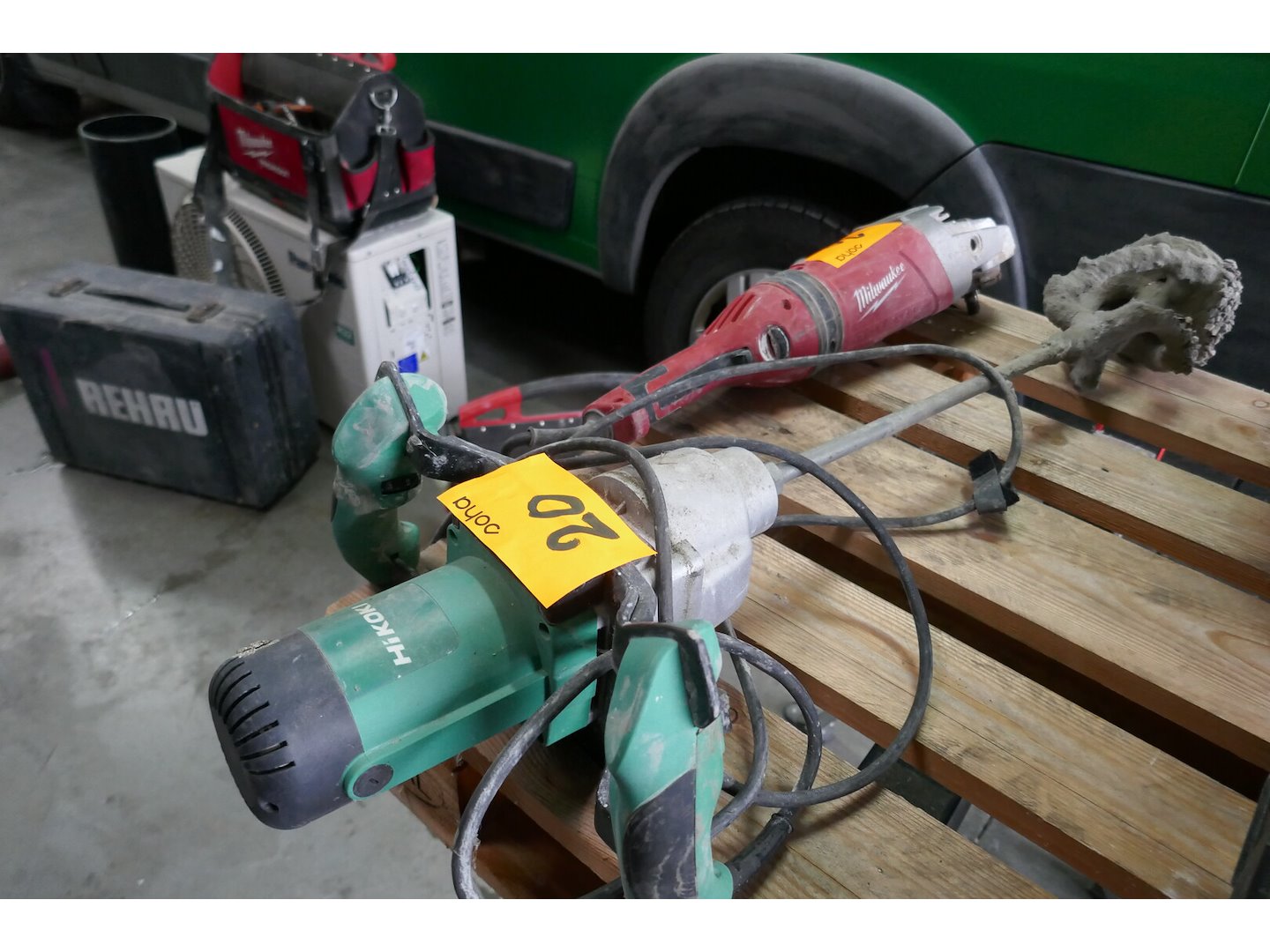 Elektrsiche haakse slijper<br /> *merk : MILWAUKEE<br /> *model : agv 26-230 ge<br /> Elektrische mortelmixer<br /> *merk : HIKOKI