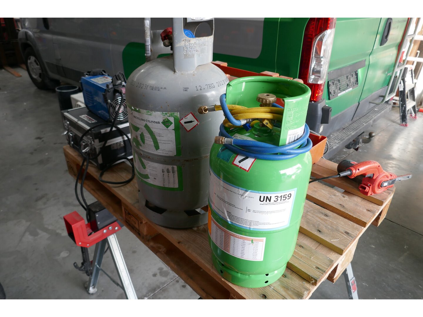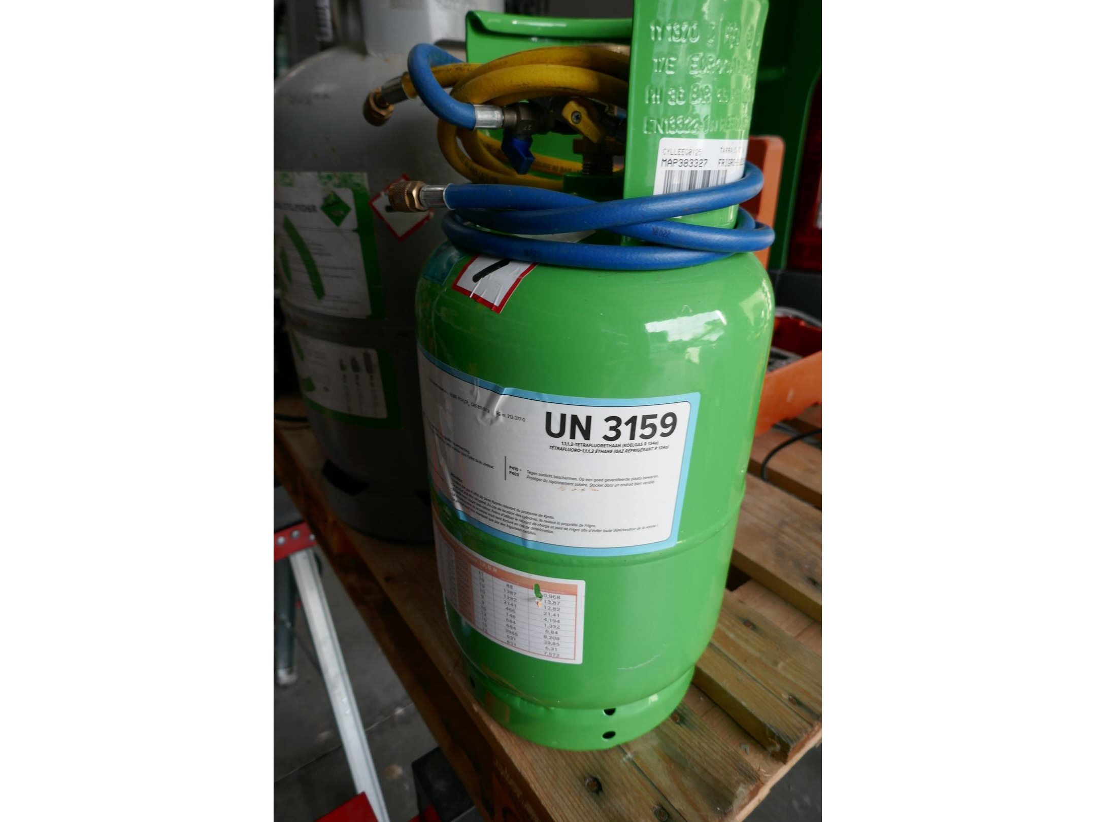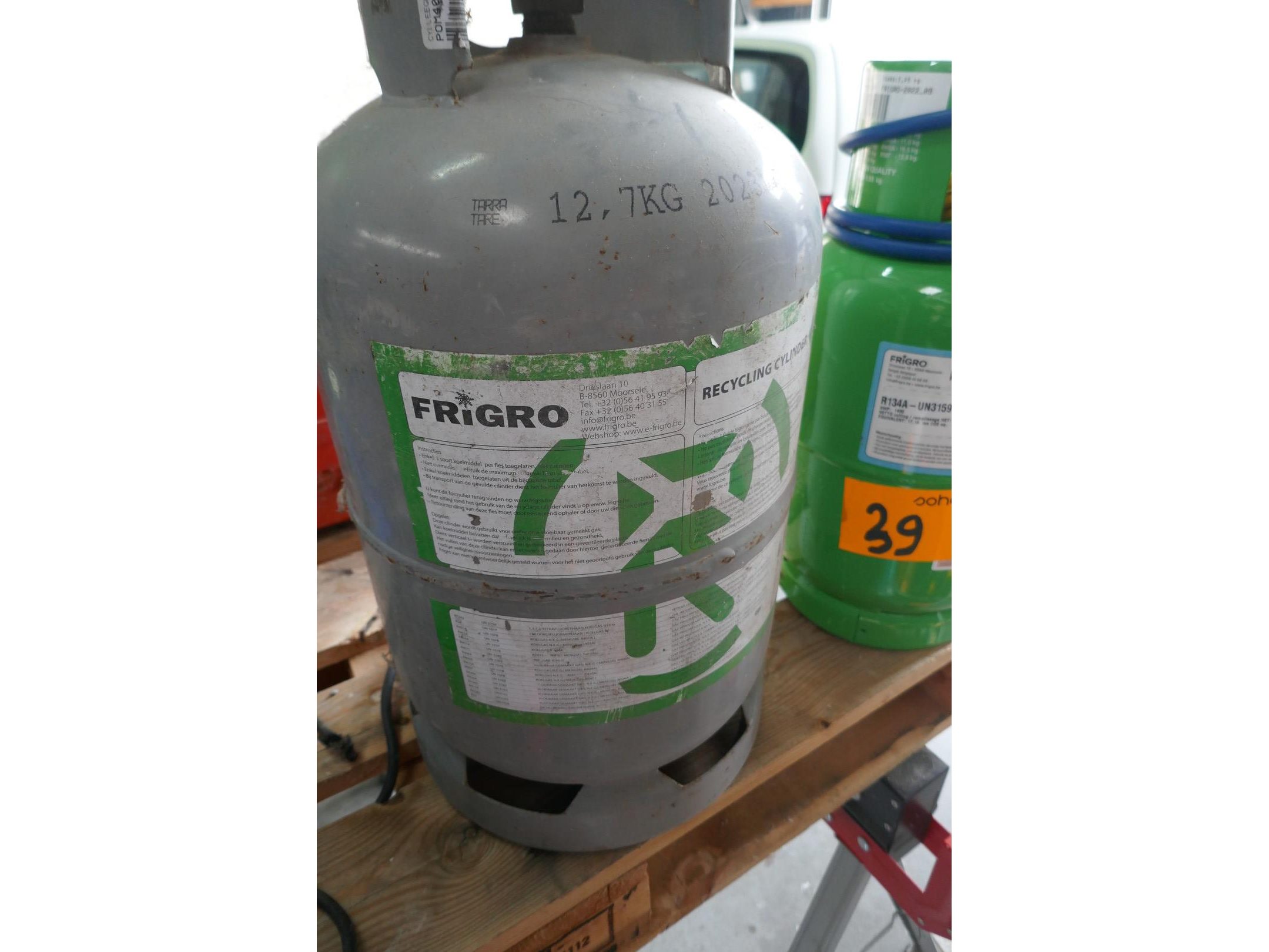 Fles koelmiddel R134a - UN3159 ( volle fles aankoopprijs 1200€ ) <br /> *merk : FRIGRO<br /> Fles koelmiddel ( fles is bijna leeg ) <br /> *merk : FRIGRO