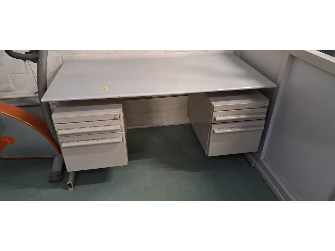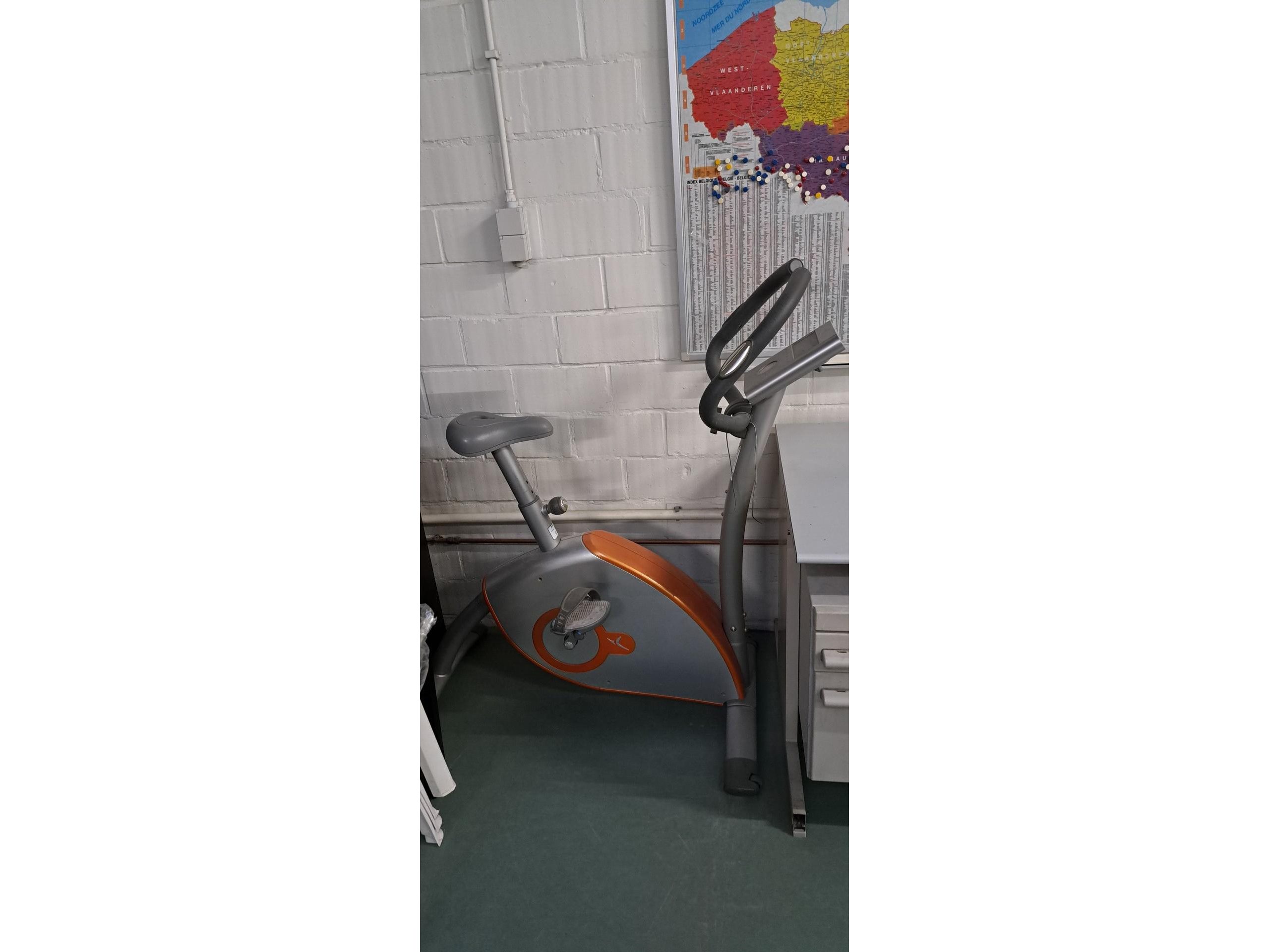 2 ijzeren bureau's en een landkaart postzones op glas, fiets