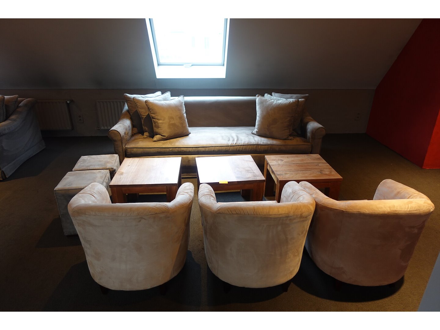 Vv: 3-zit zetel , 3x kuipstoel, 3x salontafel, 2x poef <br /> locatie: zaal boven