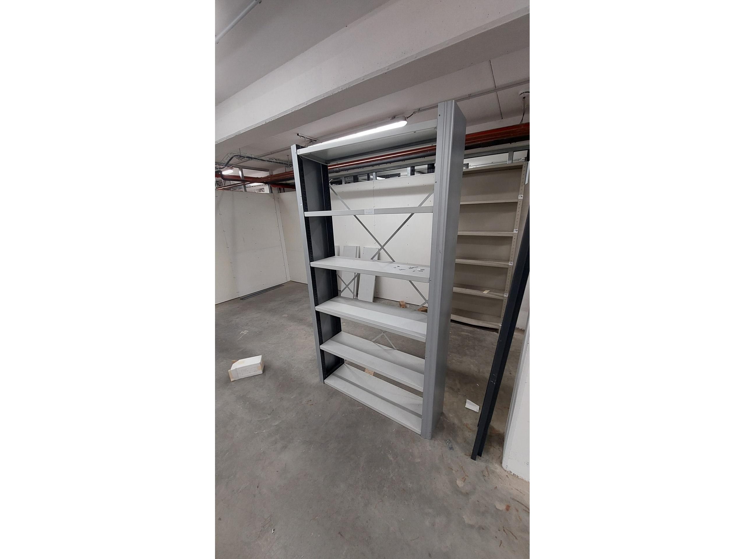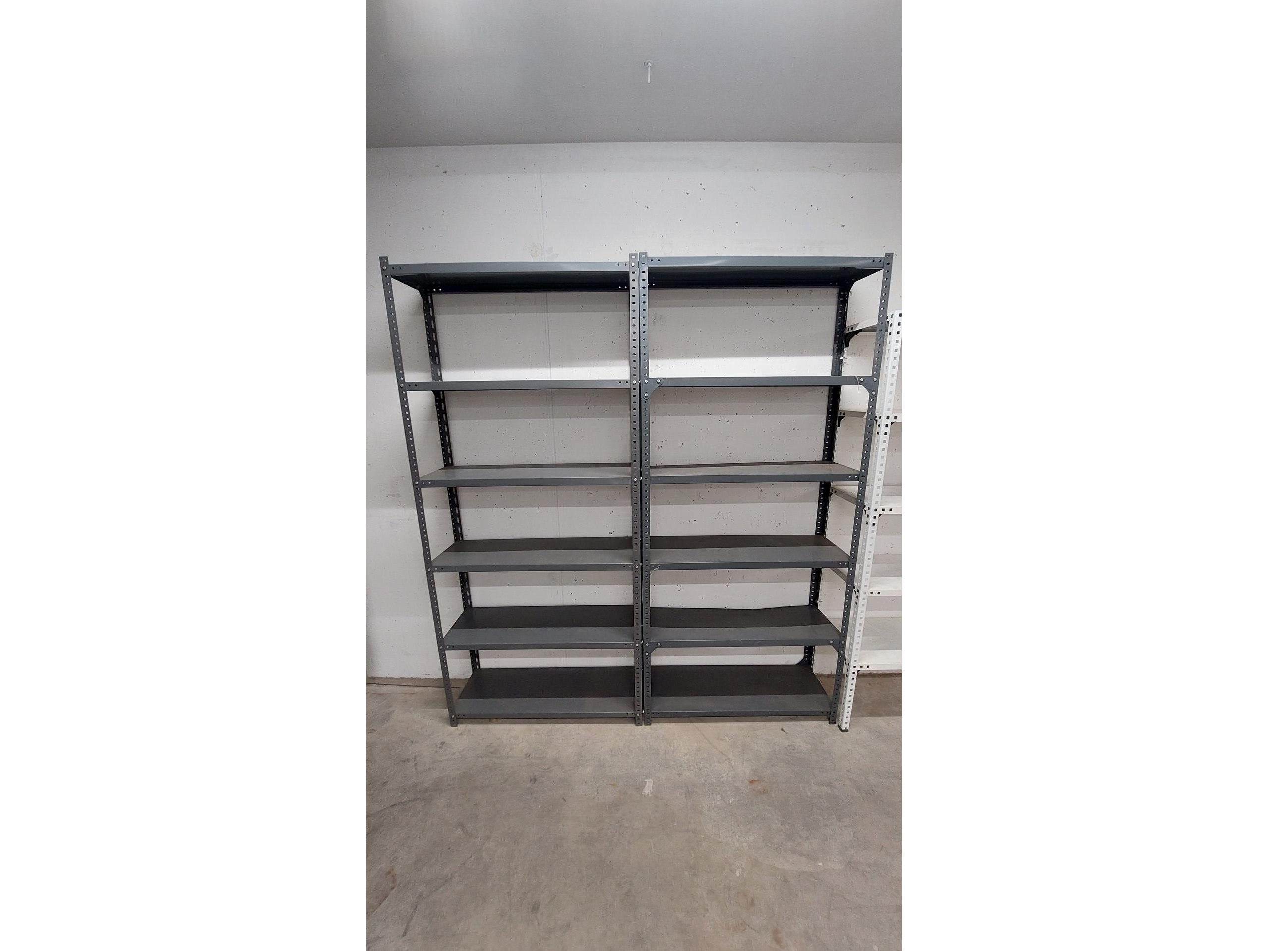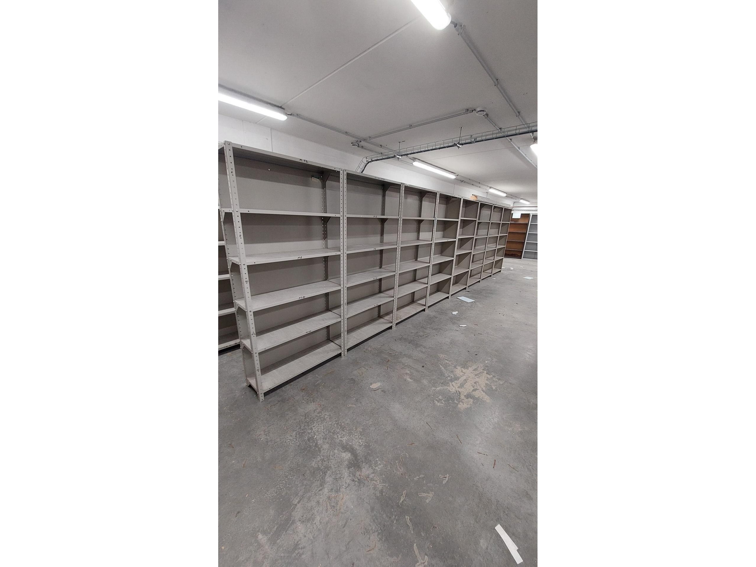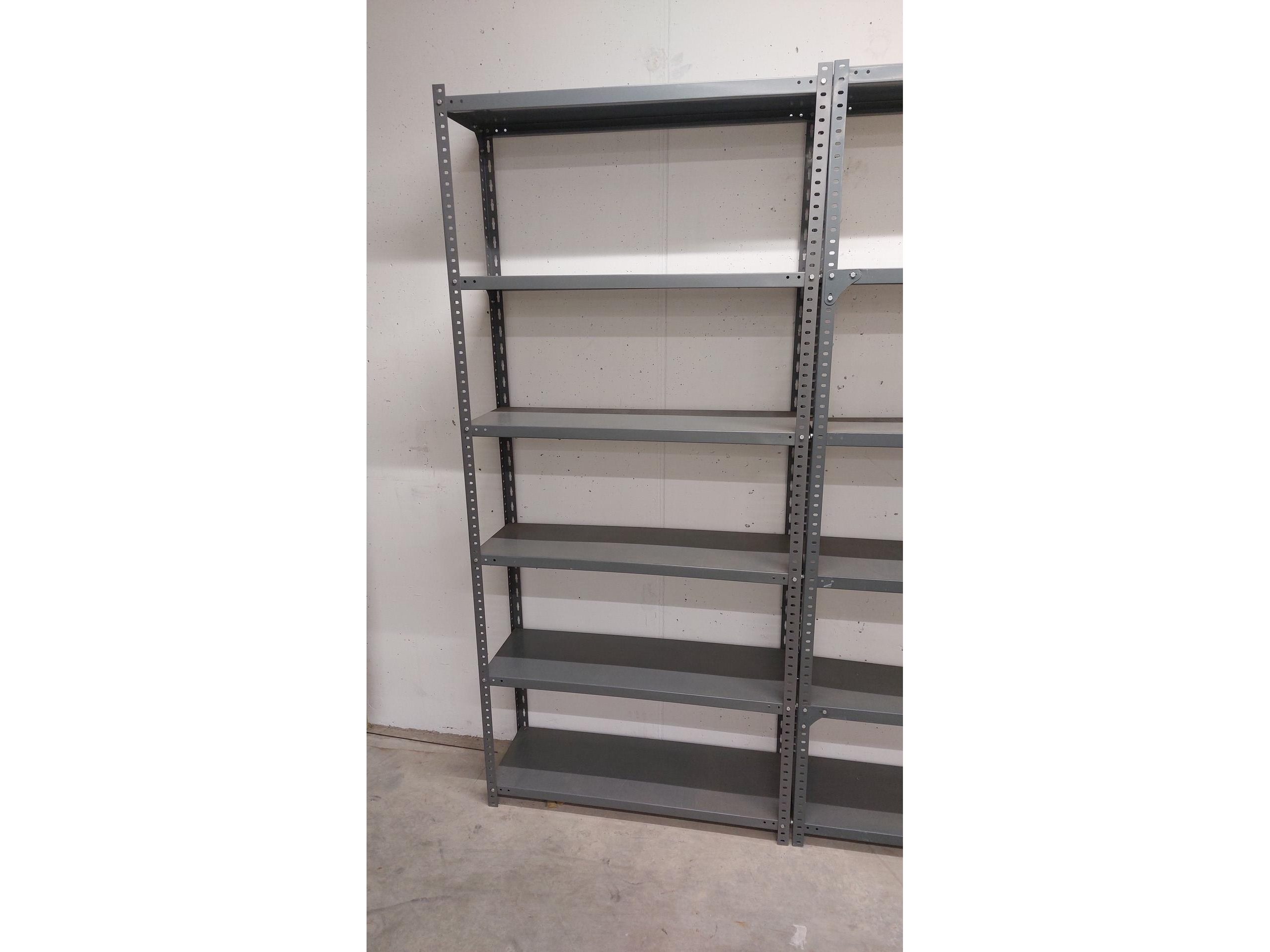 51 lopende meter stevige metalen rekken<br /> <br /> Alles is gedemonteerd. <br /> Alles is per soort gesorteerd en alle vijzen in een doos.<br /> Zonder europallets. 15 euro per europallet of ruilen ter plaatse.<br /> <br /> <br /> <br /> 8 x rek antraciet<br /> H 200 x B 90 x D 30 <br /> +- 6 legger per vak<br /> 14 x rek antraciet<br /> H 200 x b 90 x D 45<br /> 5 legger per vak +-<br /> 2 x magazijnrek antraciet 200 x B 90 x D60<br /> 4 legger<br /> 5 x rek antraciet <br /> H 200 x b 100 x d 35<br /> 3 x rek wit<br /> H 180 x b 90 x D 35 cm<br /> 5 legger<br /> 15 x rek H 197 x B 93 x D 30<br /> 1 x rek H 197 x B 73 x D 30<br /> 6 liggers per vak<br /> 2 x H 200 x B 110 x D 30 ( 4 staanders + 12 liggers)<br /> 1 x H 220 x B 110 x D 30 ( 2 staanders + 7 ligger)<br /> 5 x H 200 x B 100 x D 50 cm<br /> 5 leggers
