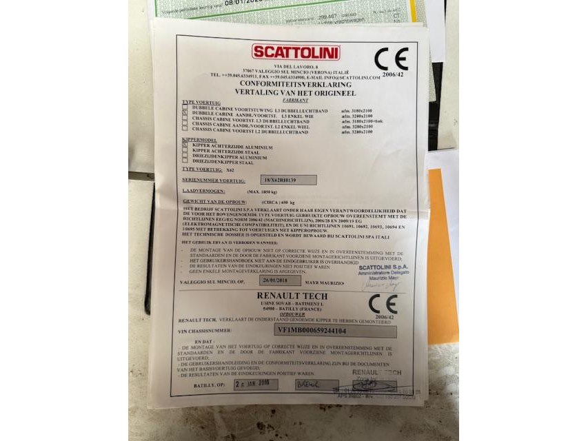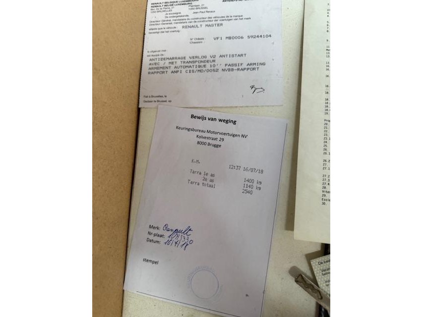 Lichte vrachtwagen, pick-up KIPPER, dubbele cabine,<br /> merk RENAULT, <br /> model MASTER<br /> chassis : VF1 MB0 006 59 244 104<br /> 1e inschrijving : 25-06-2018<br /> km : 319 559 km op teller<br /> motor : 2299 cm³ - 96 kW - gasolie - euro 6b<br /> HTG : 3500 kg - sleep 6000 kg - LV 885 kg<br /> uitvoering : 6+1 plaatsen, trekhaak, handgeschakeld, open KIP-laadbak met alu zijdeuren en metalen laadvloer SCATTOLINI<br /> documenten : deel II kentekenbewijs ontbreekt<br /> sleutel (s) : 2<br /> ref. : 1-UNS-330