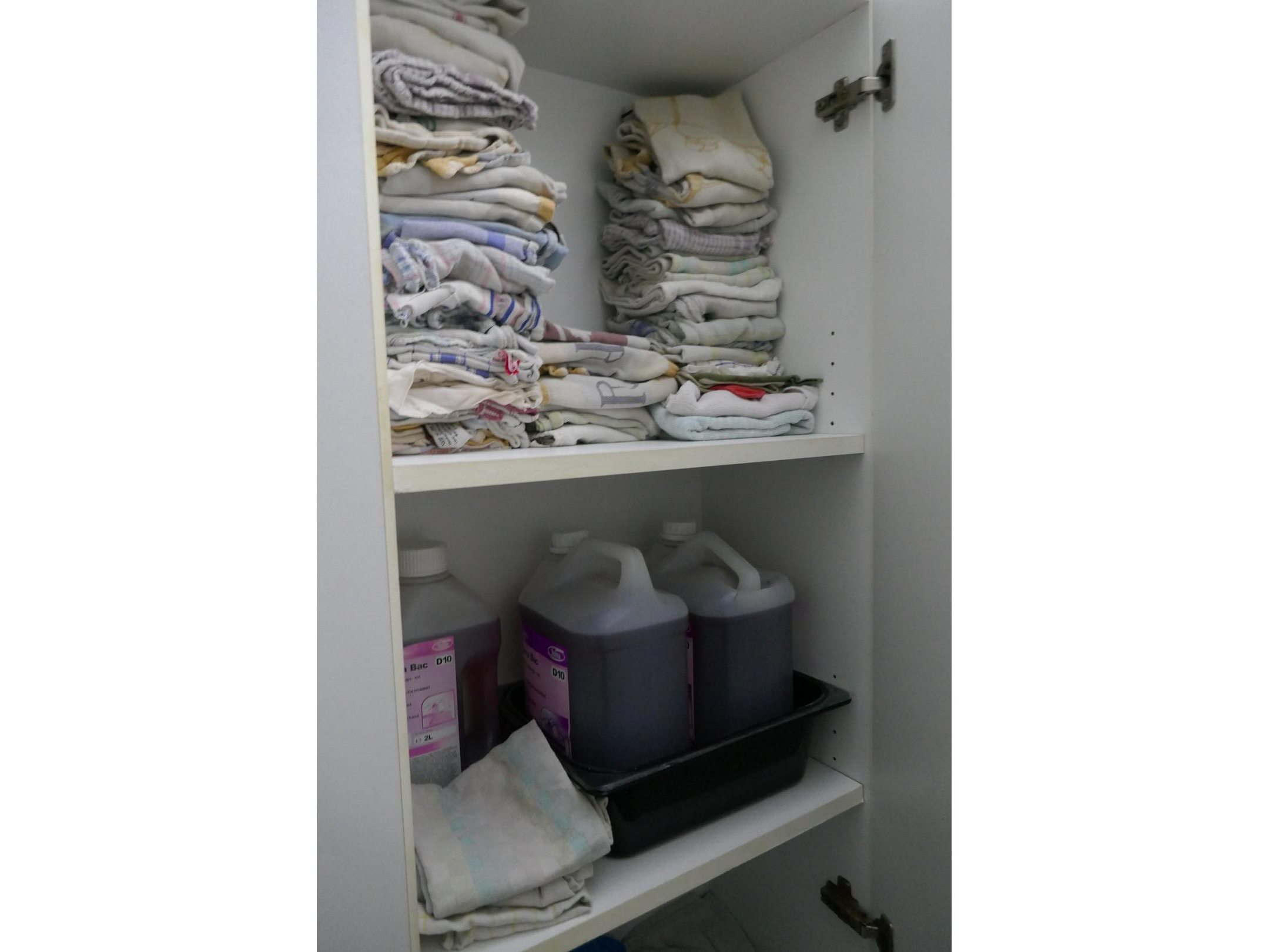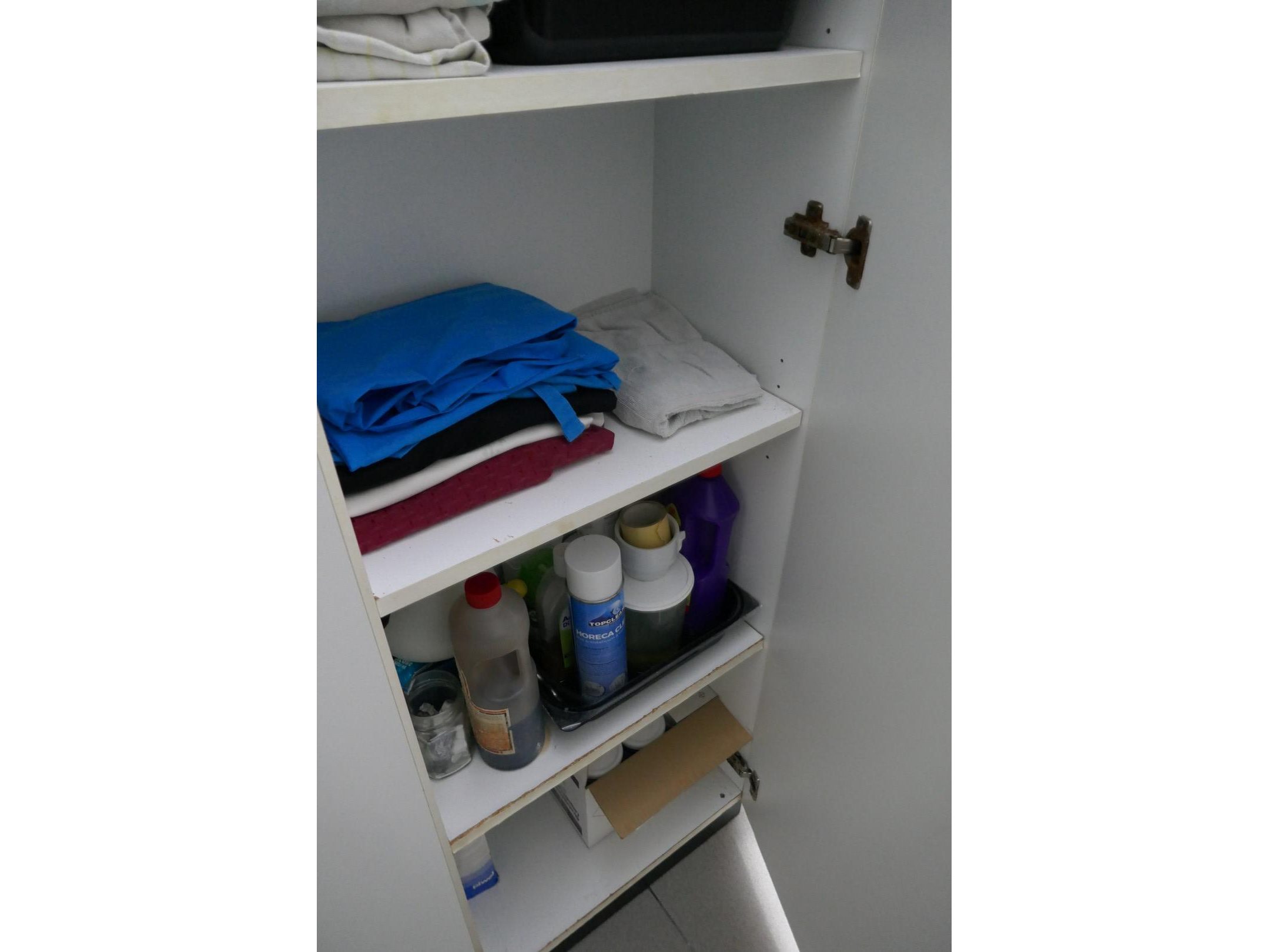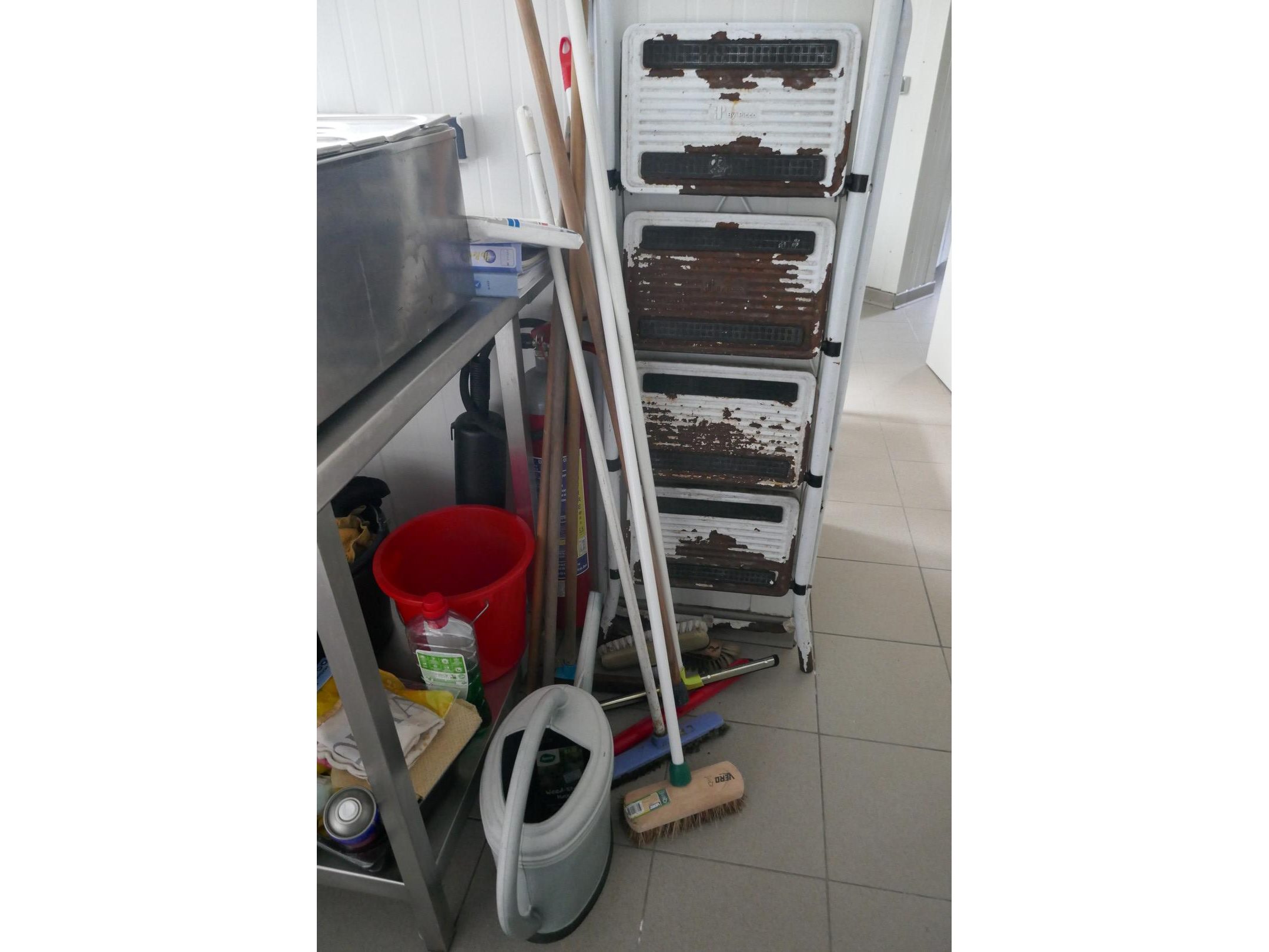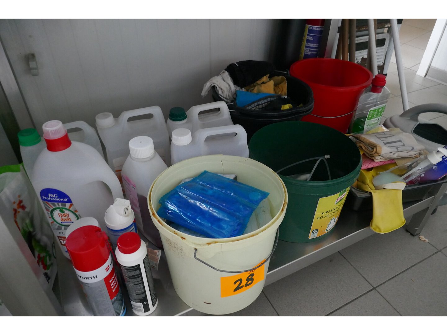 Onderhoudprodukten - onderhoudsmateriaal - poetsmateriaal - trapladder - gieters - borstels - leeggoed - werkgereedschap - witte houten kast met inhoud - enz…