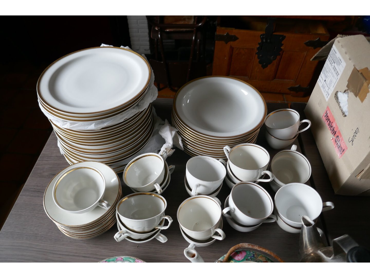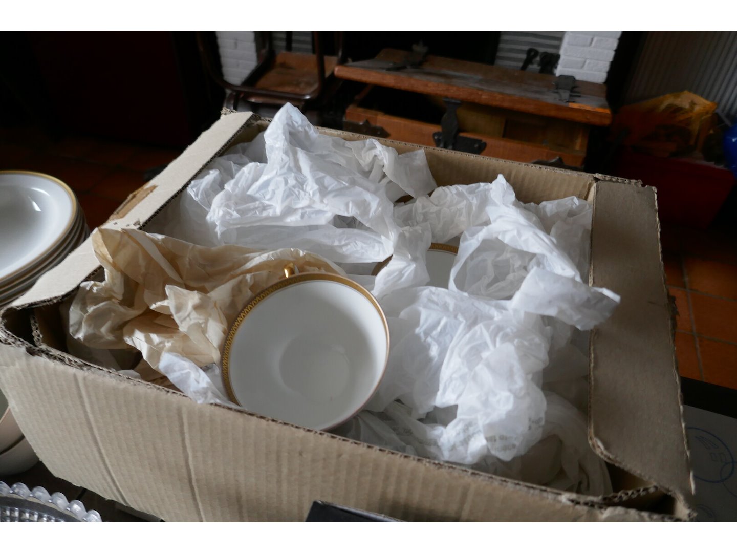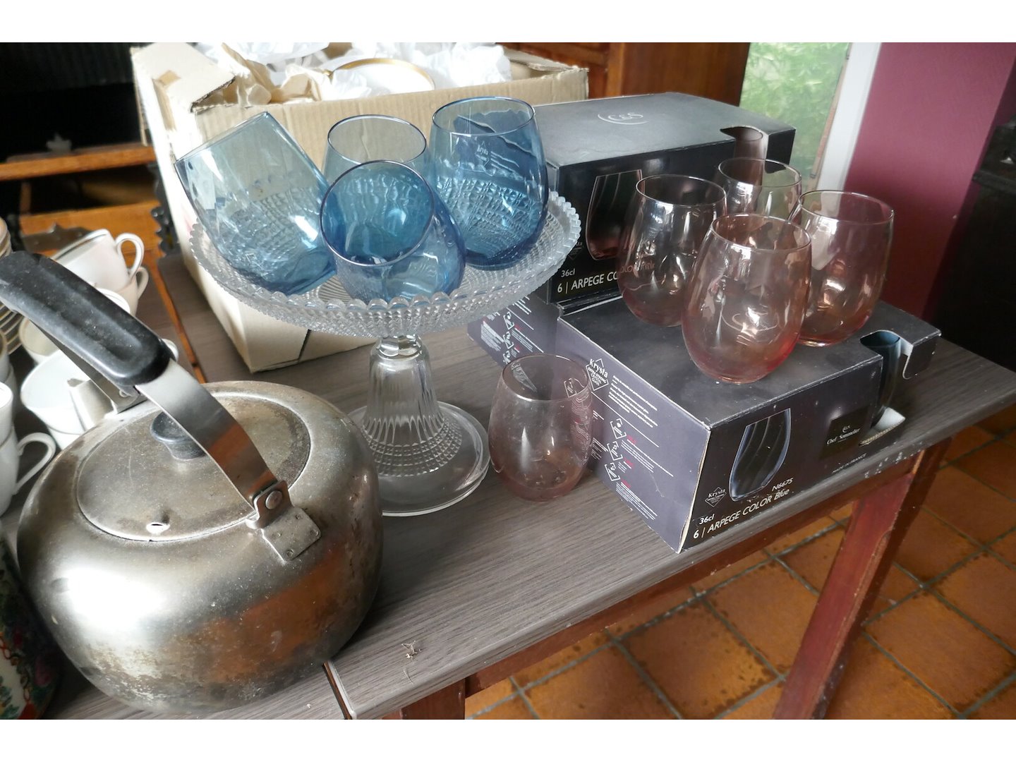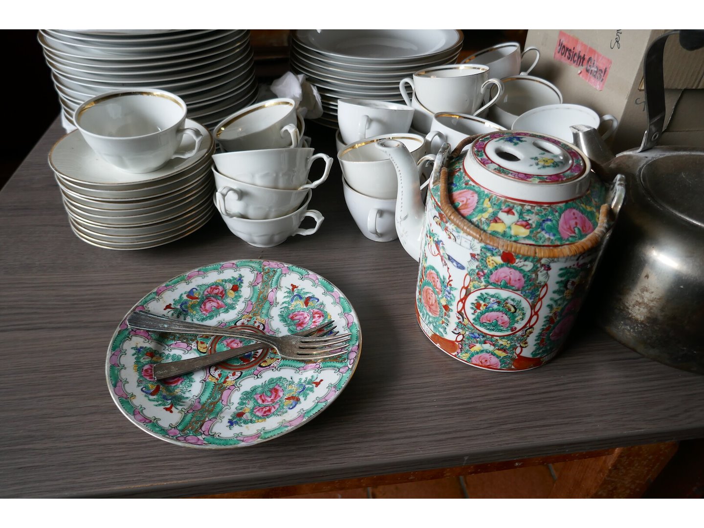 Porseleinen borden en koffiekopjes - glazen schaal - gekleurde glazen - fluitketel - antieken Chinese theepot