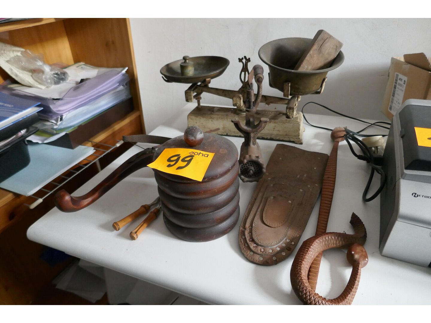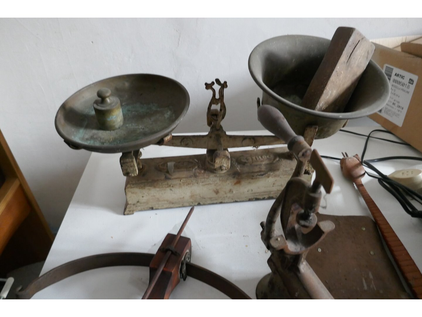Vintage weegschaal, kruisboog, antieken tabakpot, vleesmolen enz…