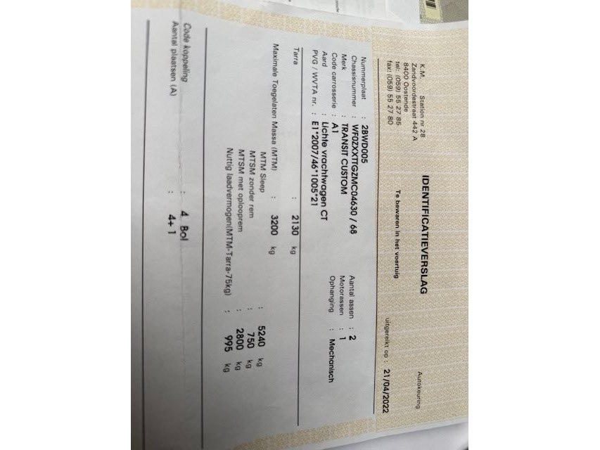 Aard : Lichte vrachtwagen,<br /> merk : FORD,<br /> model : Transit met dubbele cabine,<br /> chassis : WF0 ZXX TTG ZM C04 630<br /> 1e inschrijving : 14-04-2022<br /> Km : 142.954 km op teller<br /> Motor : diesel, euro 6<br /> HTG : 3200 kg - laadvermogen 995 kg<br /> Uitvoering : dubbele cabine (4+1 personen), 2 schuifdeuren, alu velgen, trekhaak, ingericht werkplaats, el. Ruiten,...<br /> Documenten : OK<br /> Sleutel(s) : 1<br /> Opmerkingen : 1) wordt toegewezen onder voorbehoud goedkeuring door de leasingmaatschappij en 2) na toewijs af te halen in 8710 OOIGEM<br />