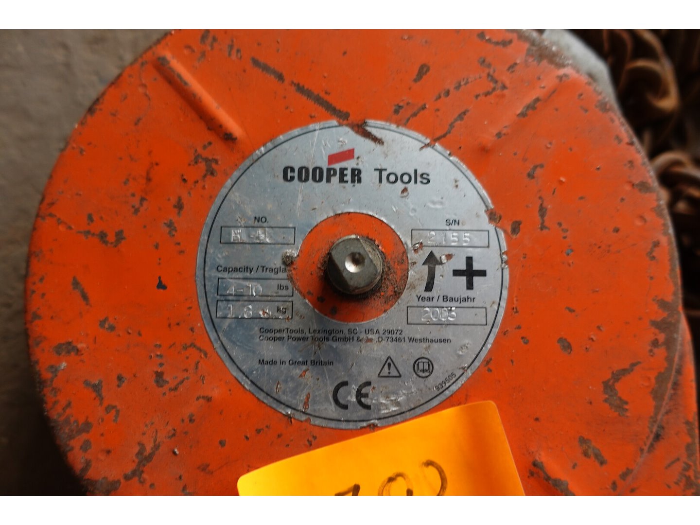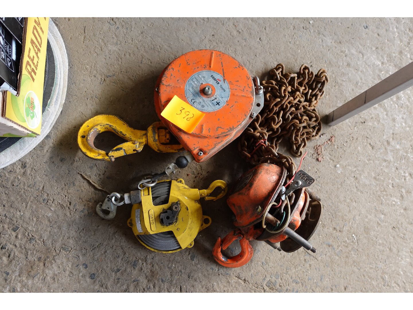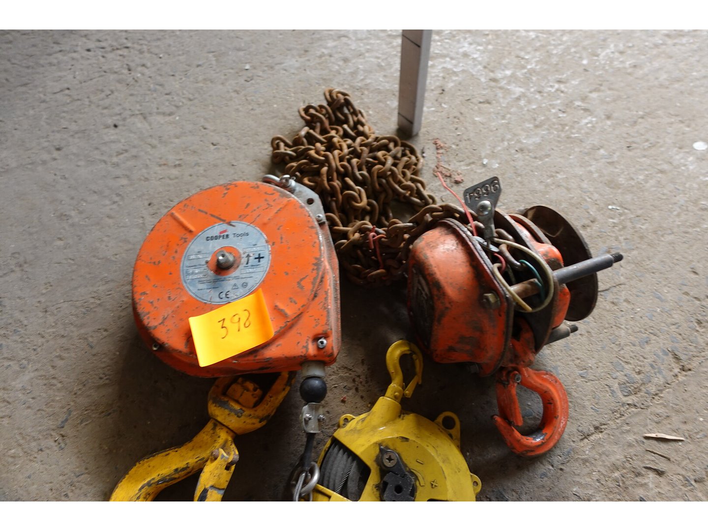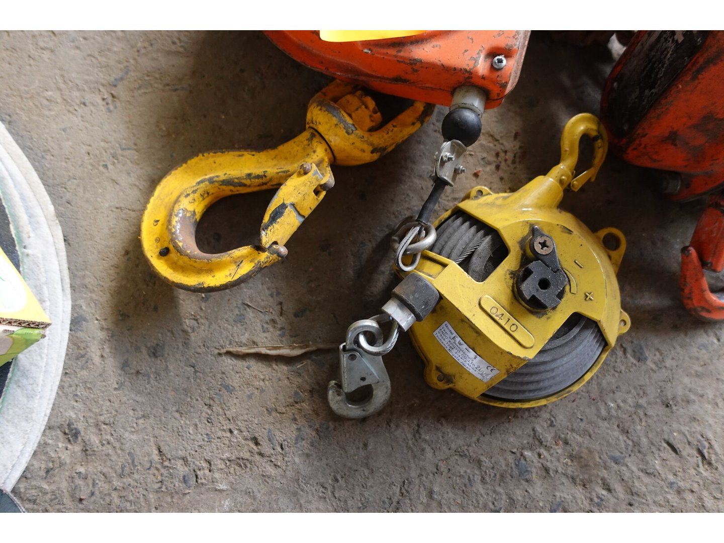 2 veerbalansen, 1 haak, 1 kettingtakel