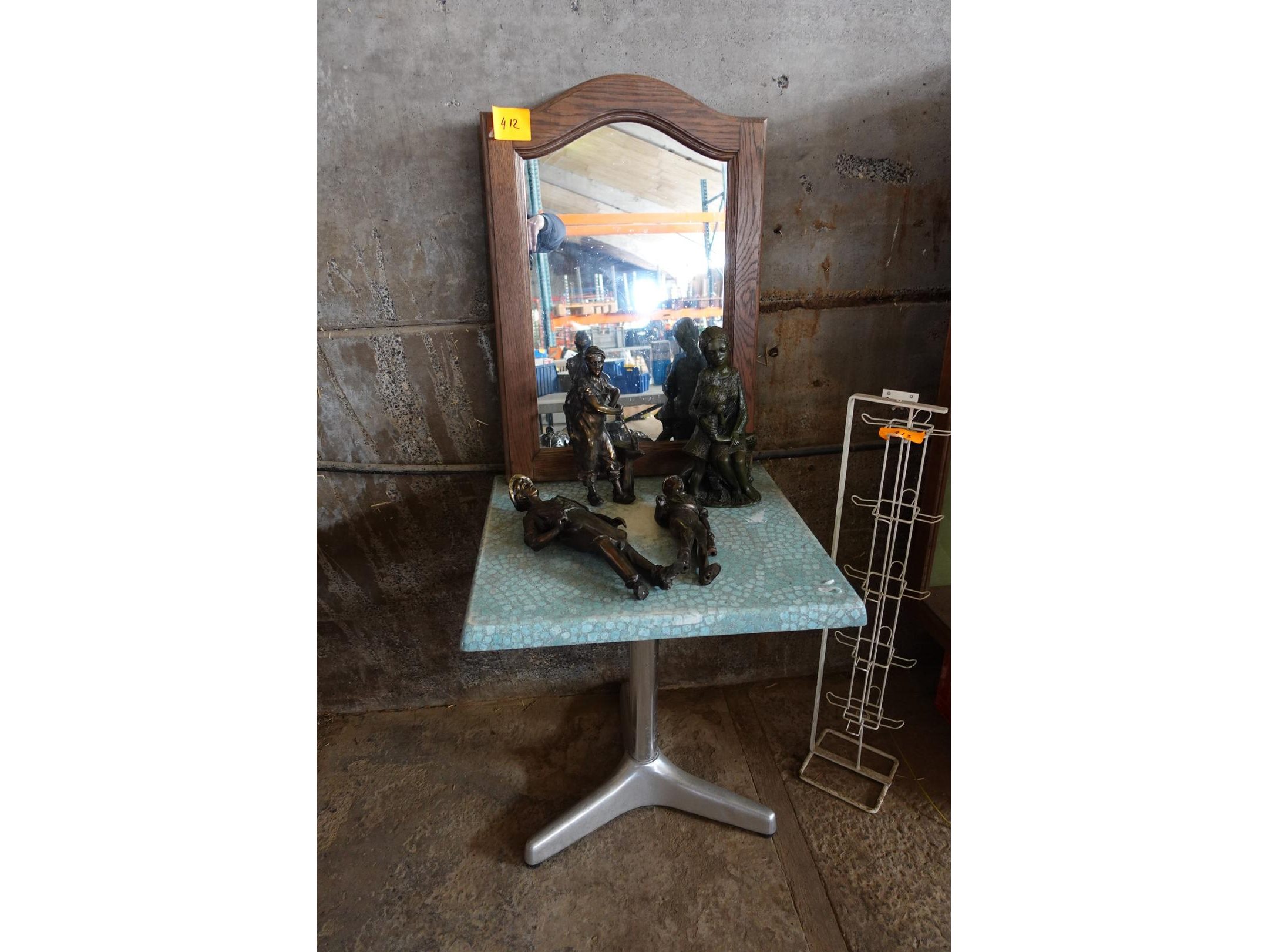 Lot met spiegel met houten rand,beeld 'moeder met kind', 3 beelden (werklieden), terrastafel