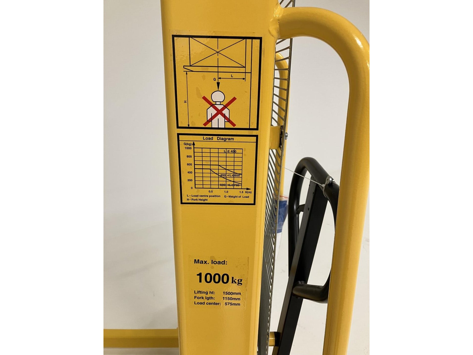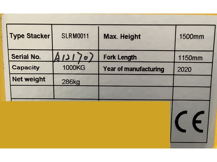 Min. hoogte: 1960mm - Max. hoogte: 1960mm - Lifthoogte: 1500mm - Lengte van de vorken: 1150mm - Breedte van de vorken: 160mm - Breedte over de vorken: 540mm - Breedte tussen de vorken: 220mm - Totale lengte/breedte van de stapelaar: 1595x1395mm - Bouwjaar 2020<br /> Nieuw