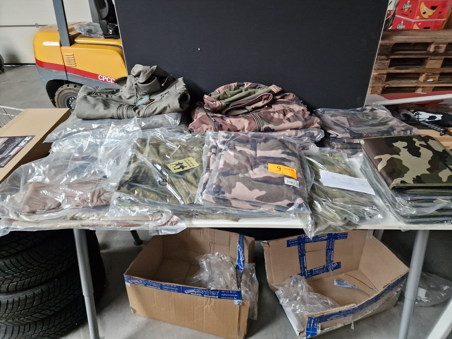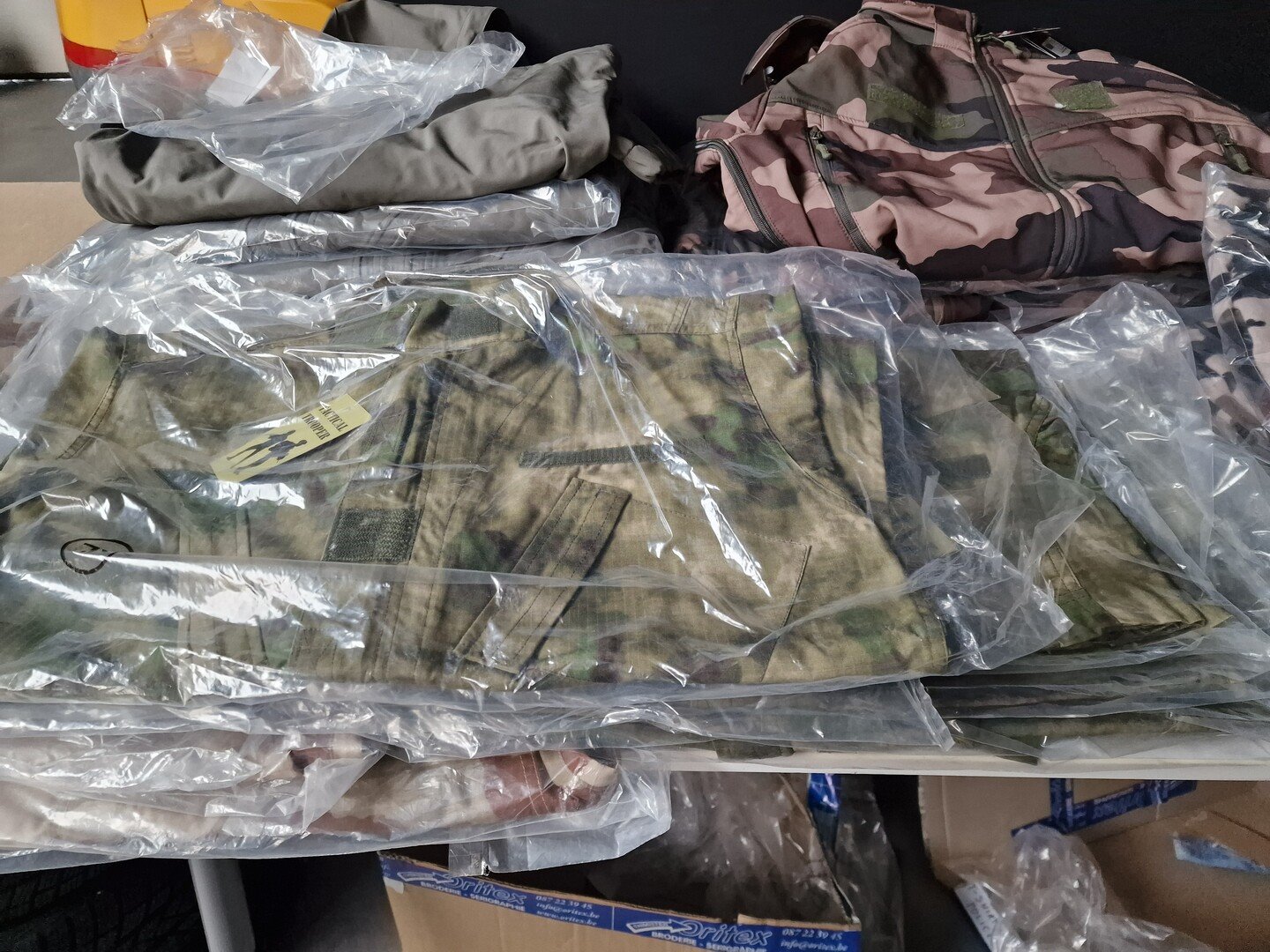 Ong. 32 stuks camouflagekledij (vesten, sweater, schrijfmap
