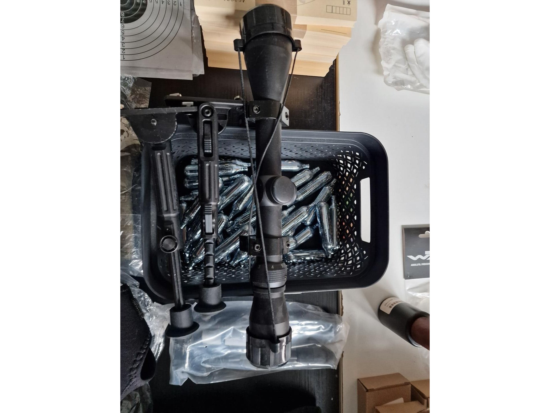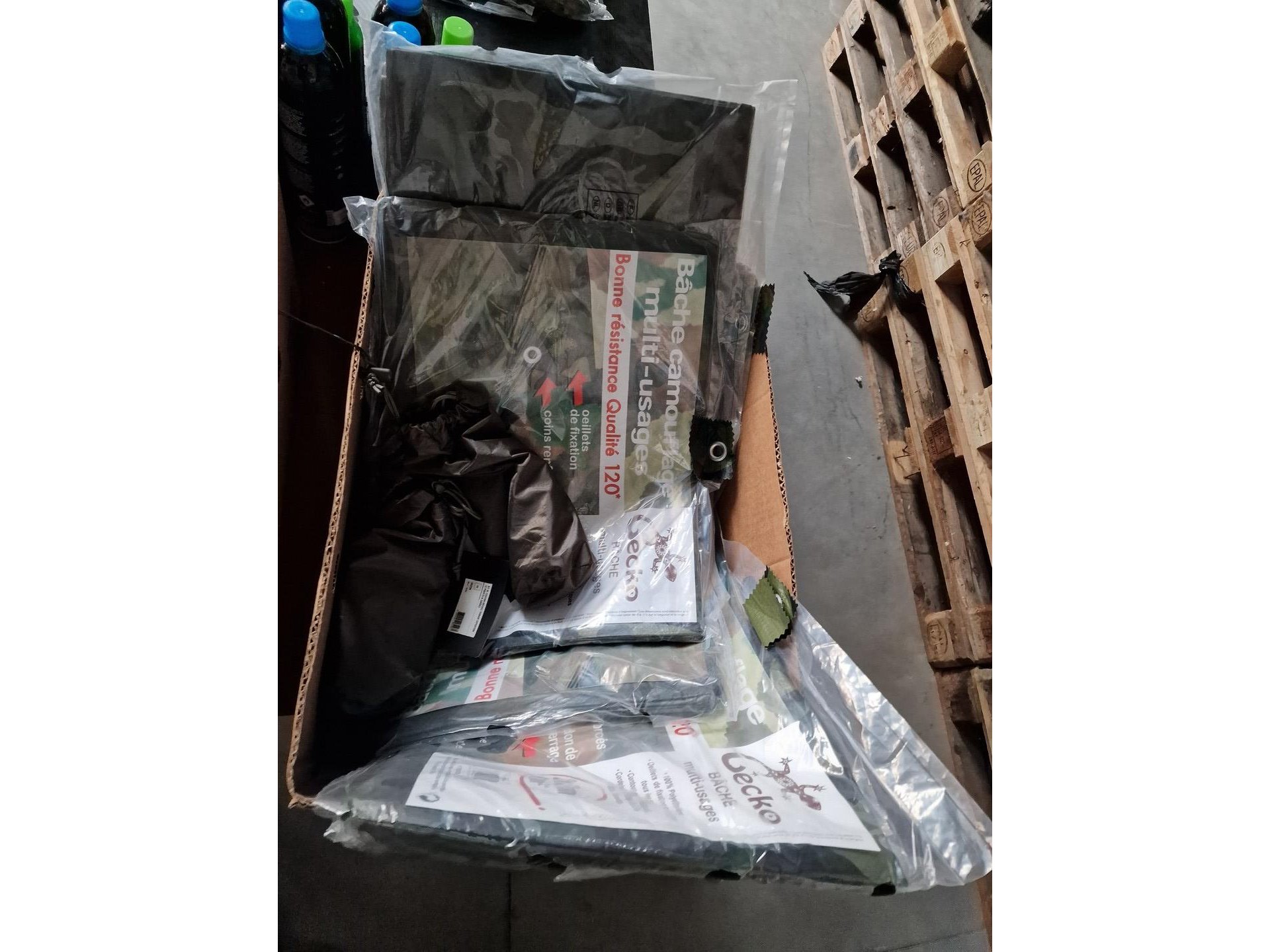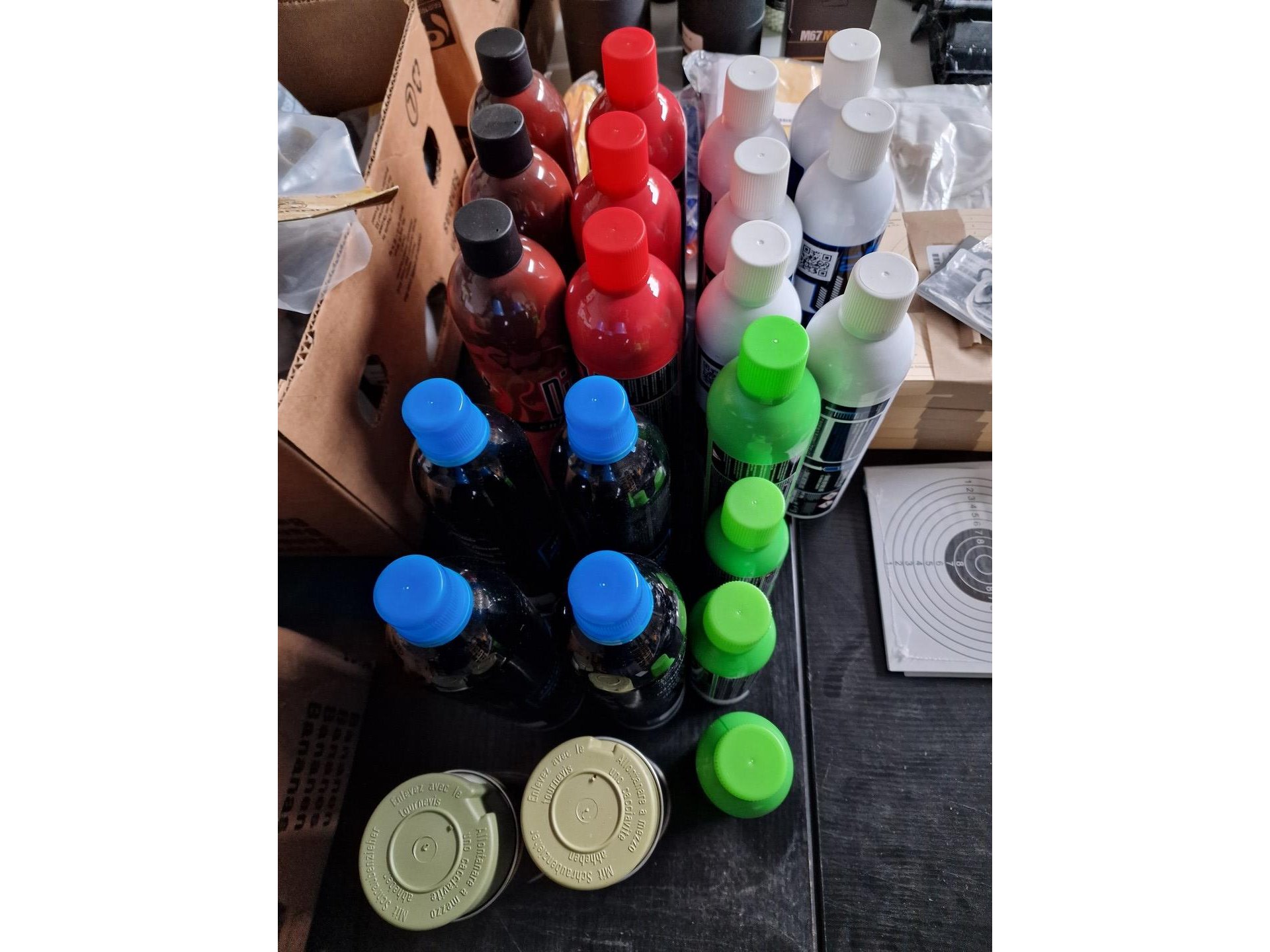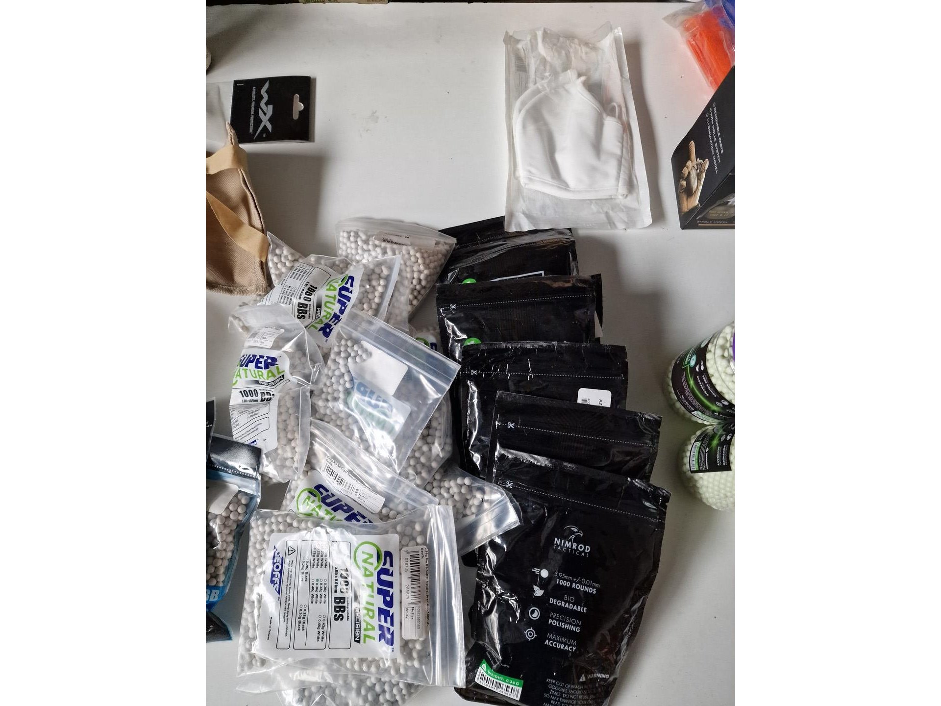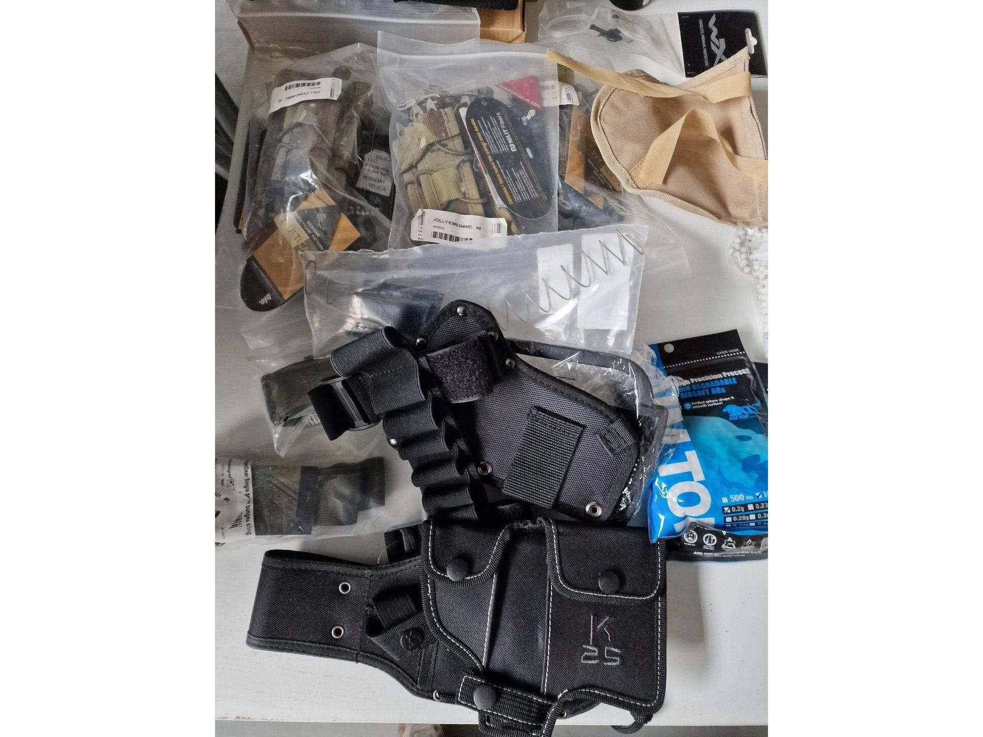 Gevarieerd lot : camouflagespray, baches, maskers, beschermingen, kogels voor airsoft, vizier, schietschijven, etc.