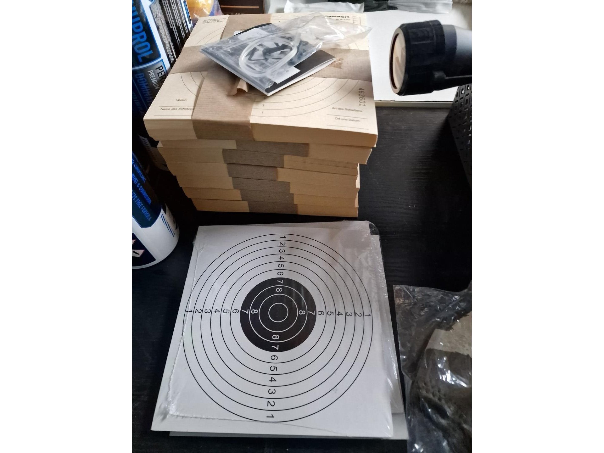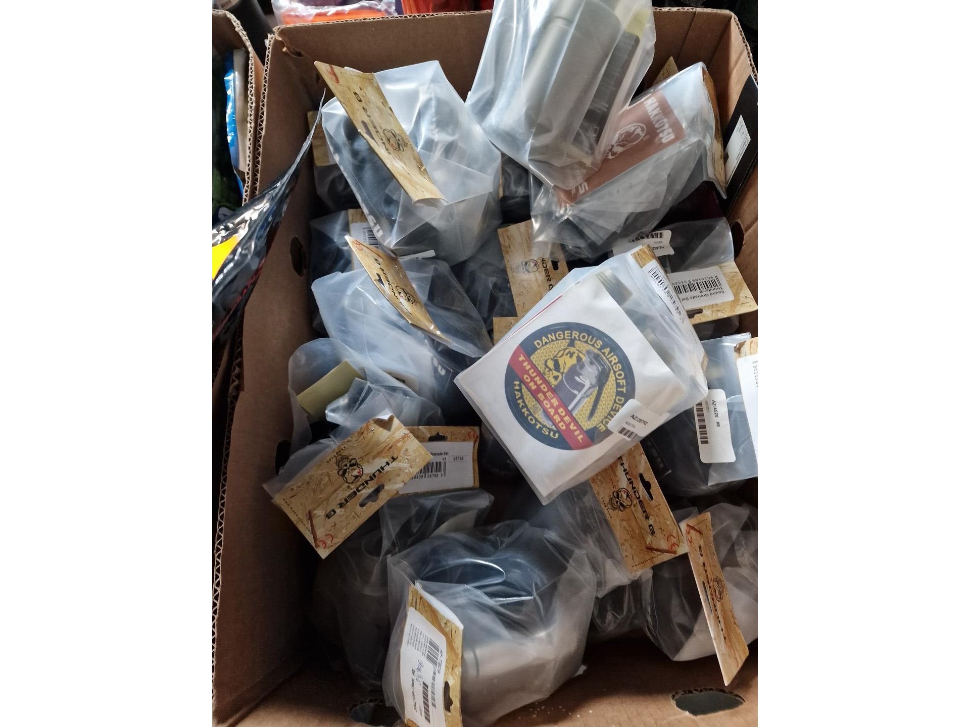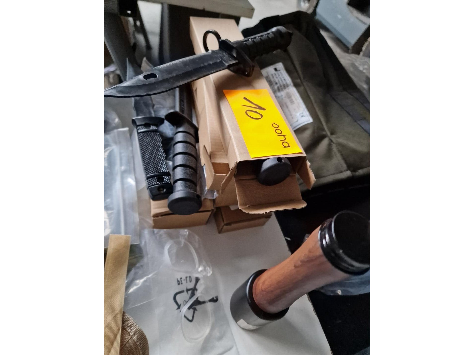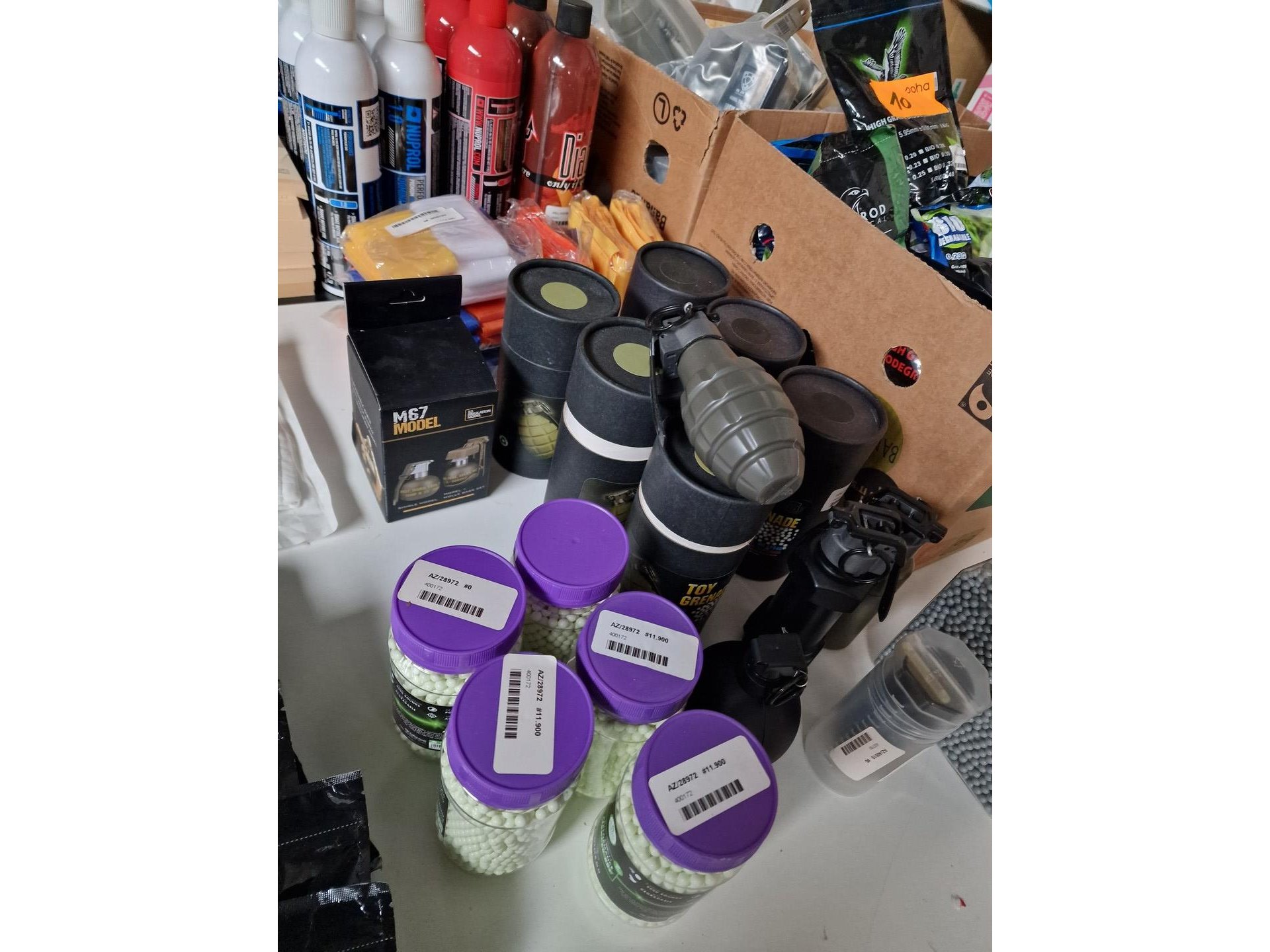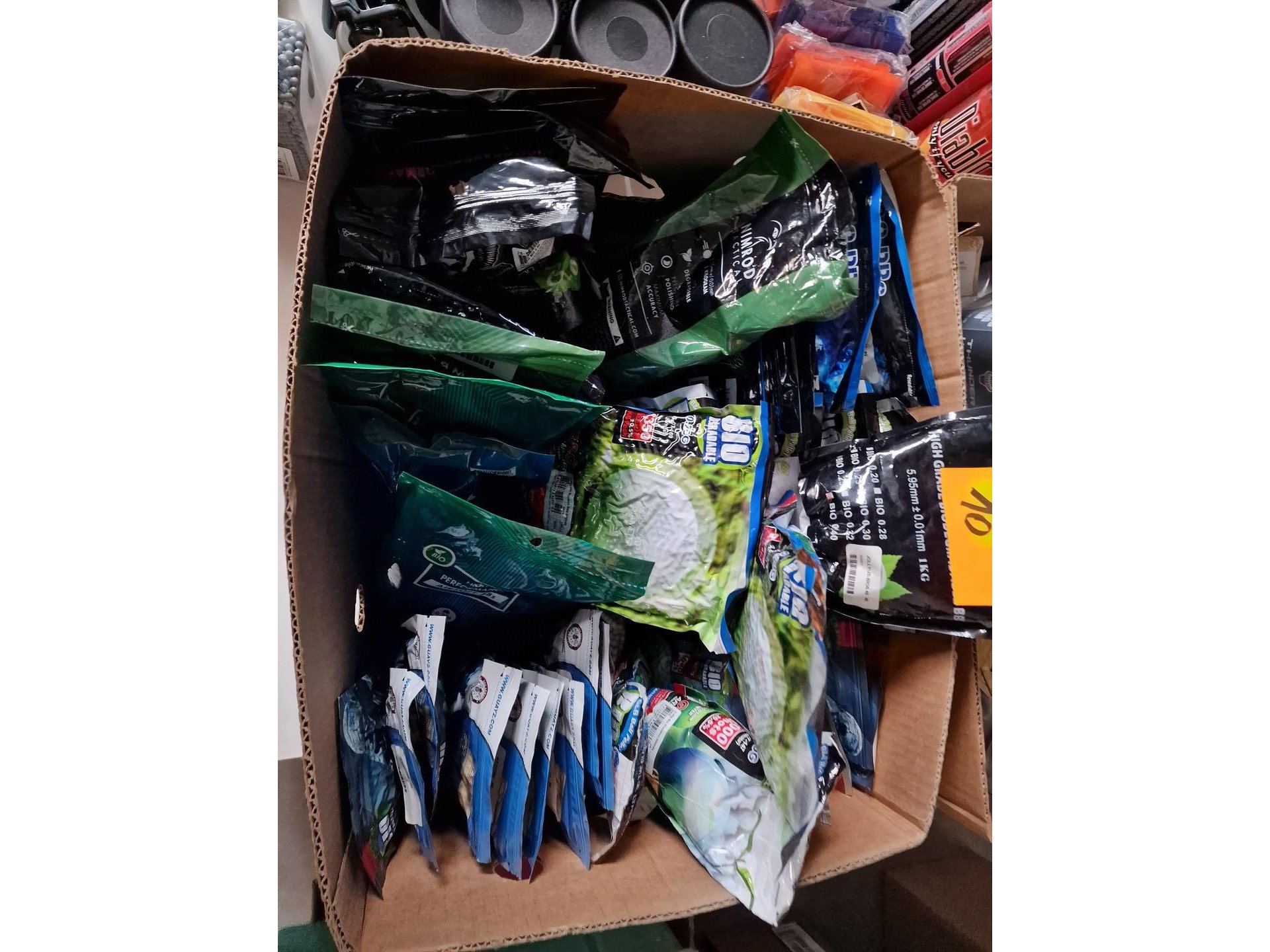 Gevarieerd lot : camouflagespray, baches, maskers, beschermingen, kogels voor airsoft, vizier, schietschijven, etc.