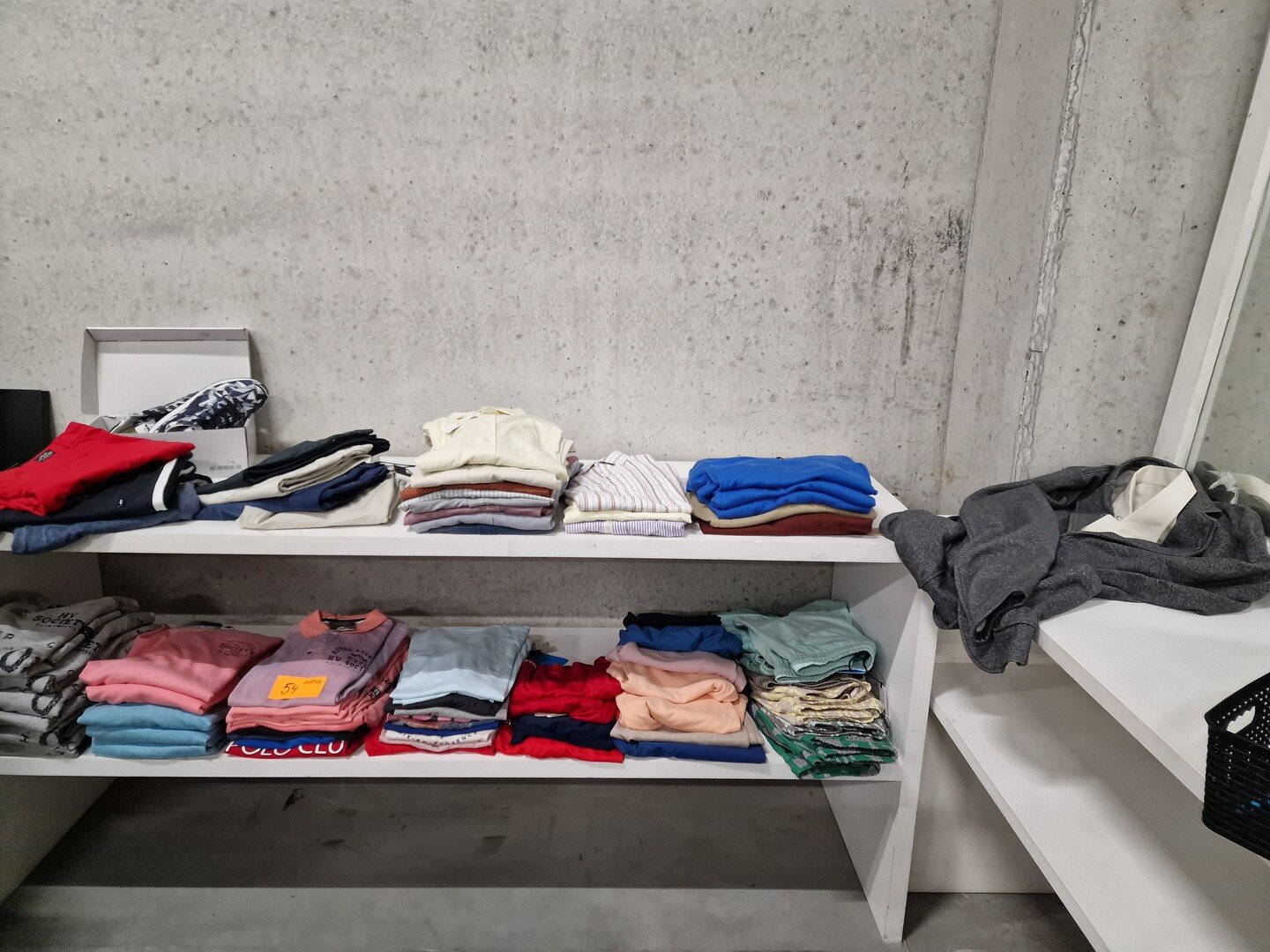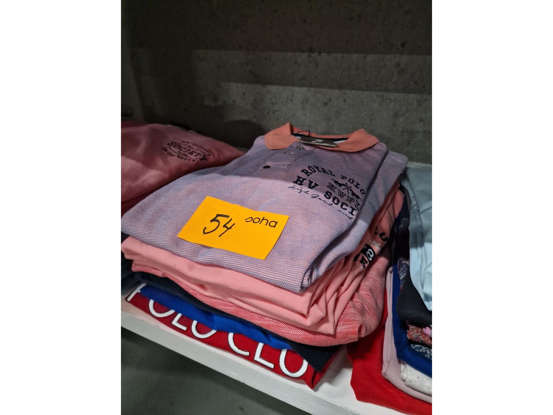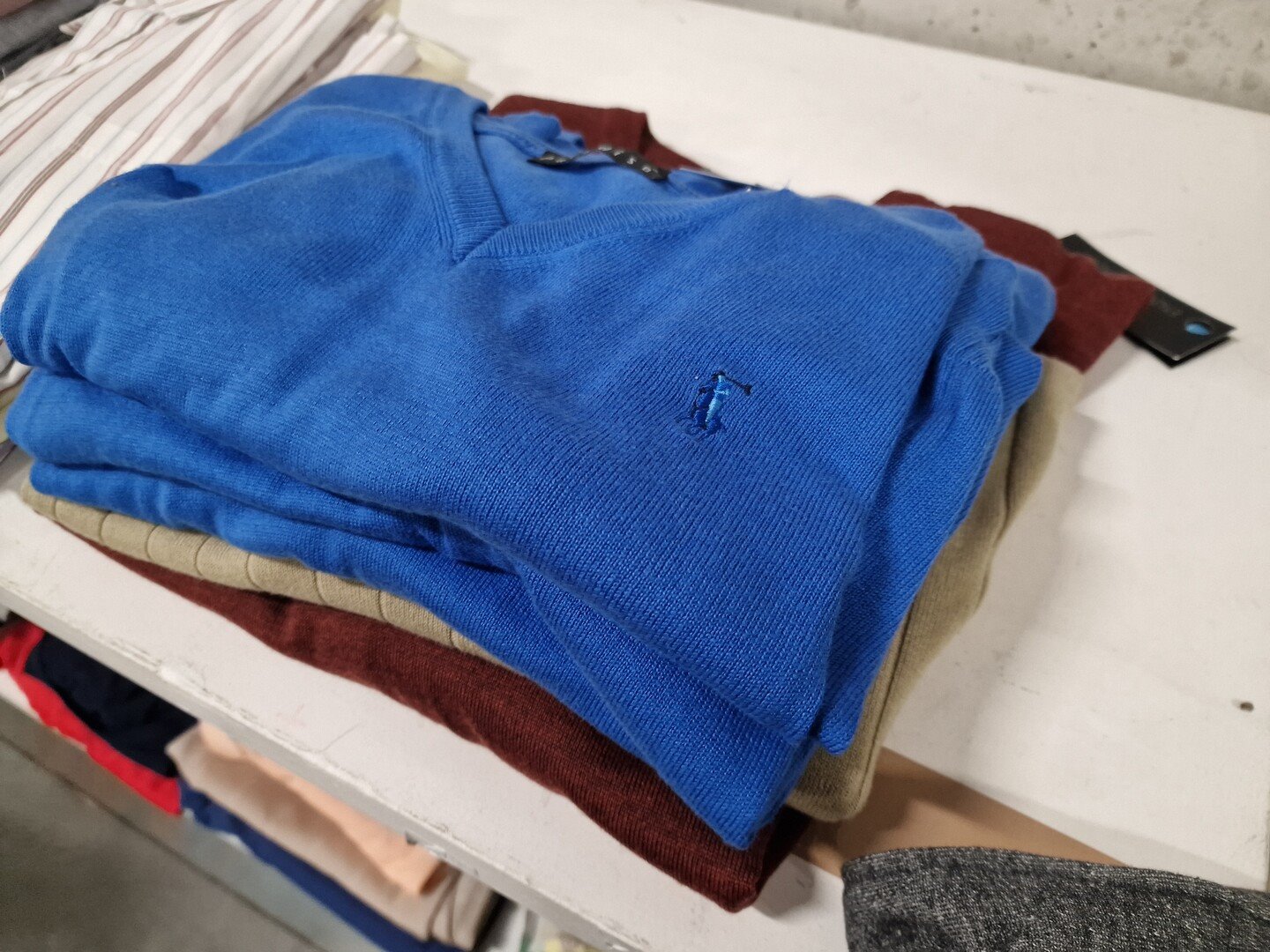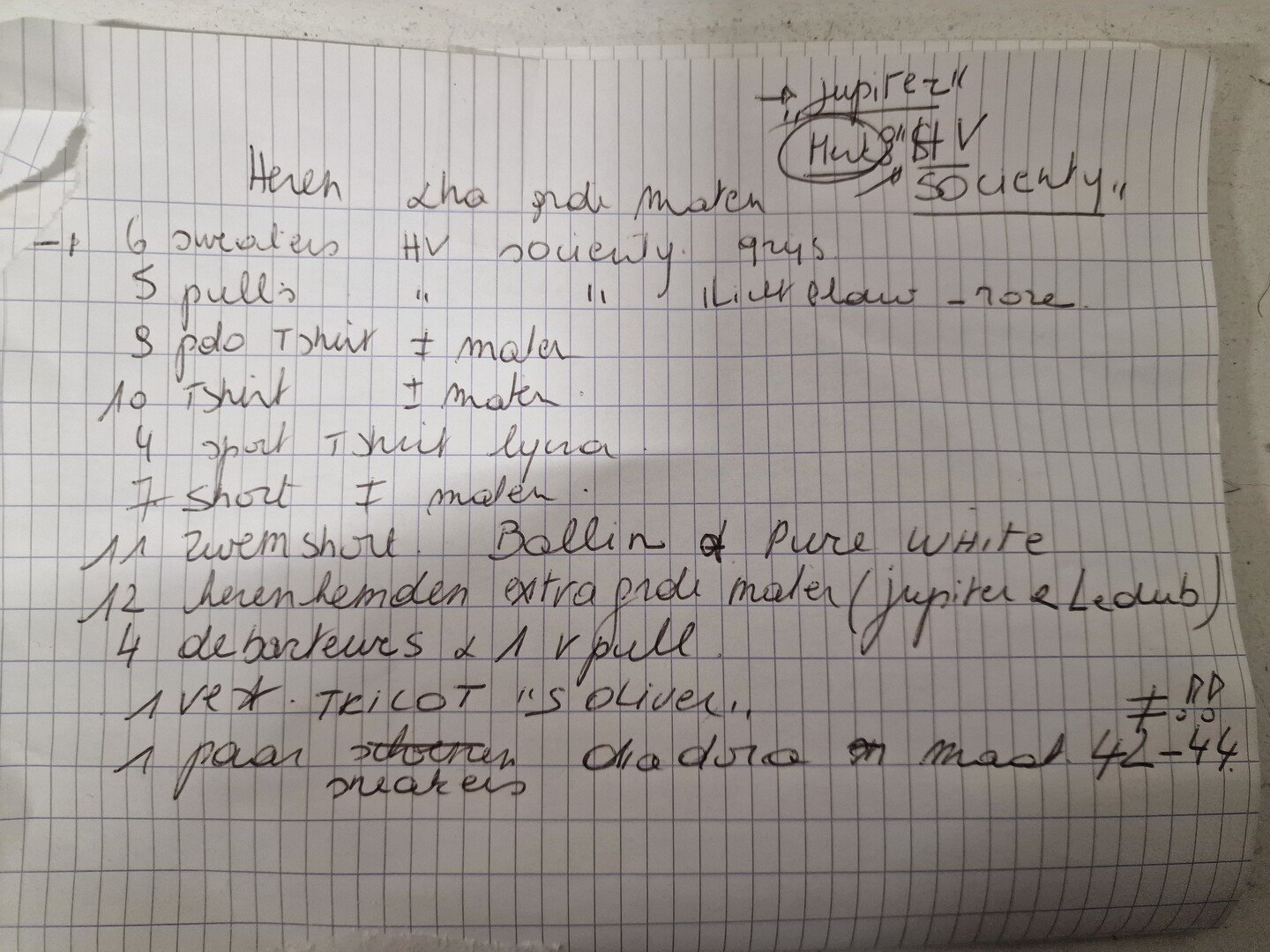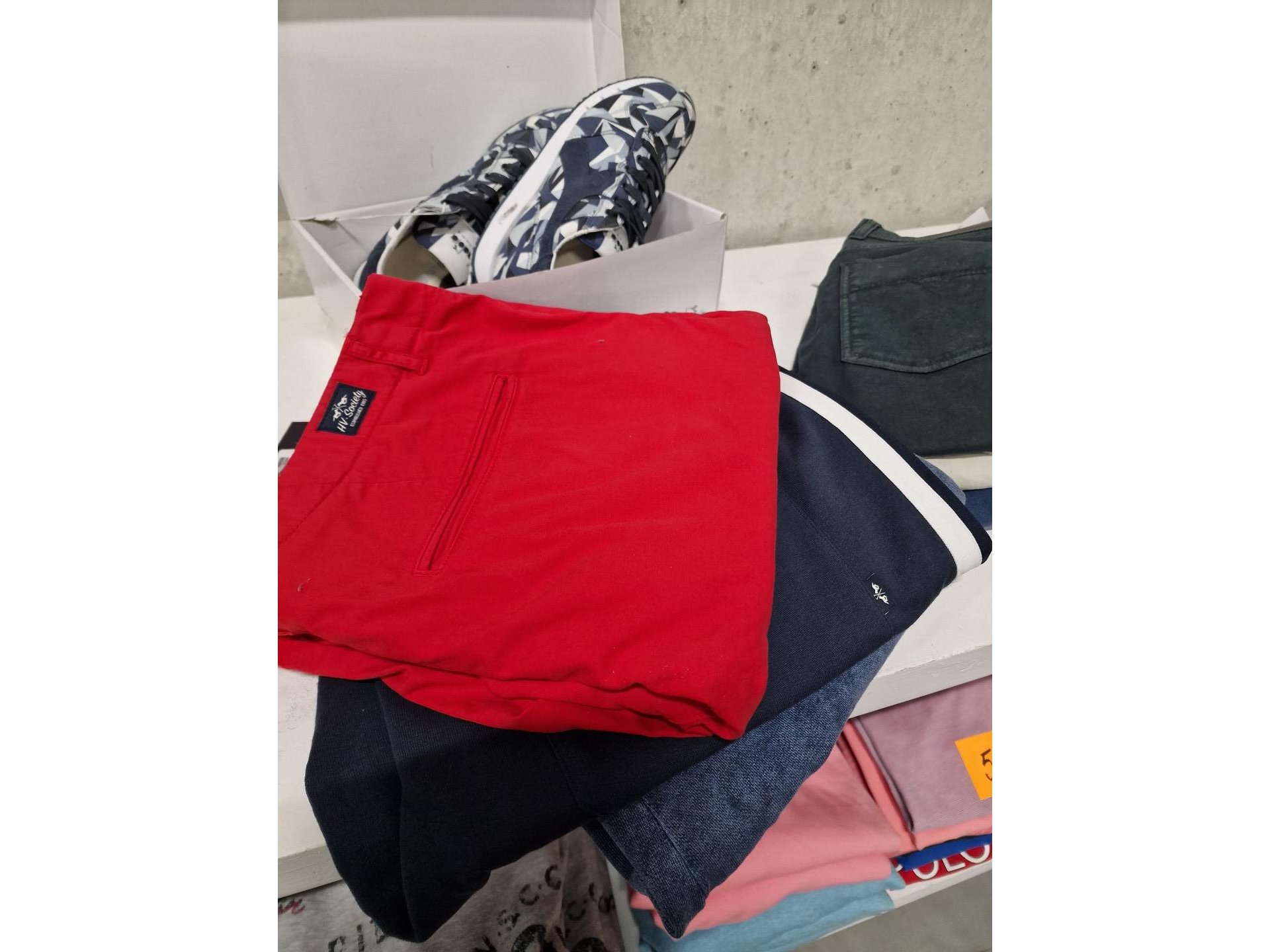 Kledij, voornamelijk voor heren, merken HV-SOCIETY, JUPITER,..<br /> 6 sweaters / 5 pulls / 9 polo T-shirt / 10 T-shirt / 4 sport T-shirt / 7 shorts / 11 zwemshorts / 12 herenhemden / 4 debardeurs & V-pull / veste tricot / paar sneakers Diadora / broeken