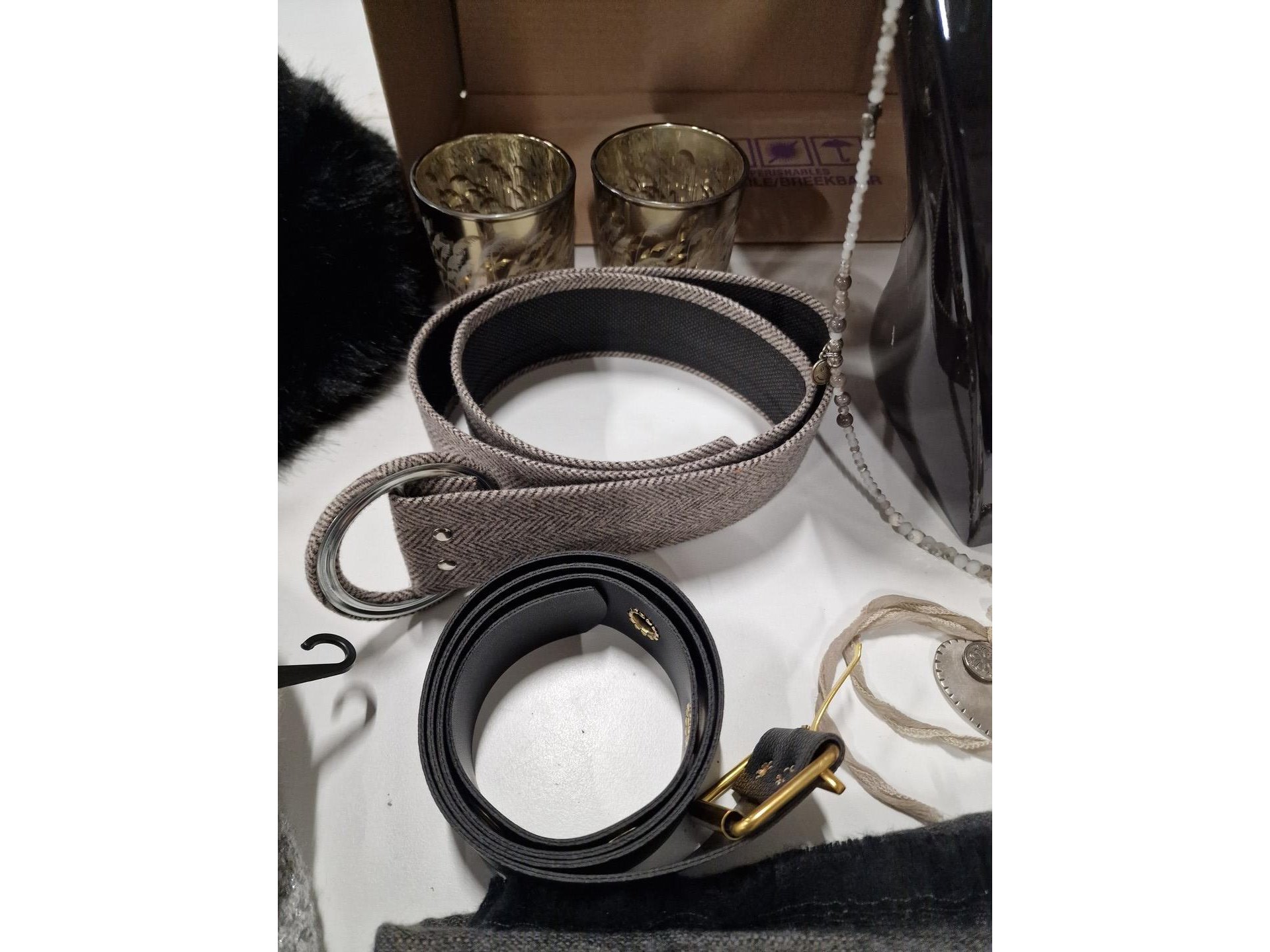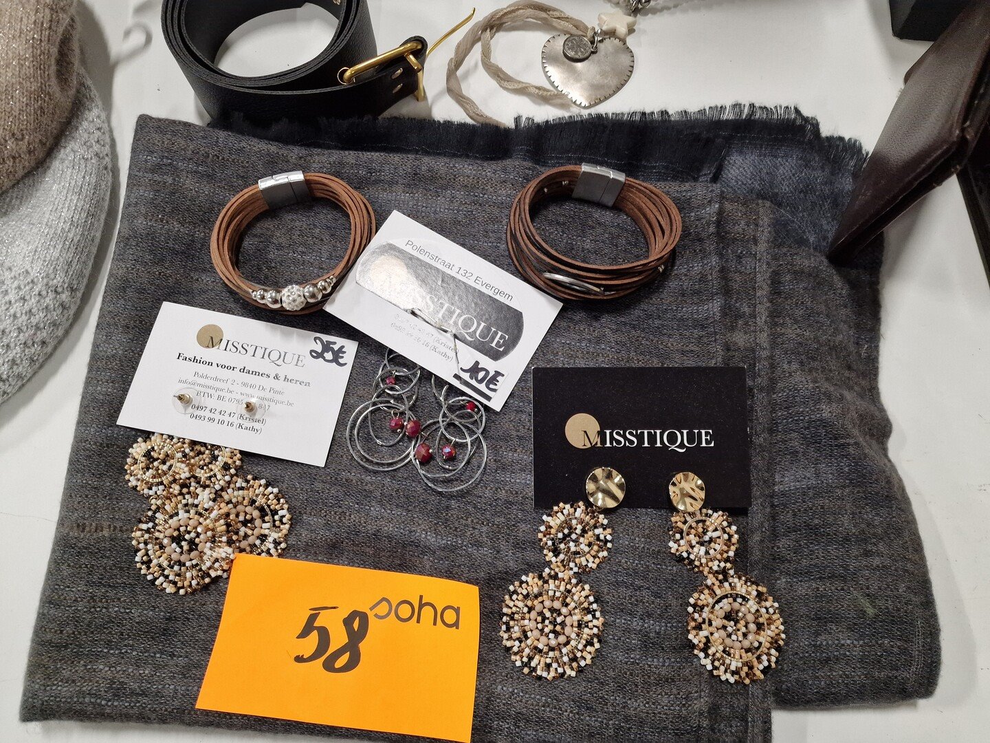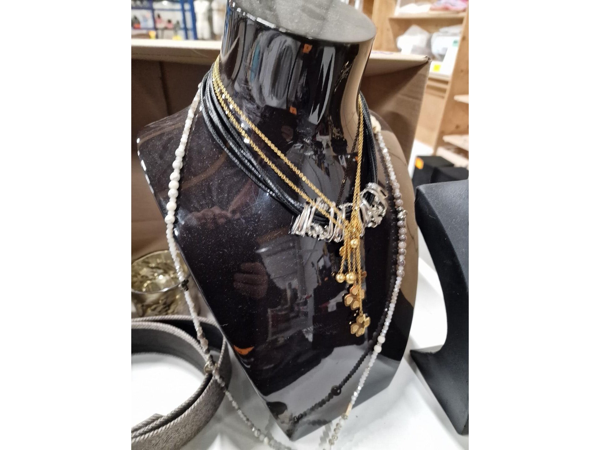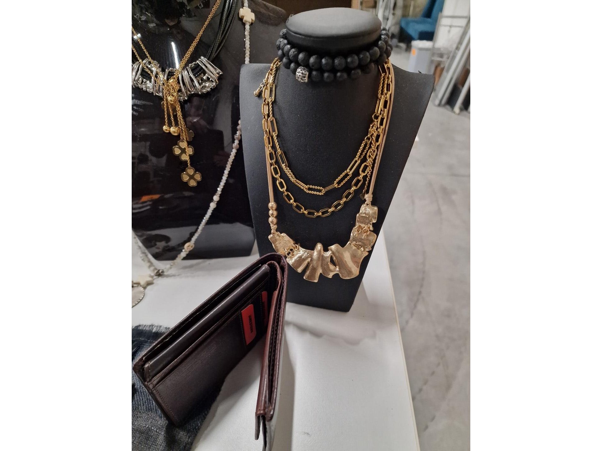 Reeks fantasiejuwelen (kettingen, armbanden, oorbellen) en presentoirs <br /> + riemen + mutsen + T-shirts voor dames (Marina, Estee Brown, Via Zoya)