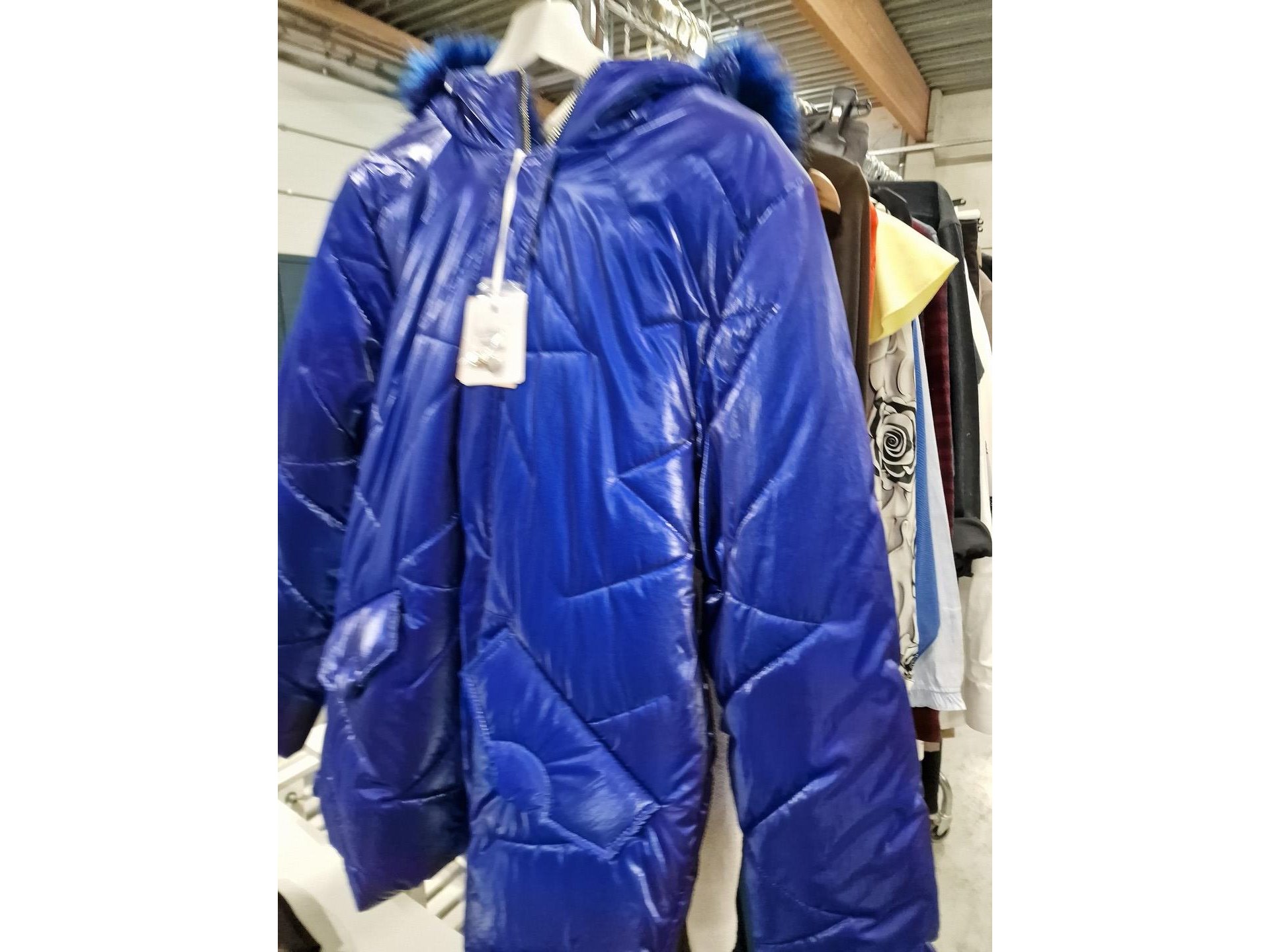 Verchroomd verrolbaar kapstokrek met een 55-tal kledingsstukken voor dames, waaronder : jassen, mantels, bloezen, kleedjes,…