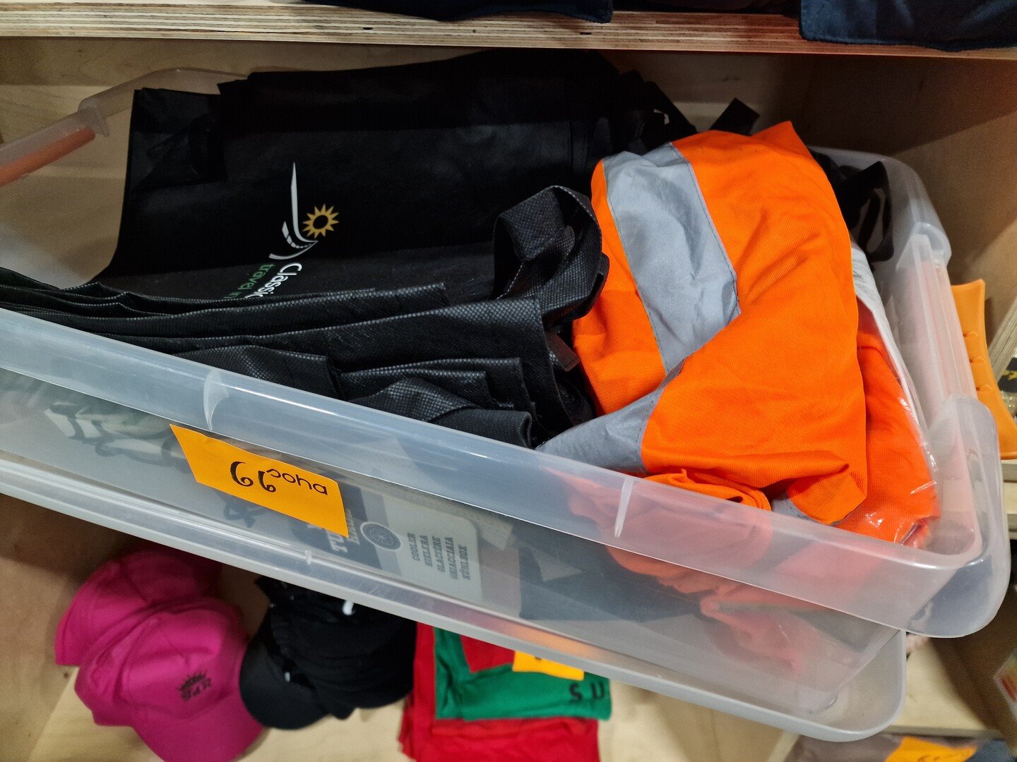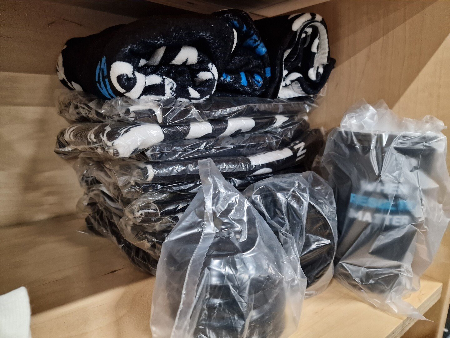 Vest, handdoeken, witte warme sjaals ELEVEATE, T-shirts (rood & groen), caps, ..