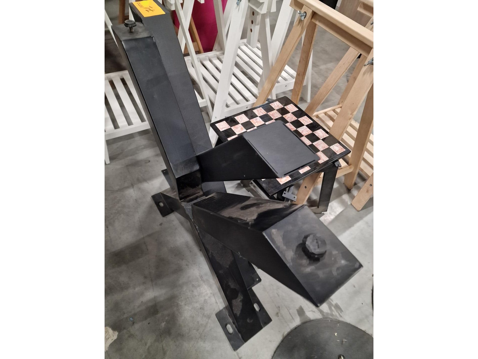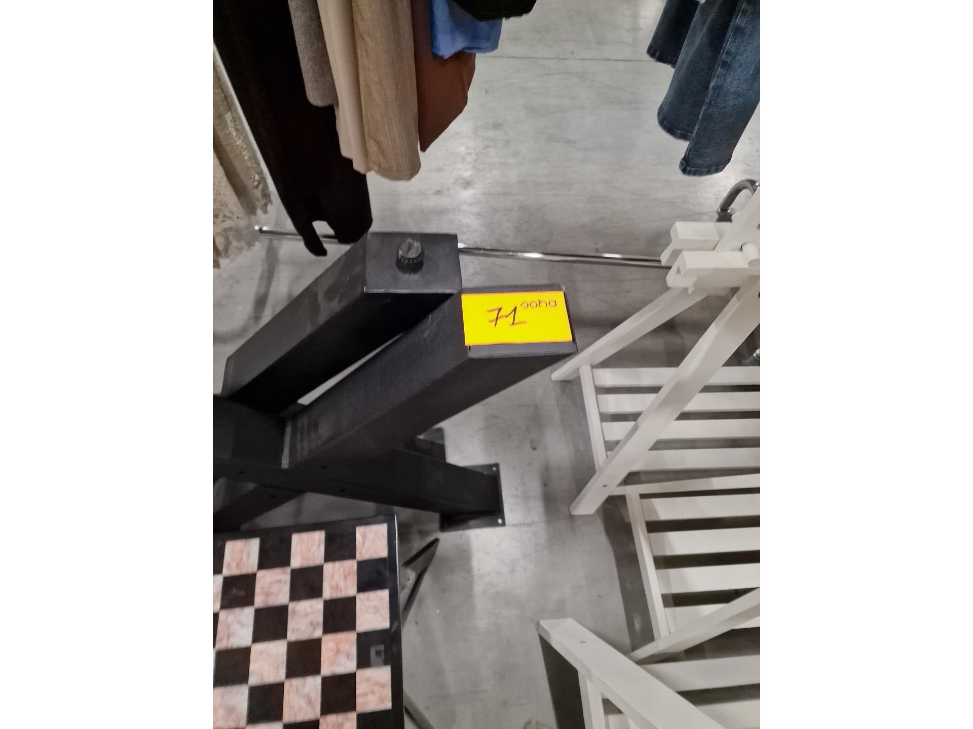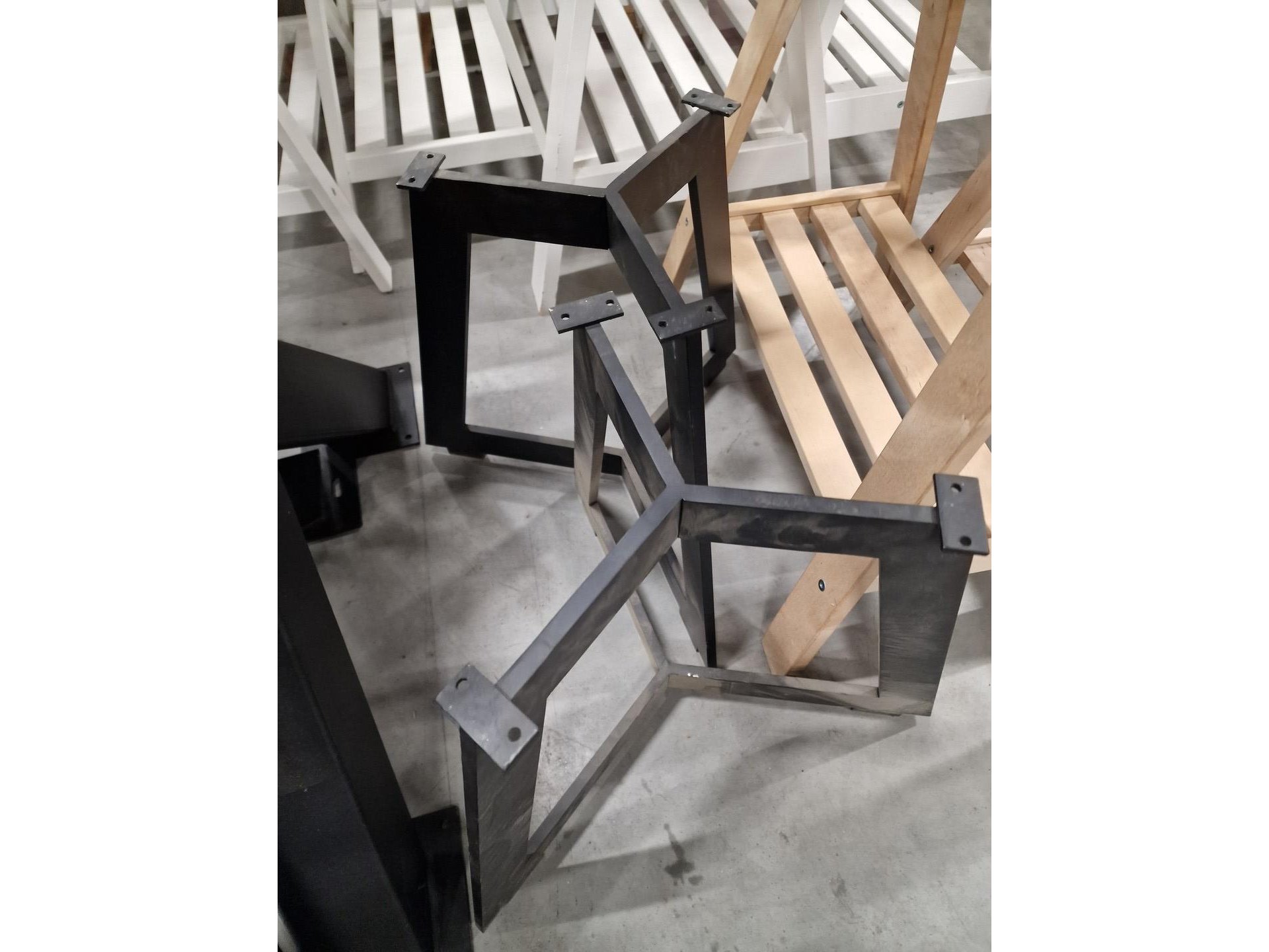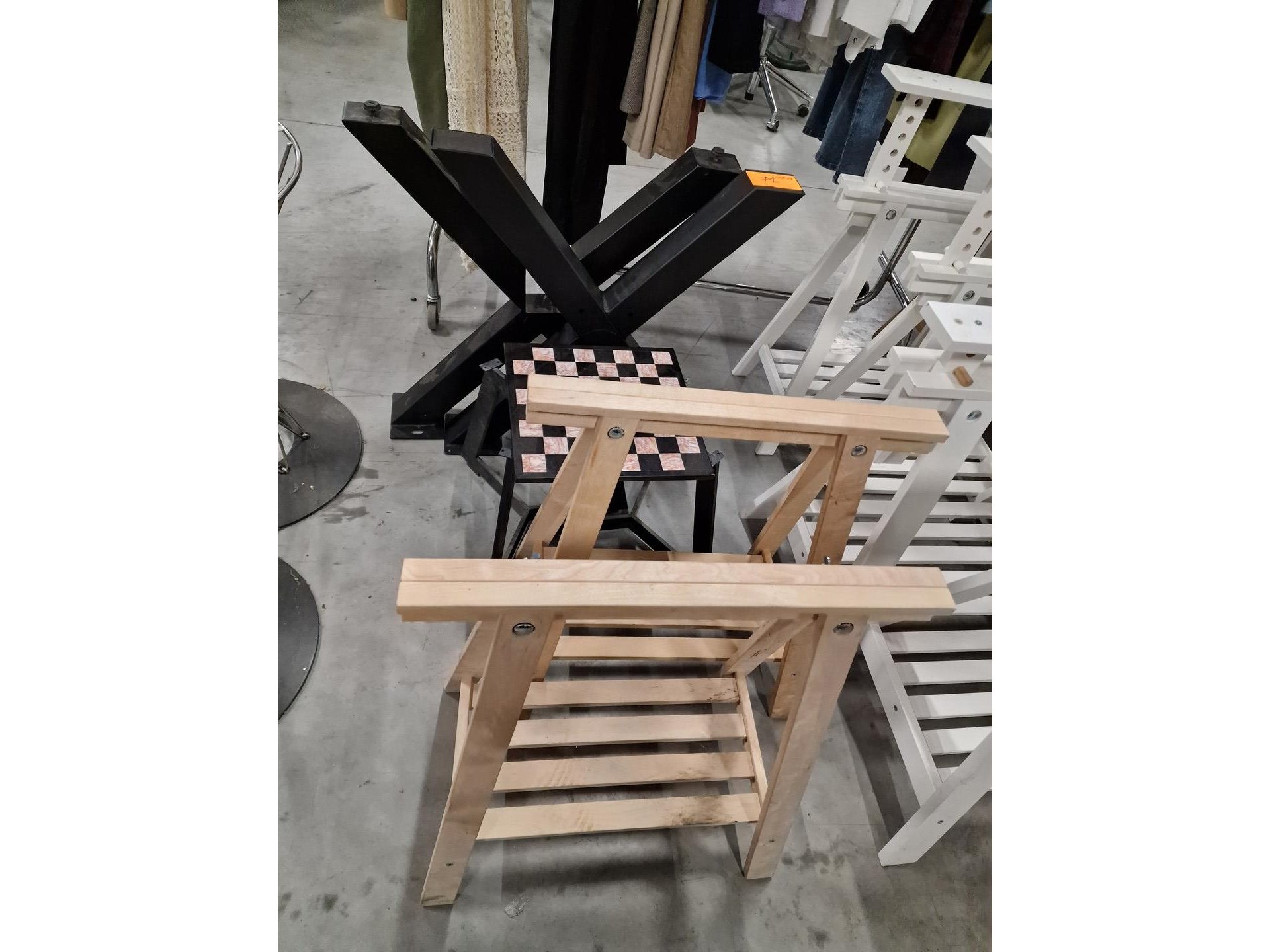 Een paar X-vormige zware zwartmetalen tafelonderstellen, een paar zwartmetalen salontafelonderstellen en 2 naturelkleurige houten schragen