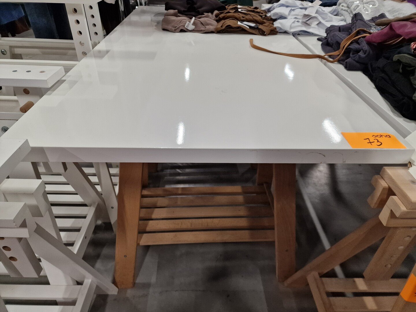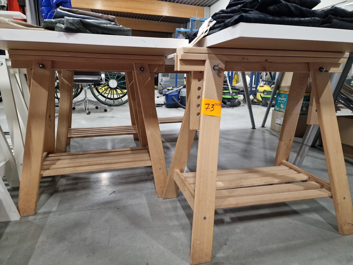 4 houten schragen, in de hoogte verstelbaar + 2 witte tafelbladen, div. afmetingen