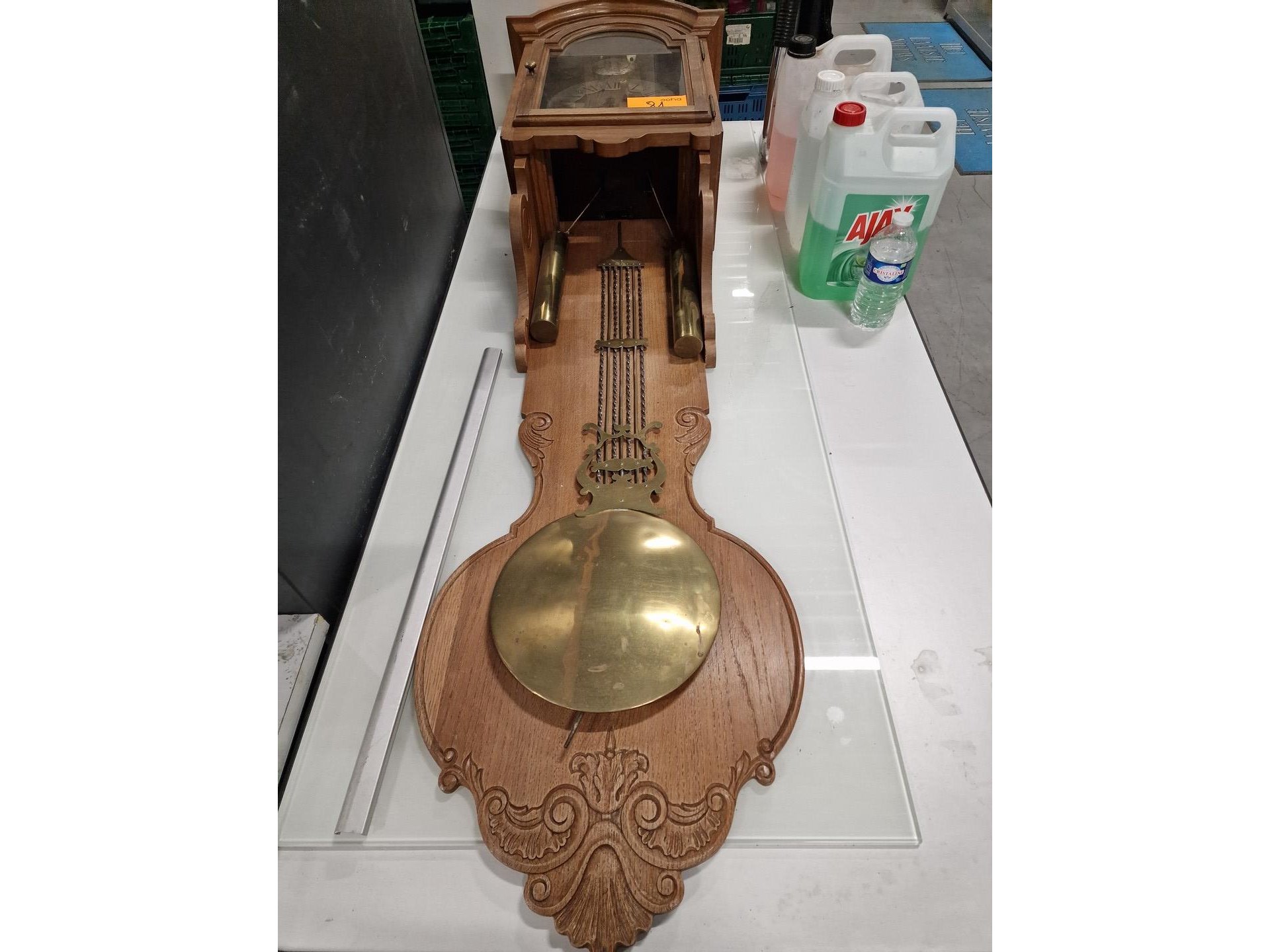 Een antieke Comtoise hangklok, met grote messing slinger en houten behuizing in traditioneel Frans landelijk design, met gewichten