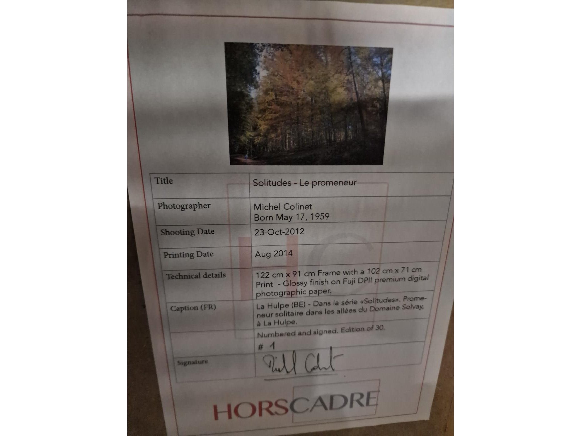 Ingekaderde kunstfoto, 'SOLITUDES - LE PROMENEUR', op de achterzijde geattesteerd, 71x1022 cm print