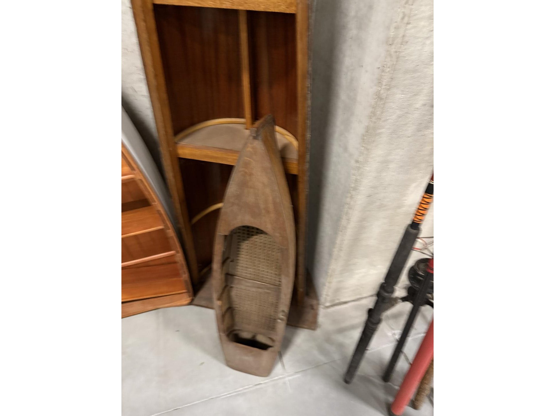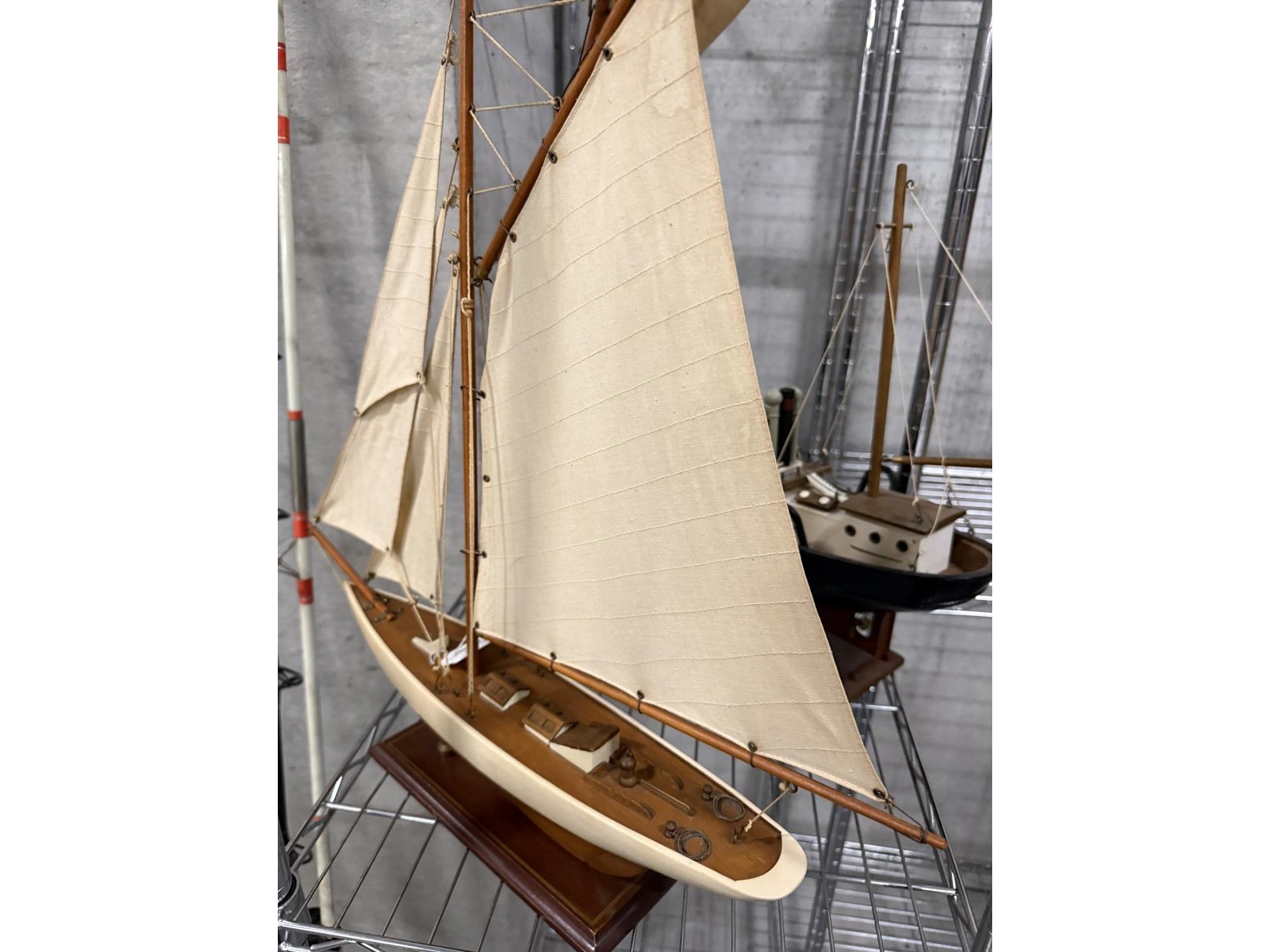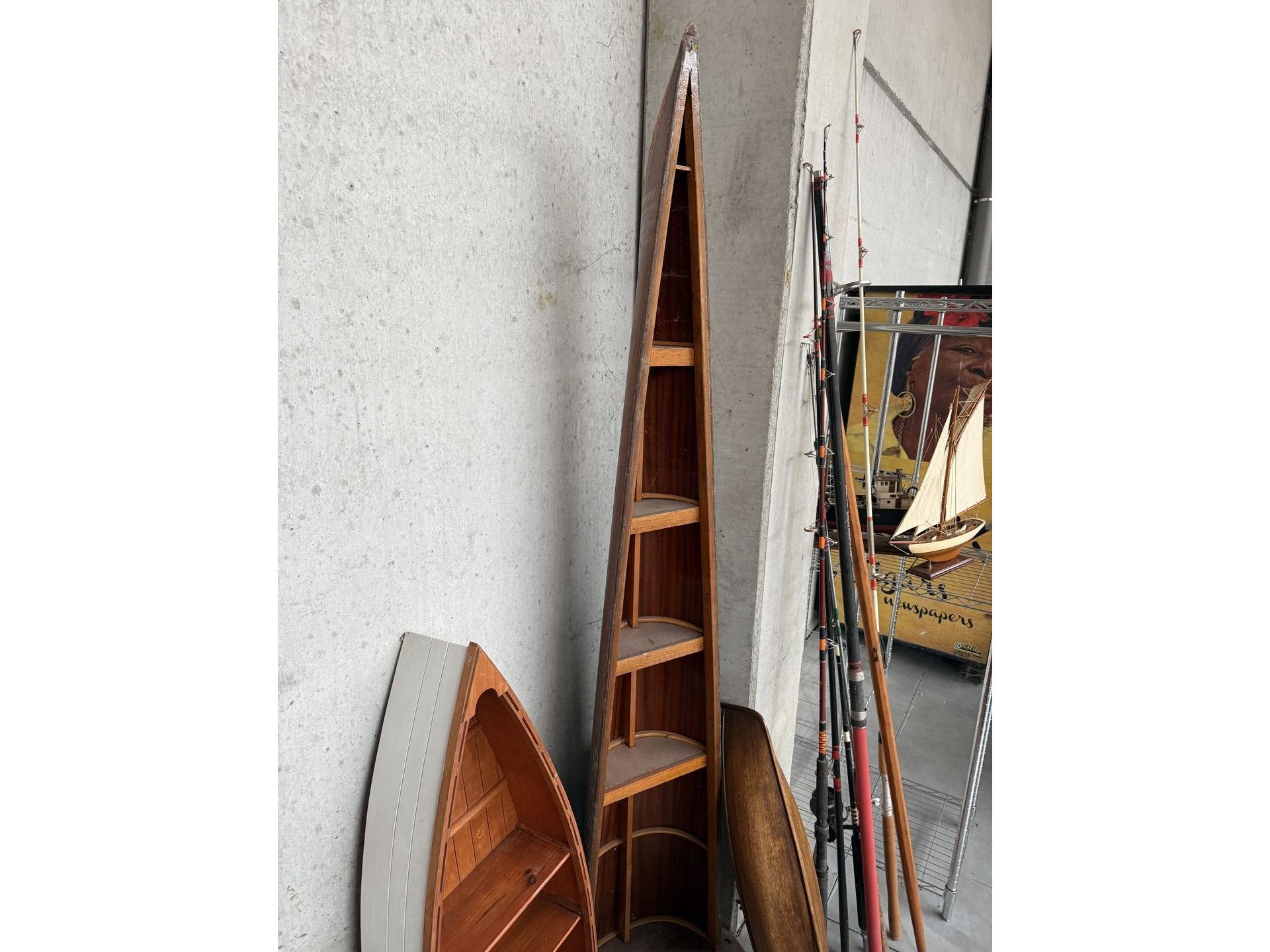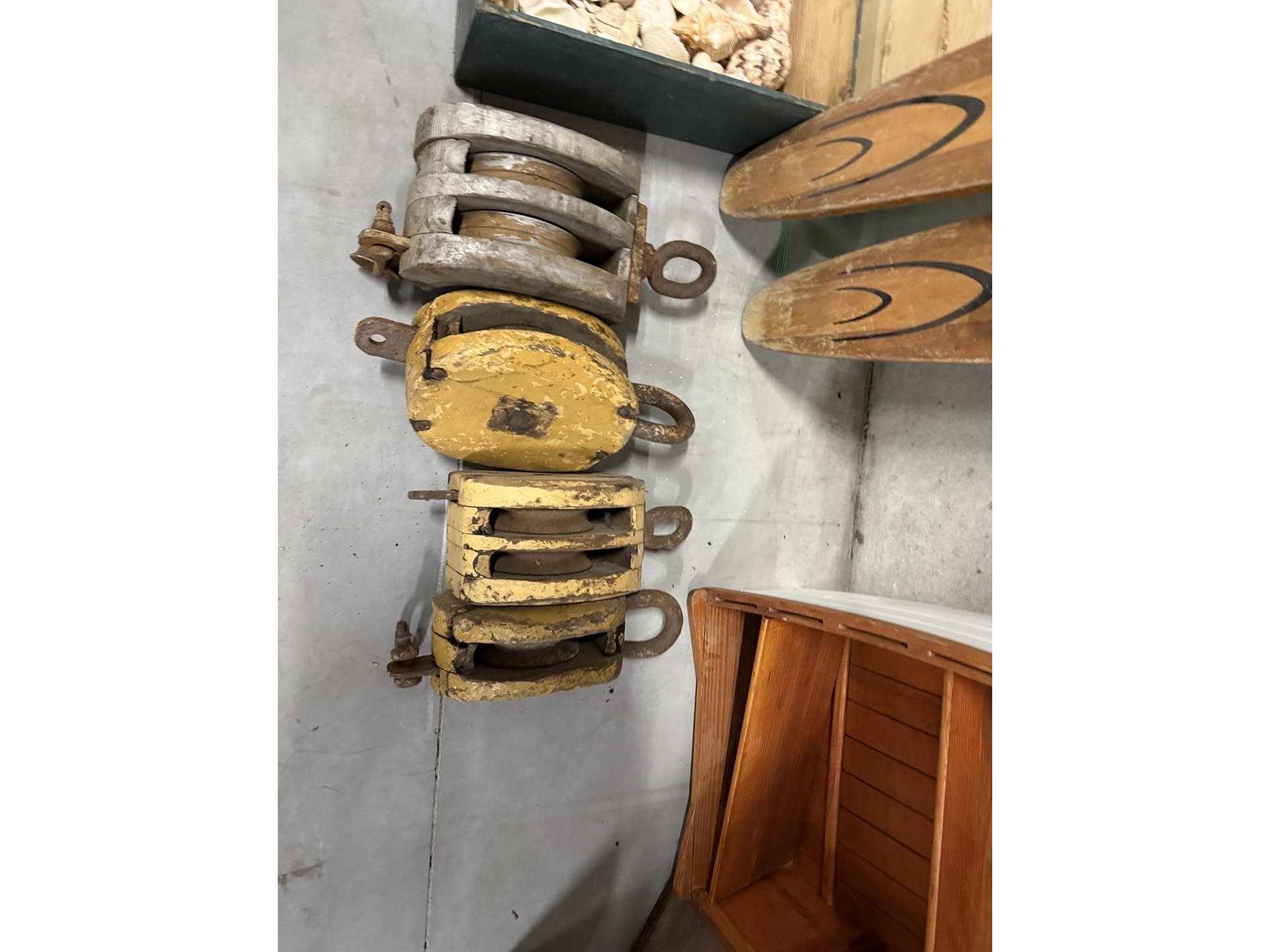 2 miniatuur zeilboten + vislijnen + decoratieve houten sloepen + 4 antieke houten scheepstakels + 2 antieke waterskilatten + houten kist met zeeschelpen