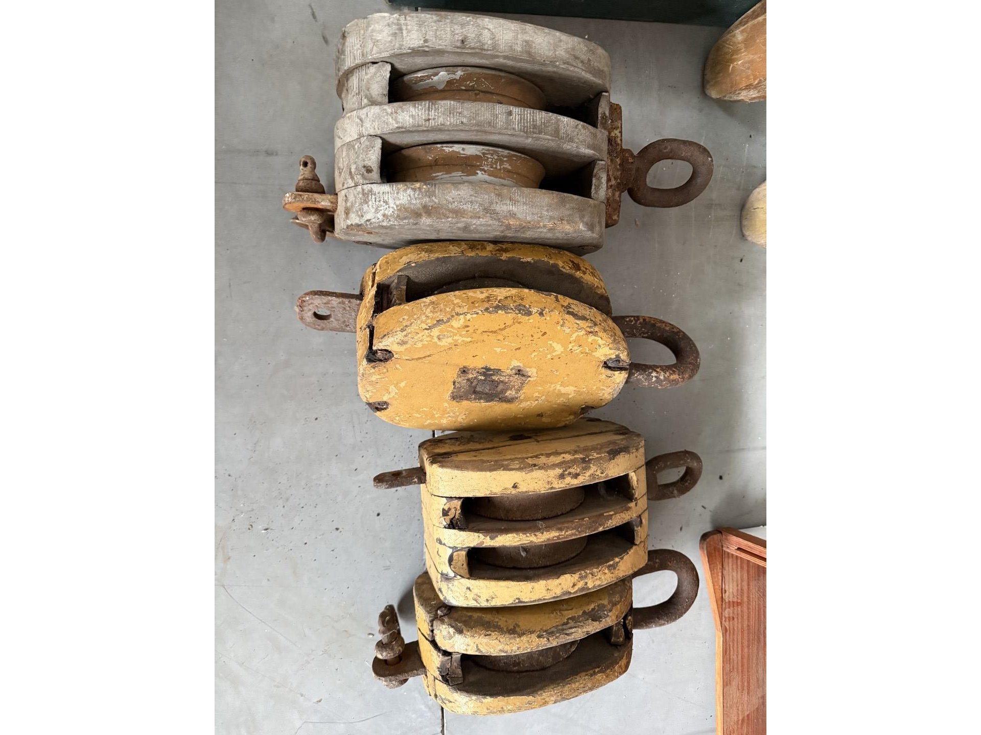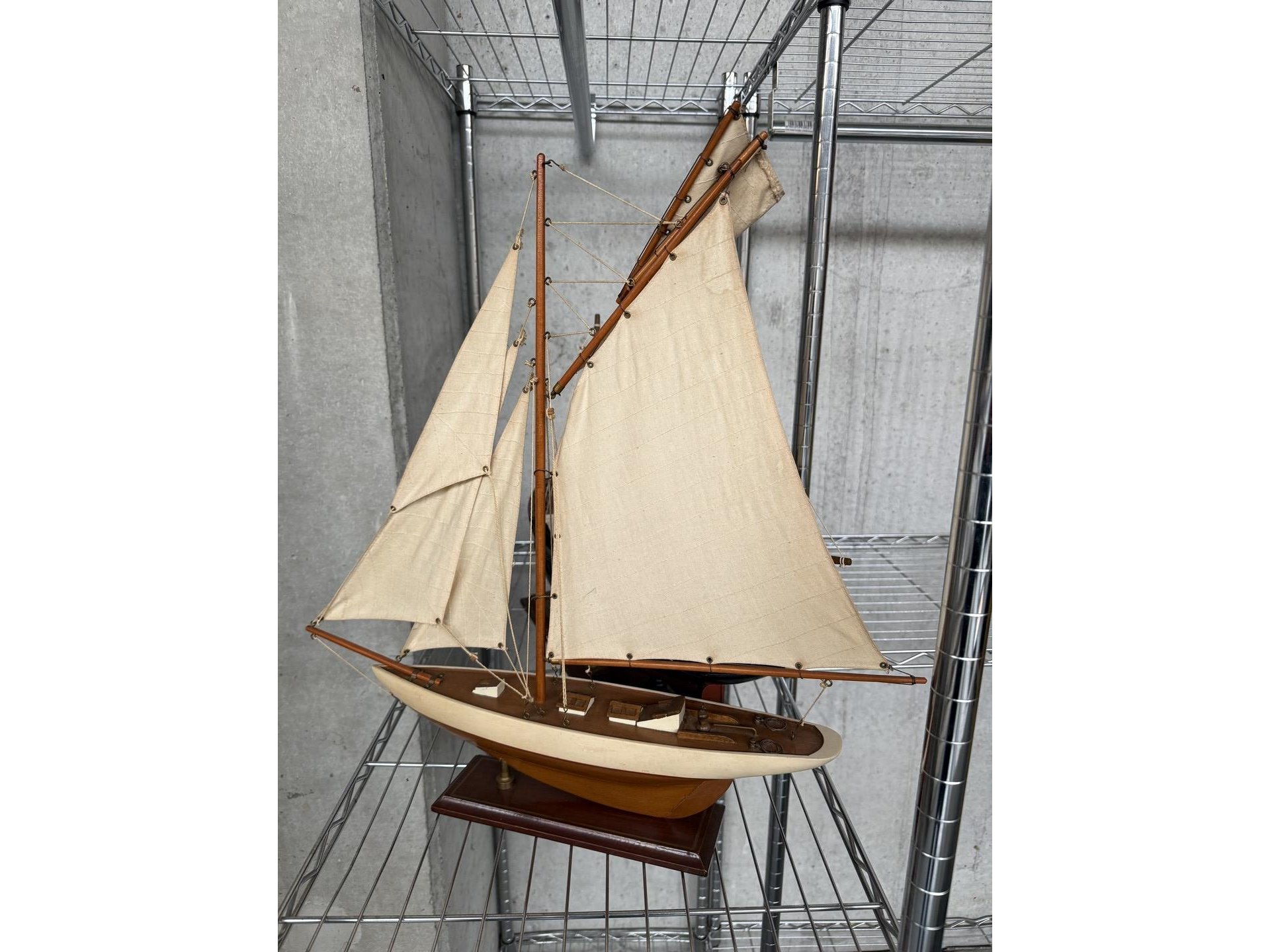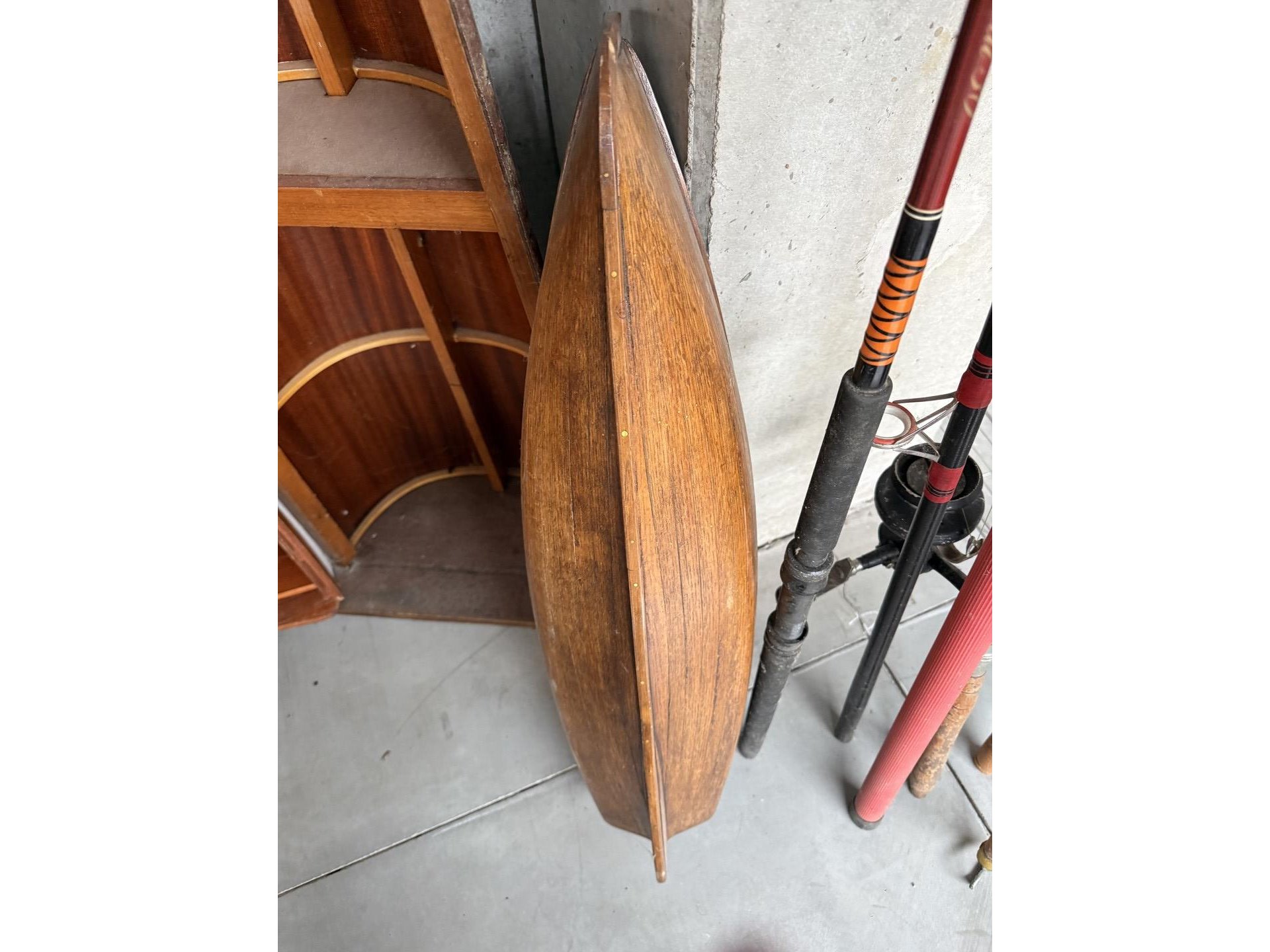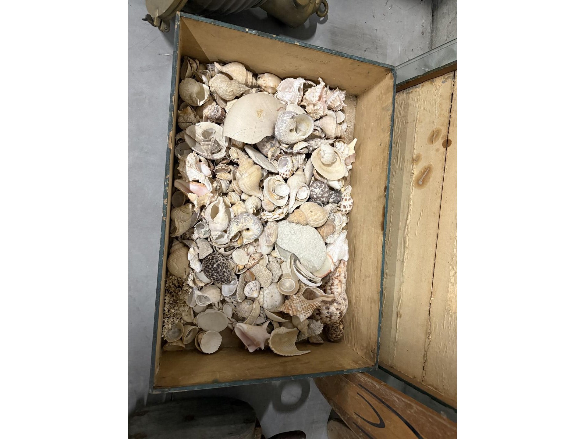 2 miniatuur zeilboten + vislijnen + decoratieve houten sloepen + 4 antieke houten scheepstakels + 2 antieke waterskilatten + houten kist met zeeschelpen