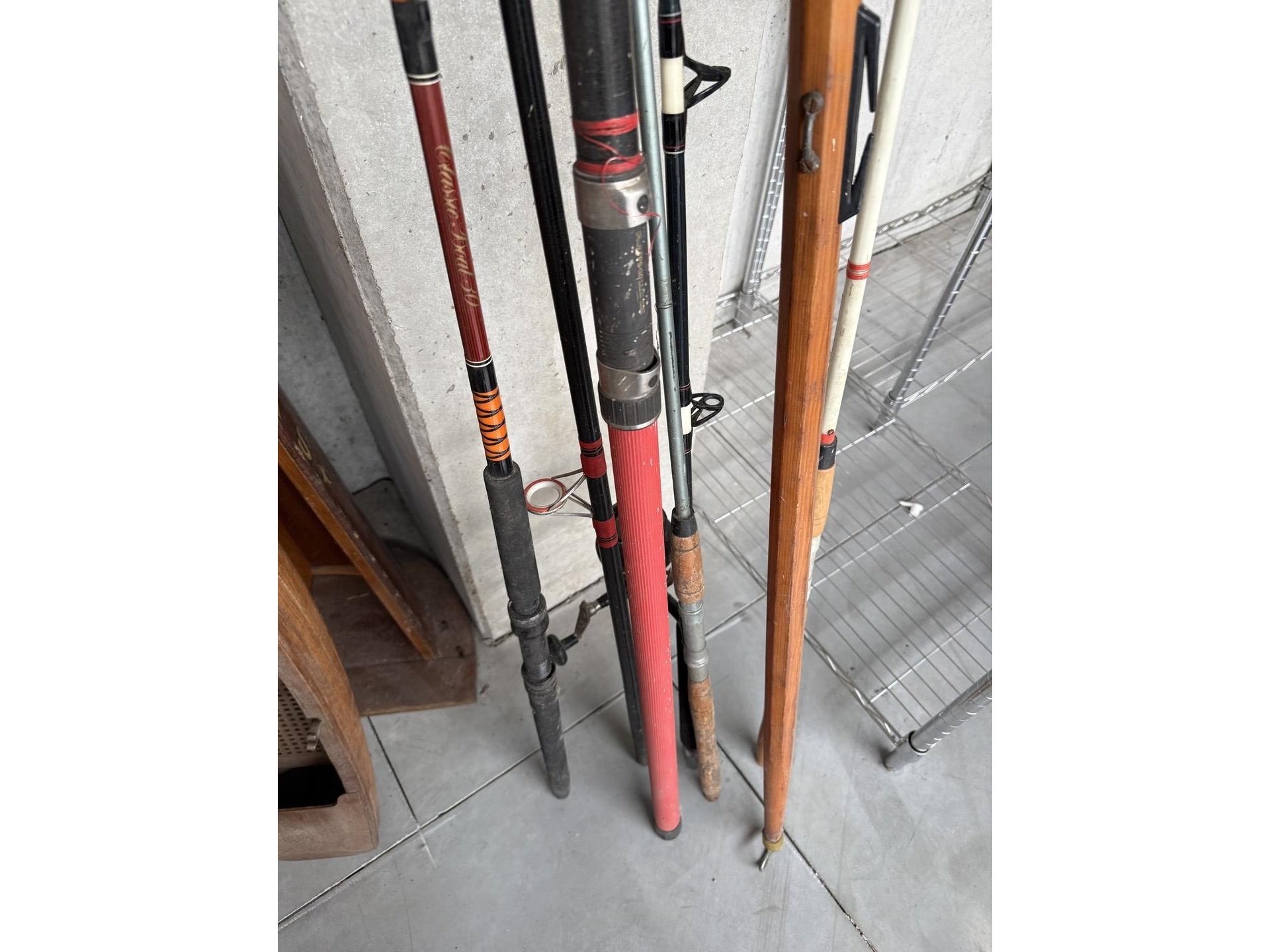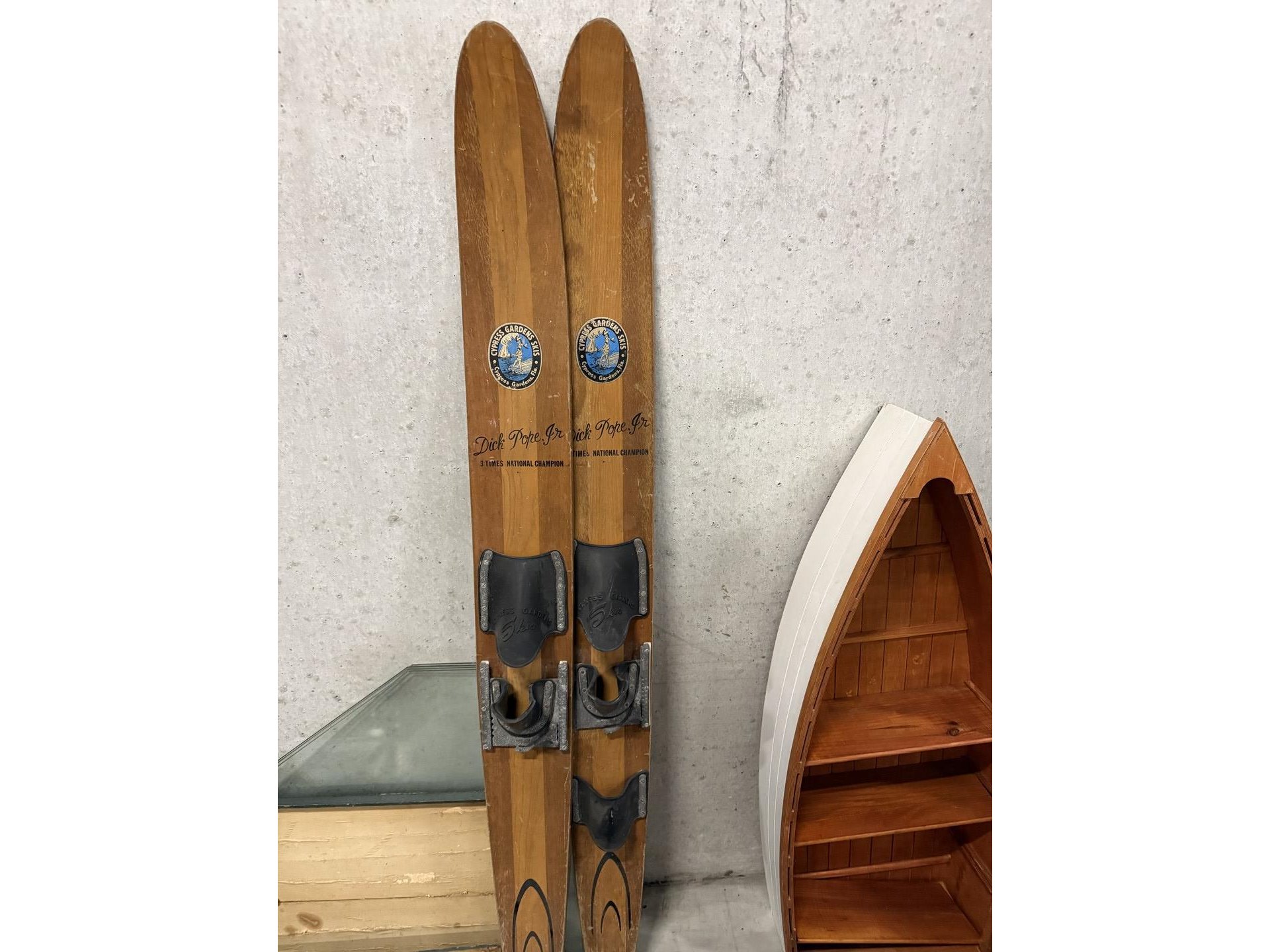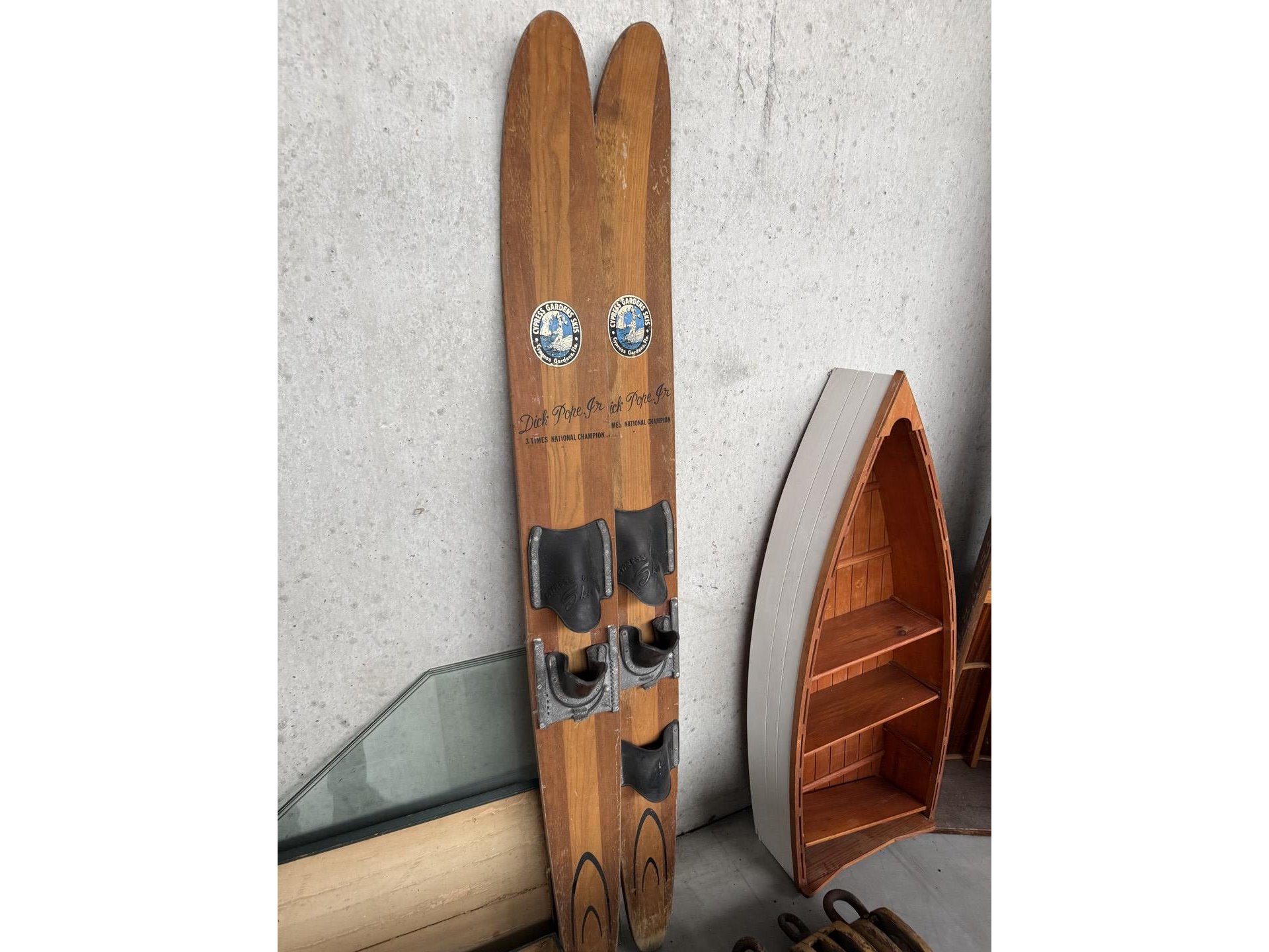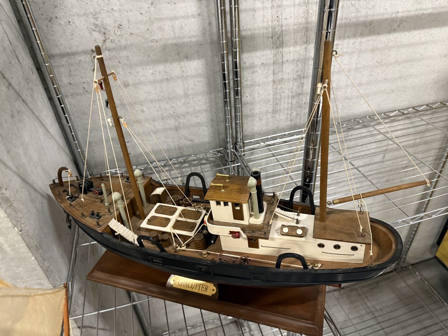 2 miniatuur zeilboten + vislijnen + decoratieve houten sloepen + 4 antieke houten scheepstakels + 2 antieke waterskilatten + houten kist met zeeschelpen