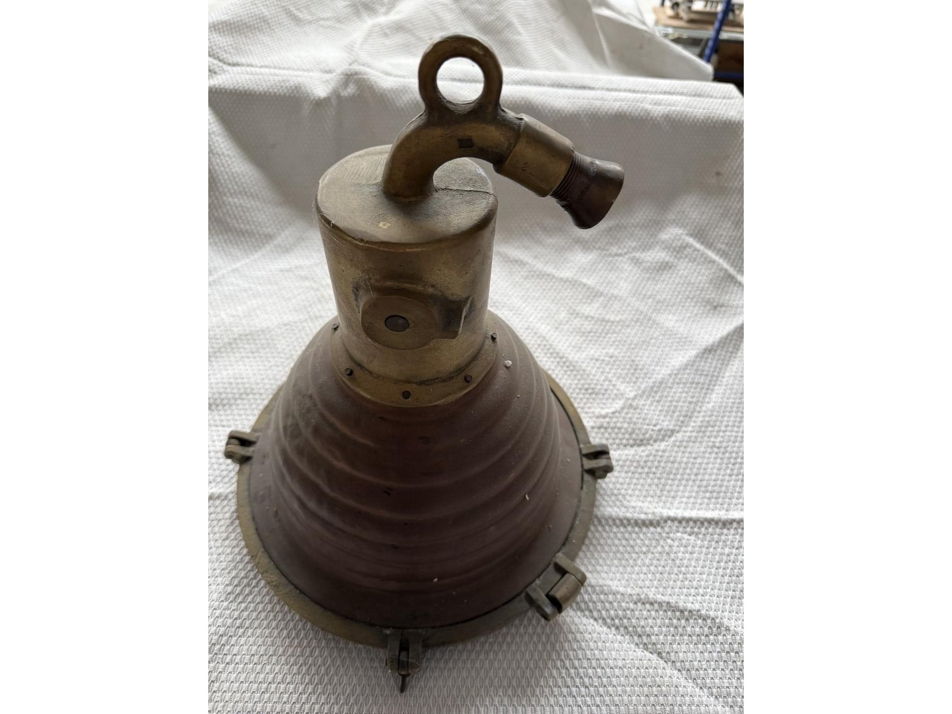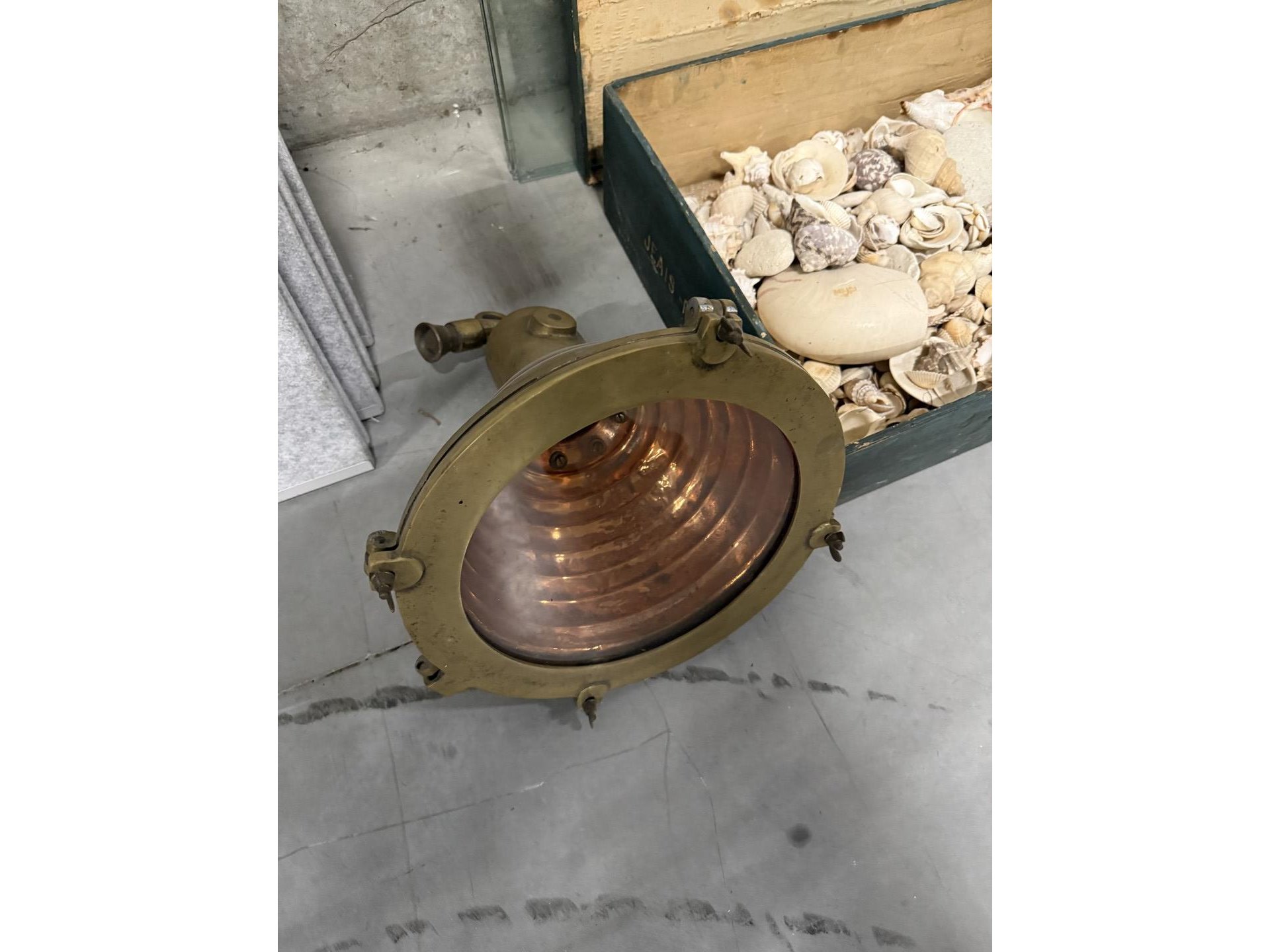 Vintage industriële - nautische lamp, gemaakt van messing (frame) en koperen geribbelde reflector binnenkant