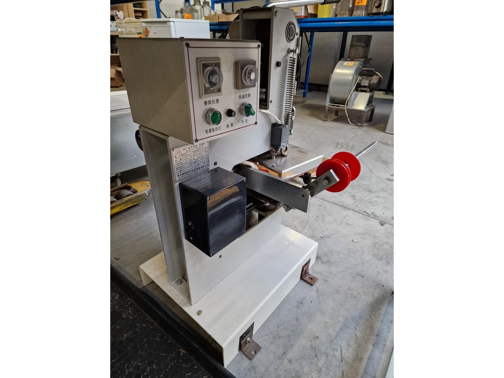 Printpress foliedrukmachine<br /> *merk : HG<br /> *type : MTS 355<br /> *AK : € 2950 <br /> (een machine waarmee je een cliché (bvb magnesium cliché) op bevestigt, dit wordt opgewarmd en dmv deze warmte kan een folie overgezet worden op een ander materiaal, bv. Papier. De temperatuur is manueel te regelen, folie wordt automatisch op en afgerold met regelbare interval, het tafelblad is in de hoogte verstelbaar)