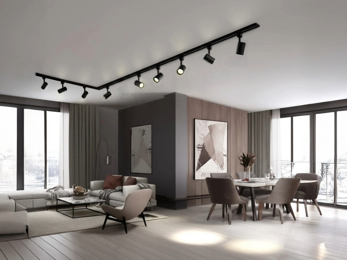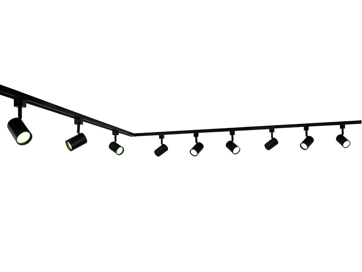 4 x 1 stuk 100cm en 1 stuk 200cm rail - materiaal aluminium - bevestiging inclusief - 220-240V - afdichting IP20 - 1 stuk door verbinder en 1 stuk L verbinding inclusief - product kleur zand zwart - 9 stuk railspots GU10 armatuur afm. Ø 55 x 102mm draaibaar 350° en kantelbaar 90° materiaal aluminum kop en kunstof basis - bulb niet inbegrepen - de rail kan eenvoudig op de gewenste lengte worden gezaagd - geschikt voor binnen - SKU 825 SKU 827 SKU 905 SKU 907 SKU 1121
